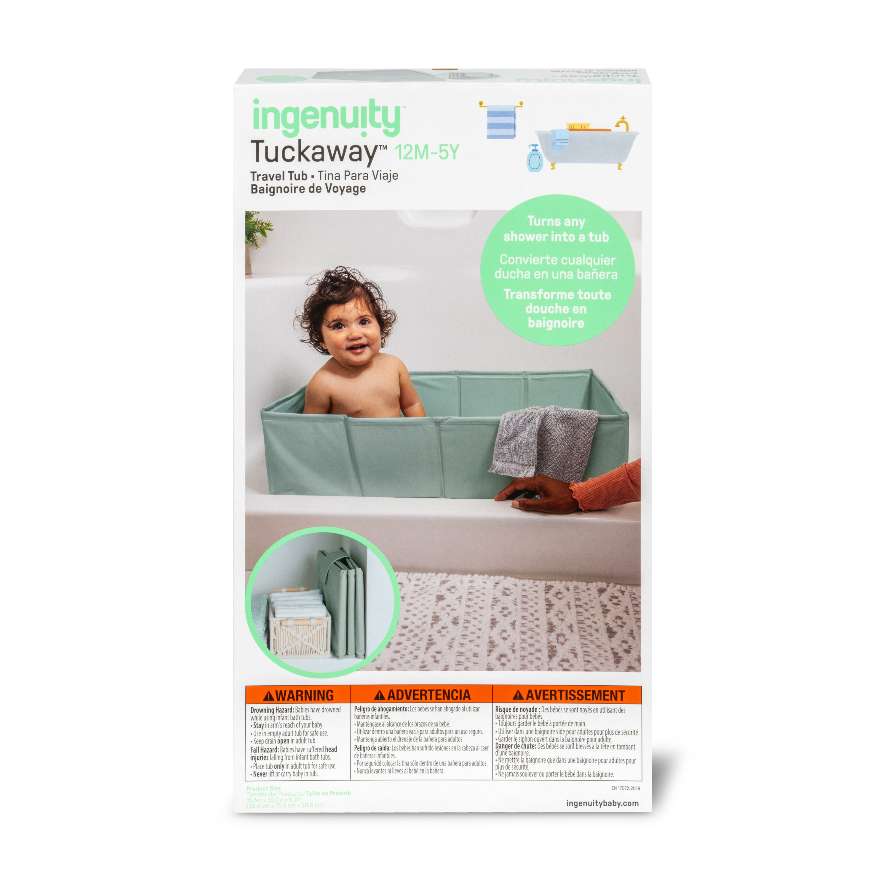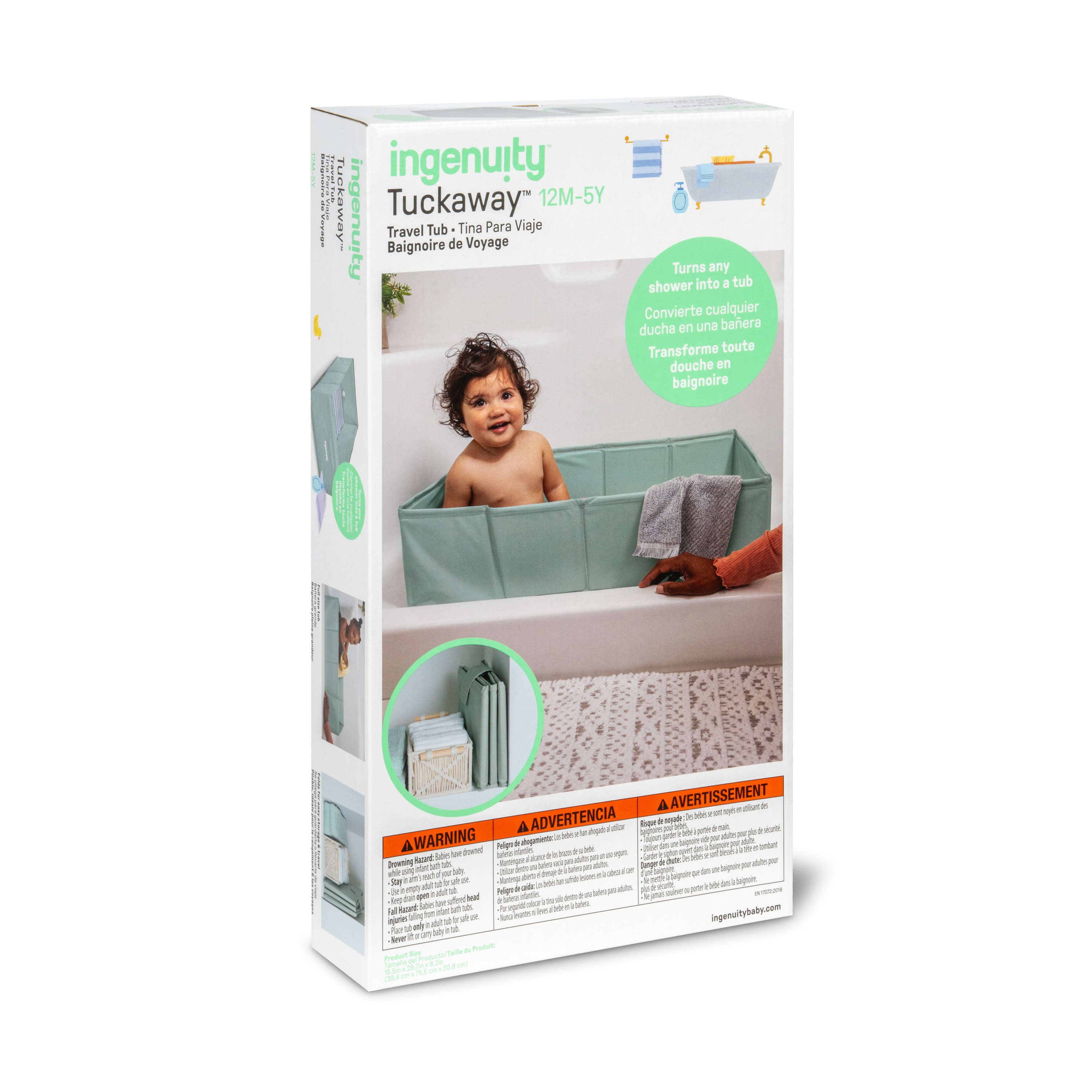 - Turn any shower into a toddler-friendly bathtub with the Ingenuity® Tuckaway™ Toddler Tub. Whether you’re at home, at grandma’s, or exploring the world, this portable baby bath is designed to give your child a safe, comfy space to soak, splash, and get squeaky clean. Compact, foldable, and lightweight, it’s one of those baby travel essentials you’ll wonder how you ever lived without.