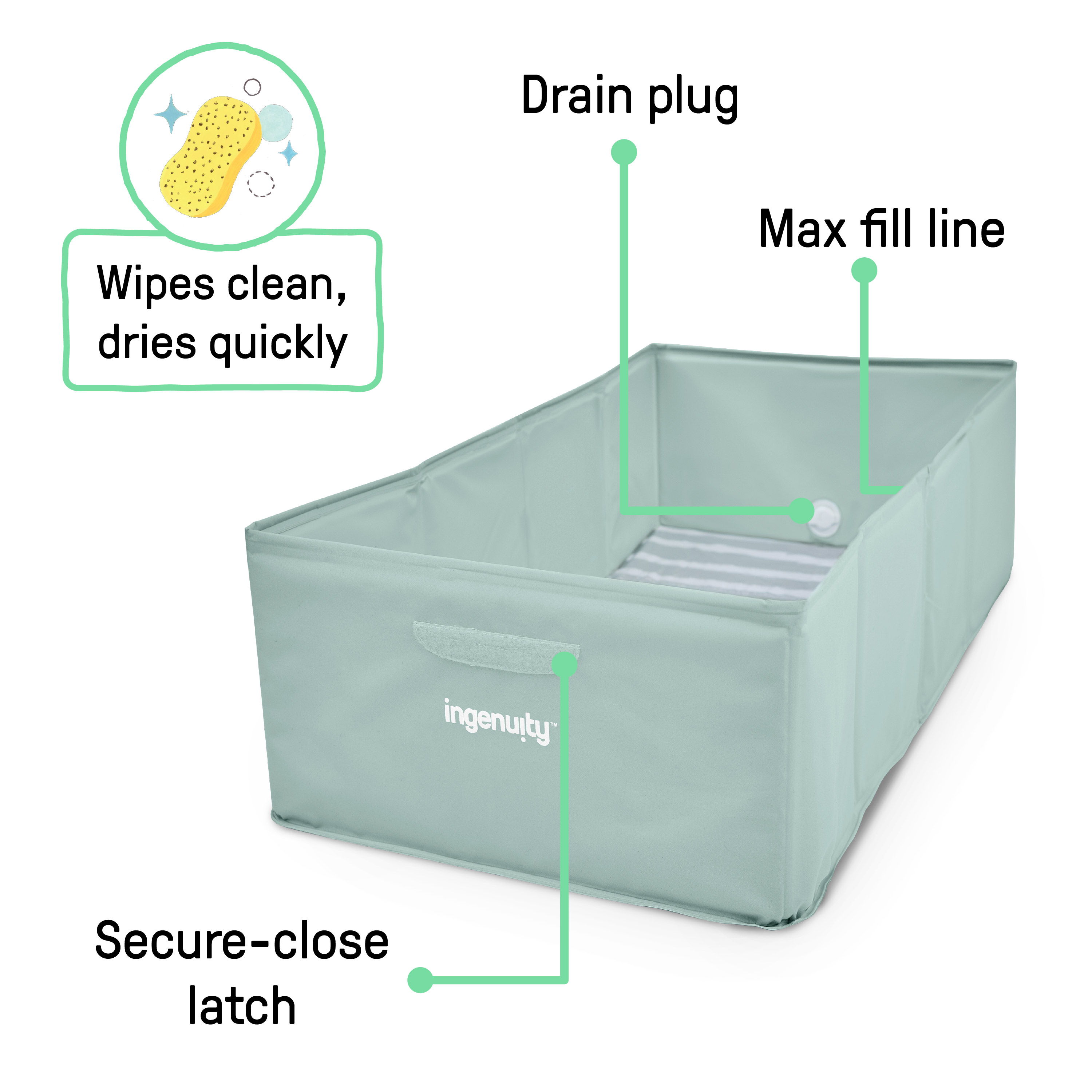 - Parents will love the thoughtful details: a max fill line to help keep water levels safe, a drain plug for quick emptying, and a waterproof lining that wipes clean and dries fast. When bath time is done, fold it down and reclaim your shower in seconds.
