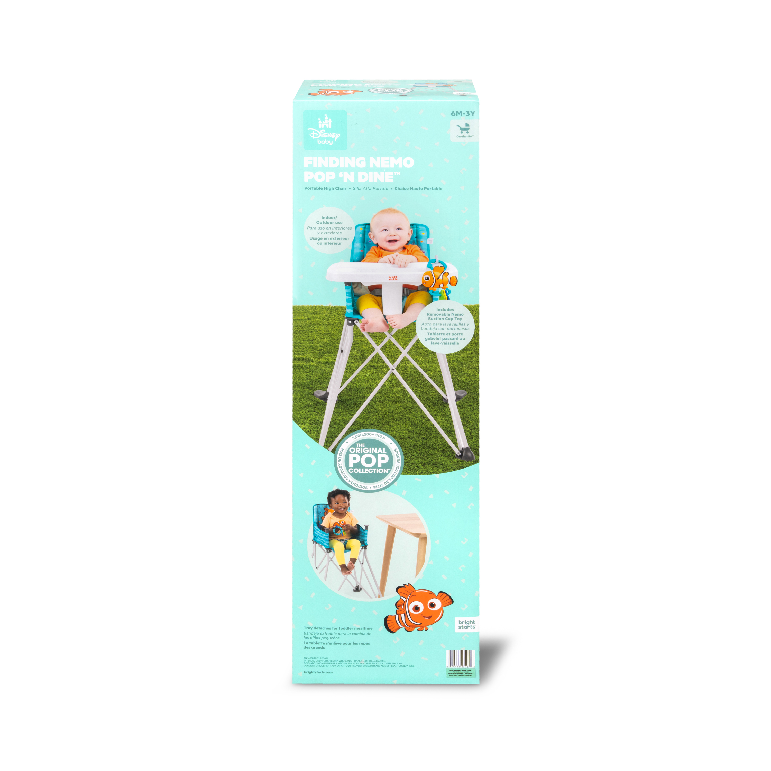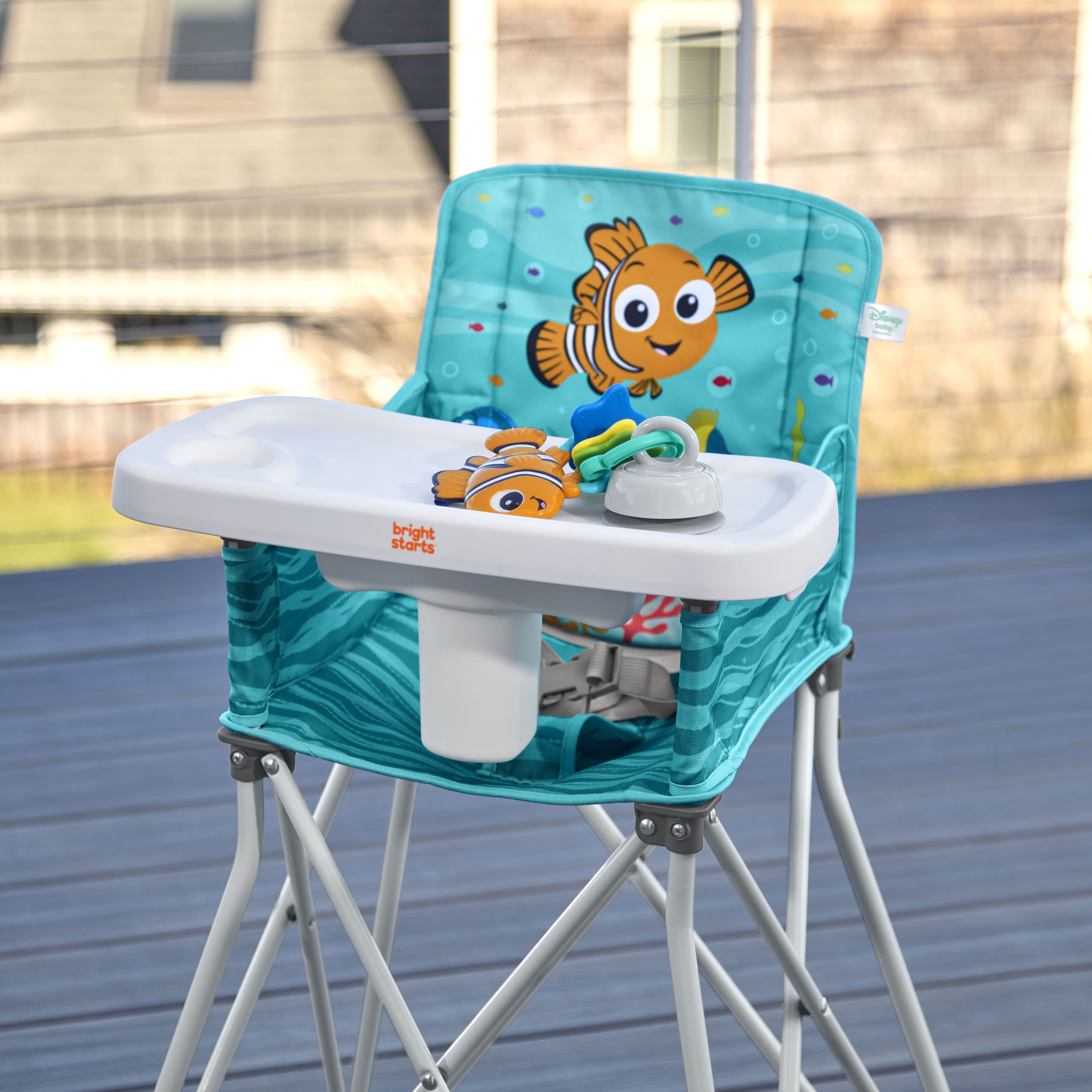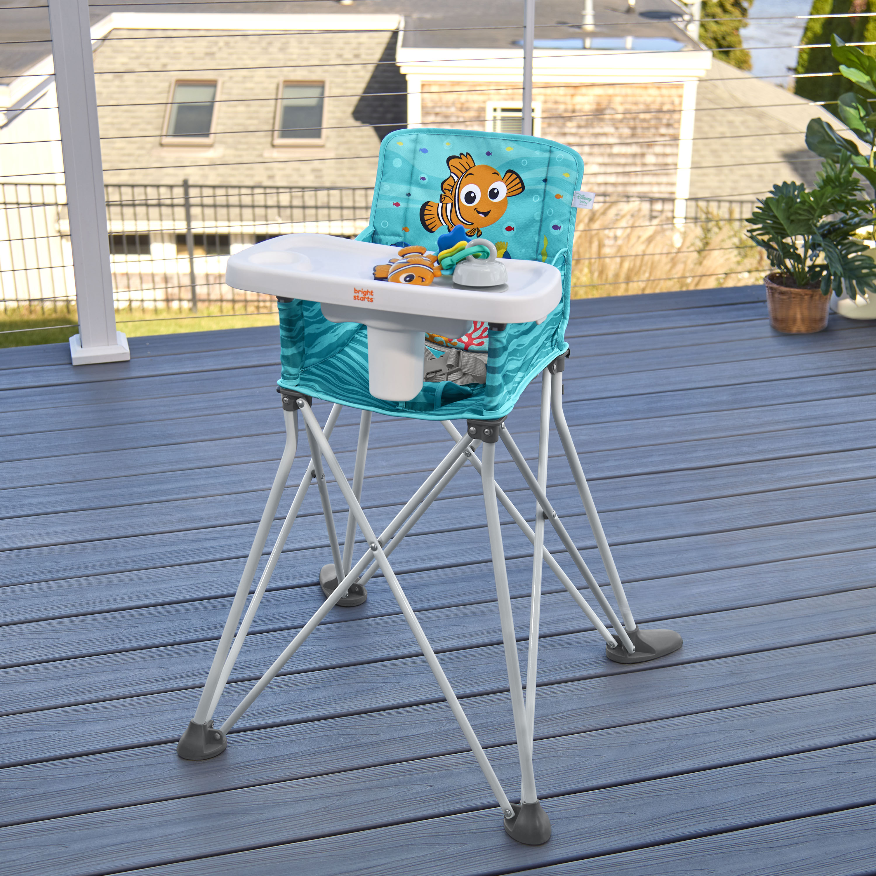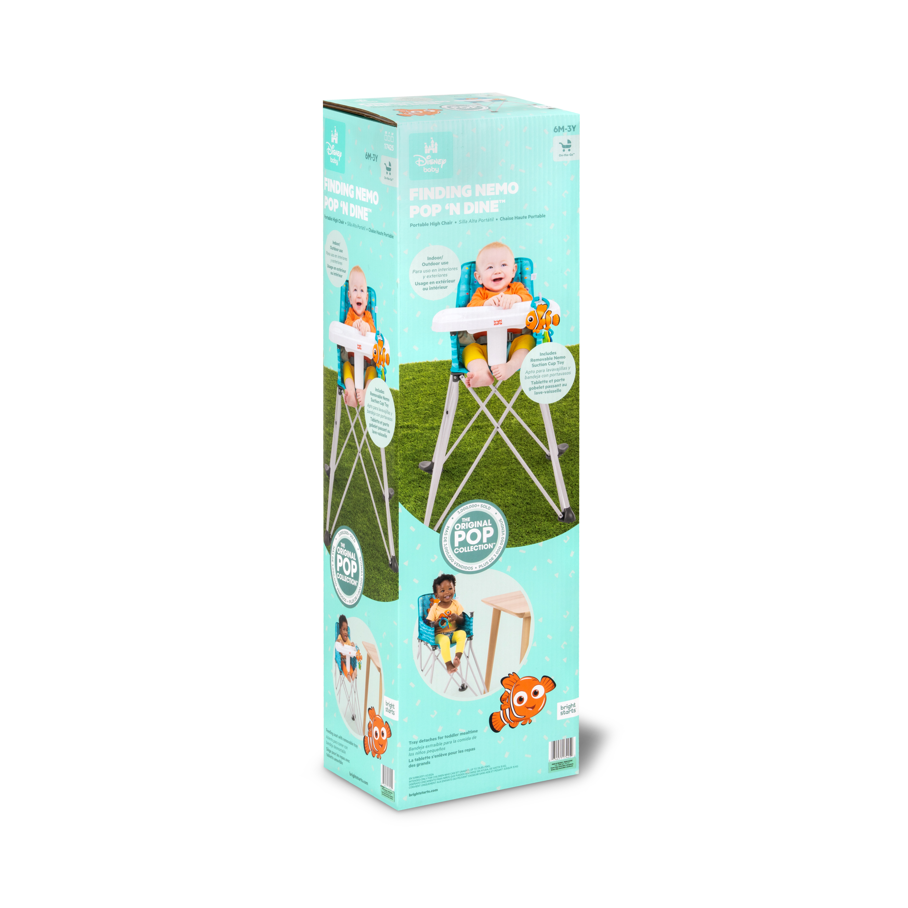 - Disney Baby Finding Nemo Pop ‘N Dine portable high chair makes on-the-go mealtime a breeze, from restaurants to the backyard to family travels; made for indoor/outdoor use