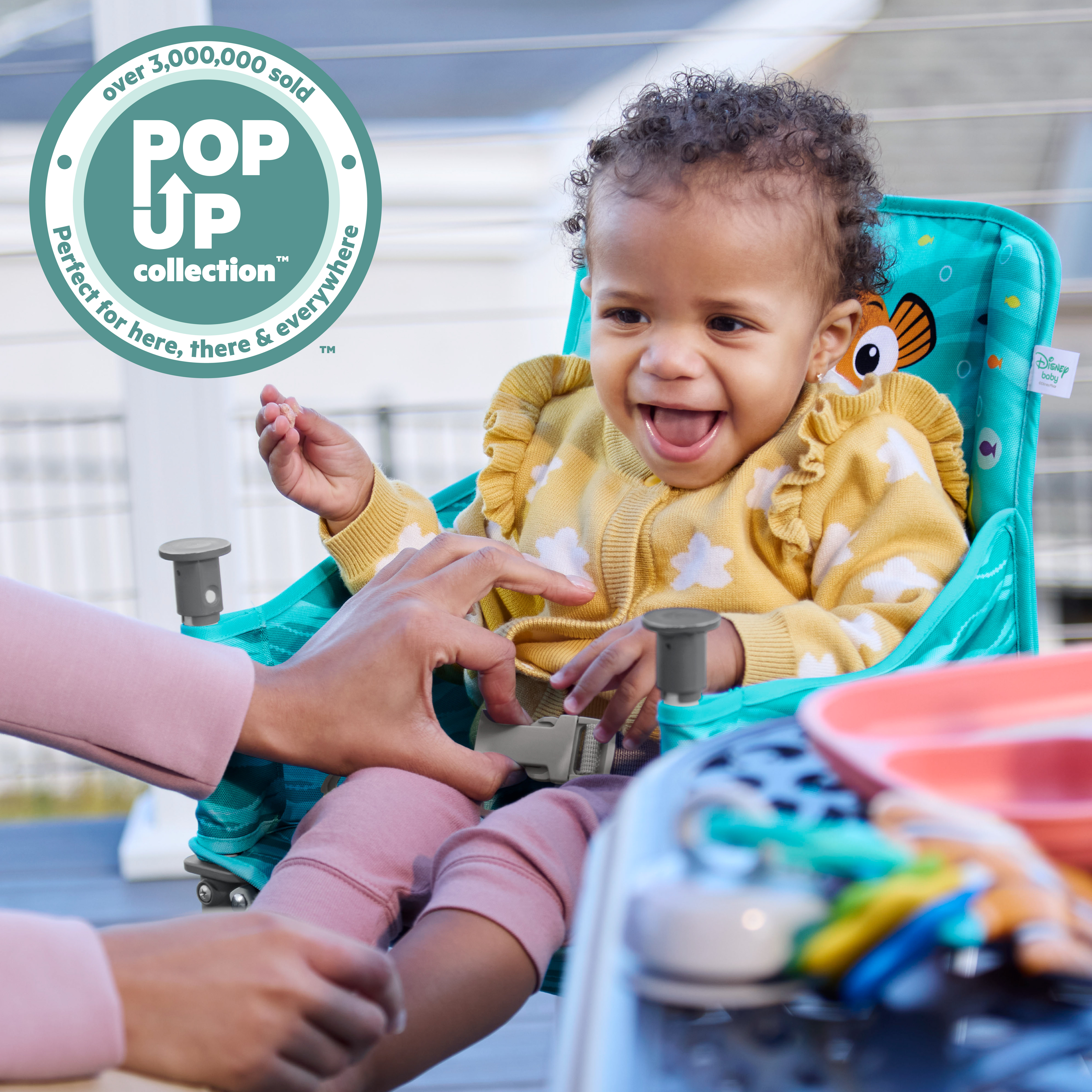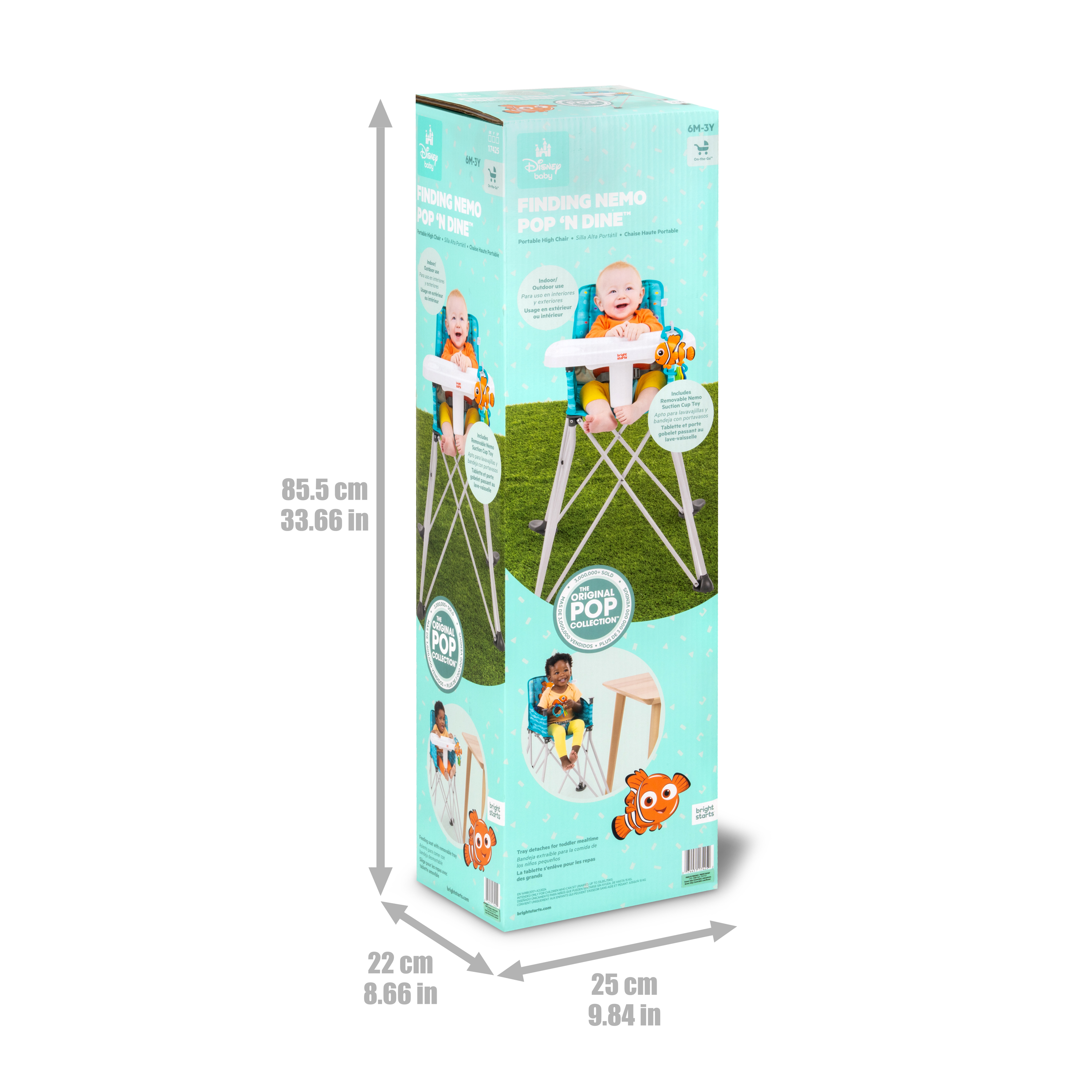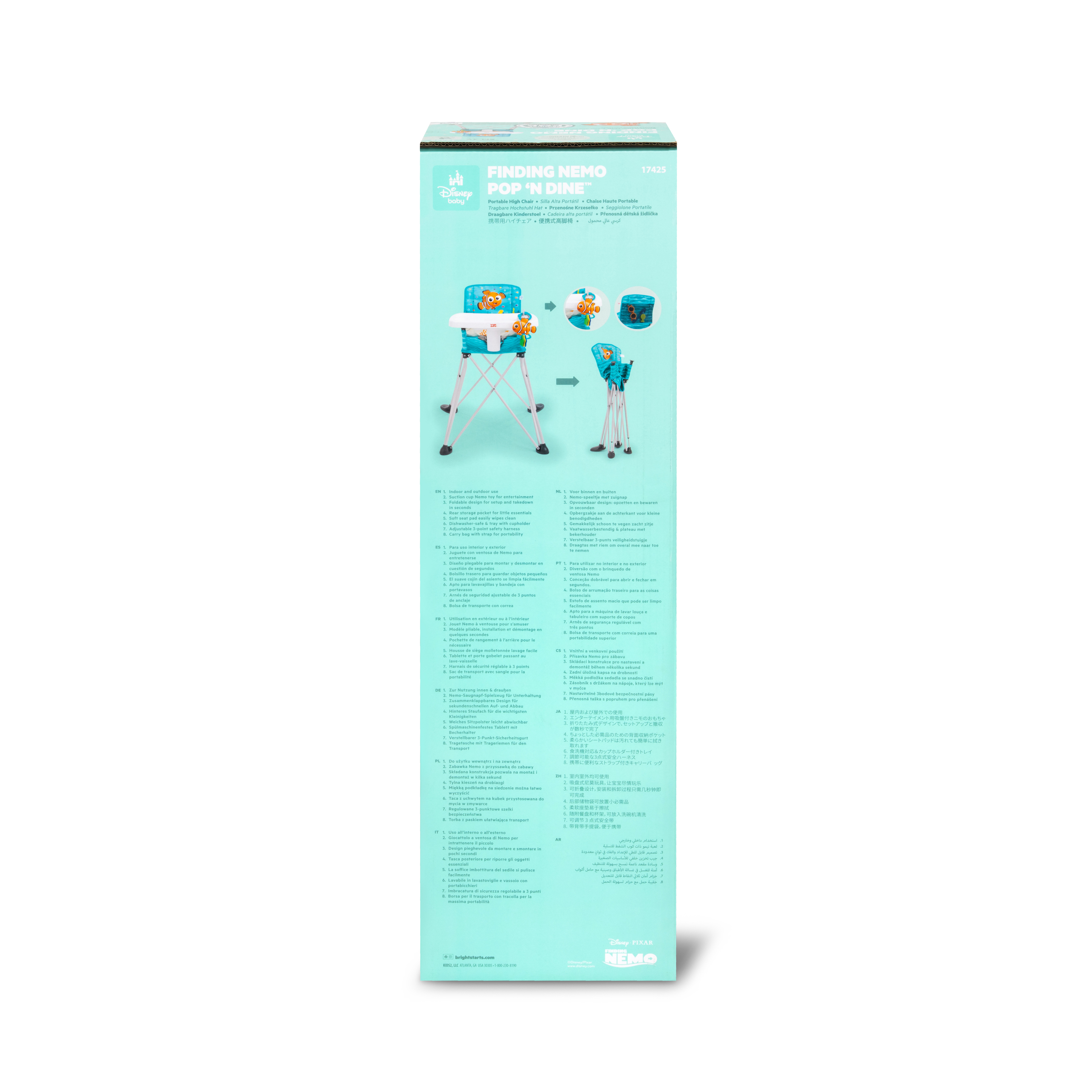 - Disney Baby Finding Nemo Pop ‘N Dine portable high chair makes on-the-go mealtime a breeze, from restaurants to the backyard to family travels; made for indoor/outdoor use