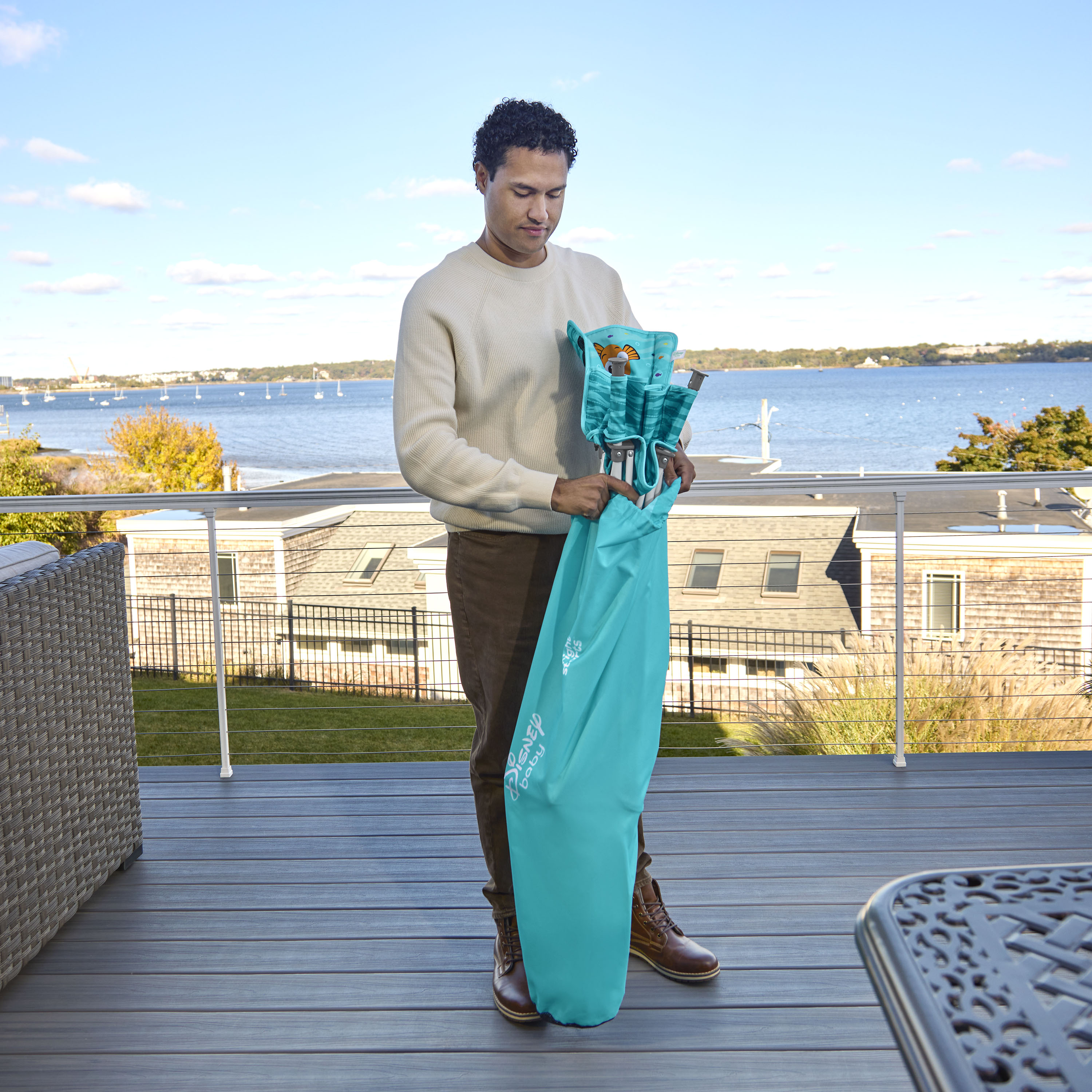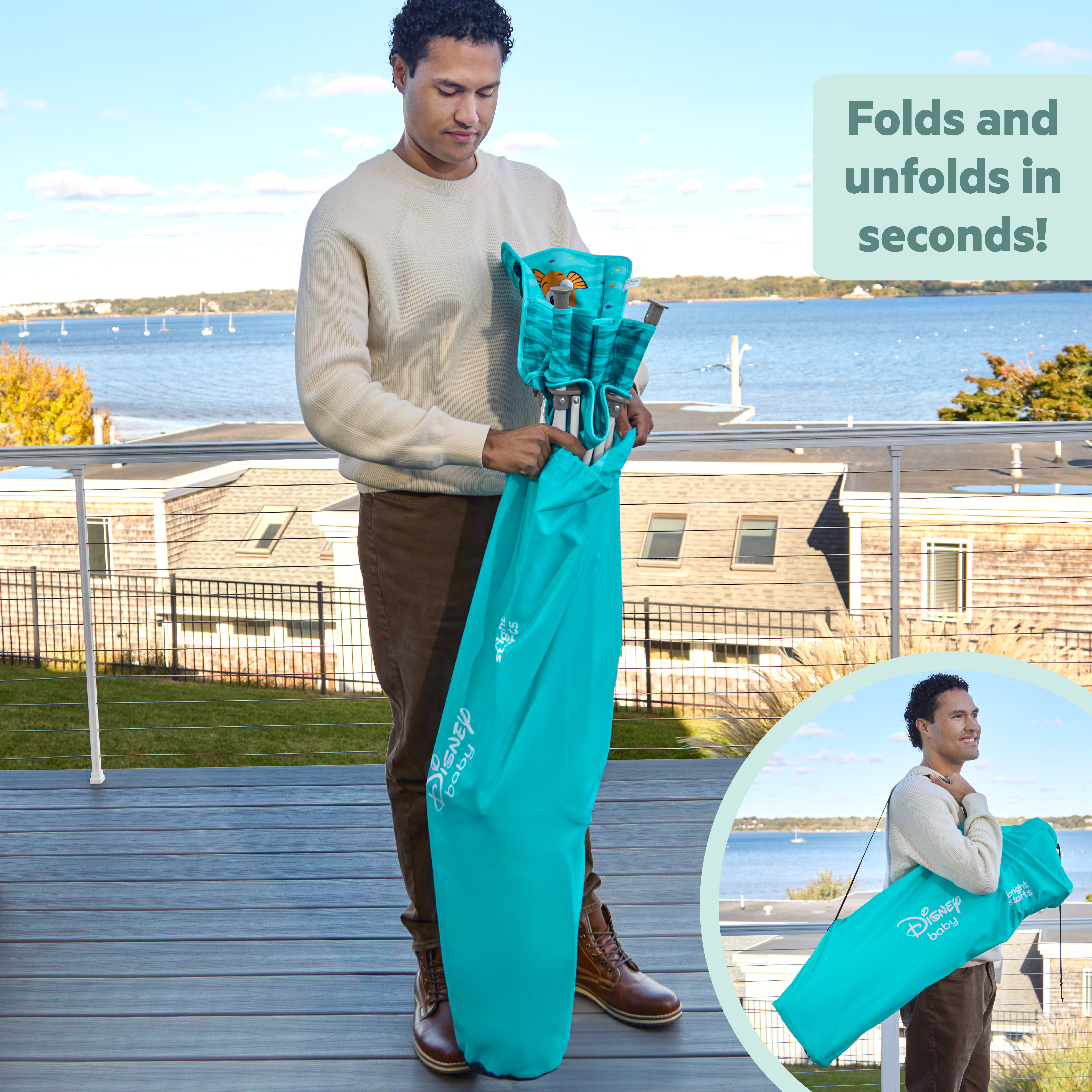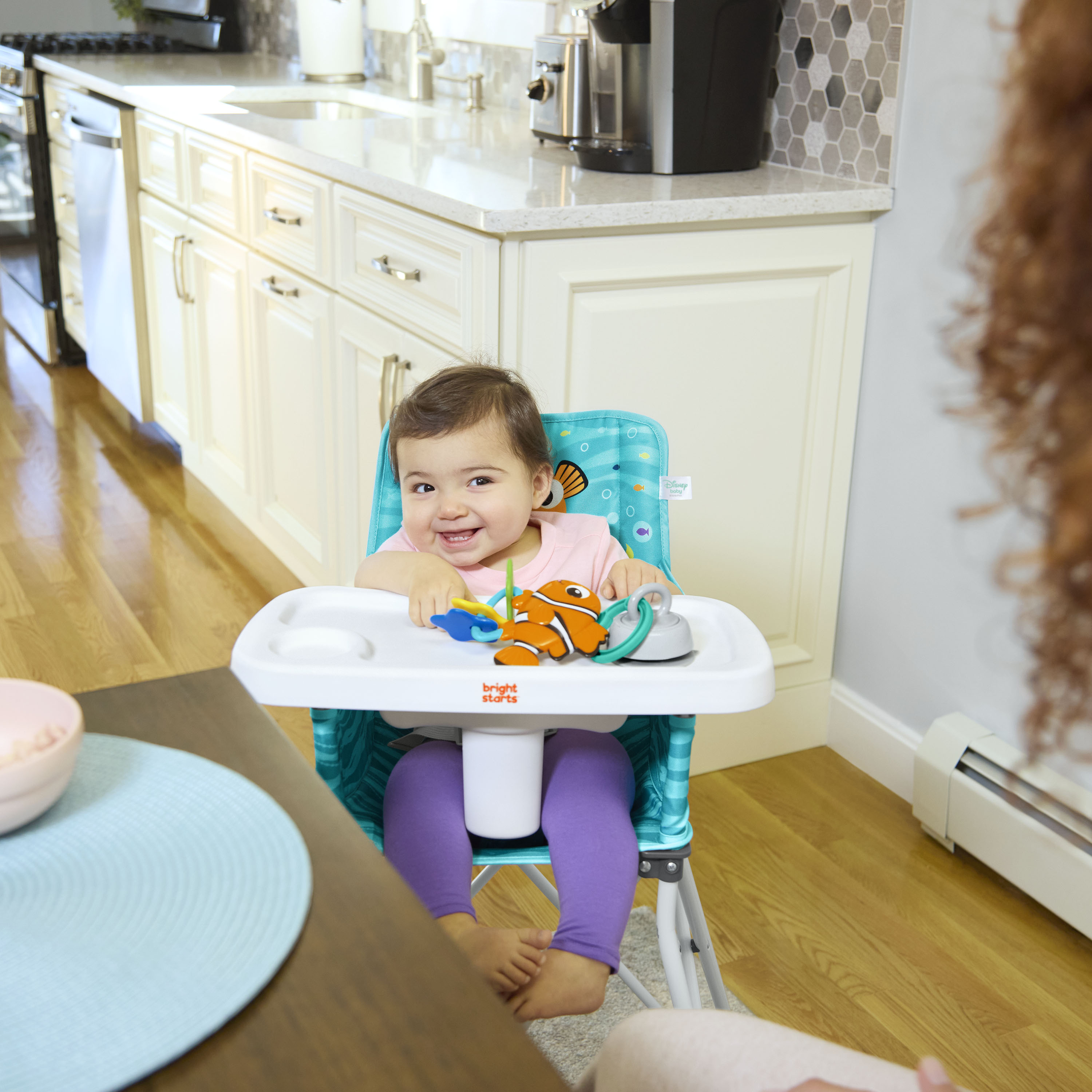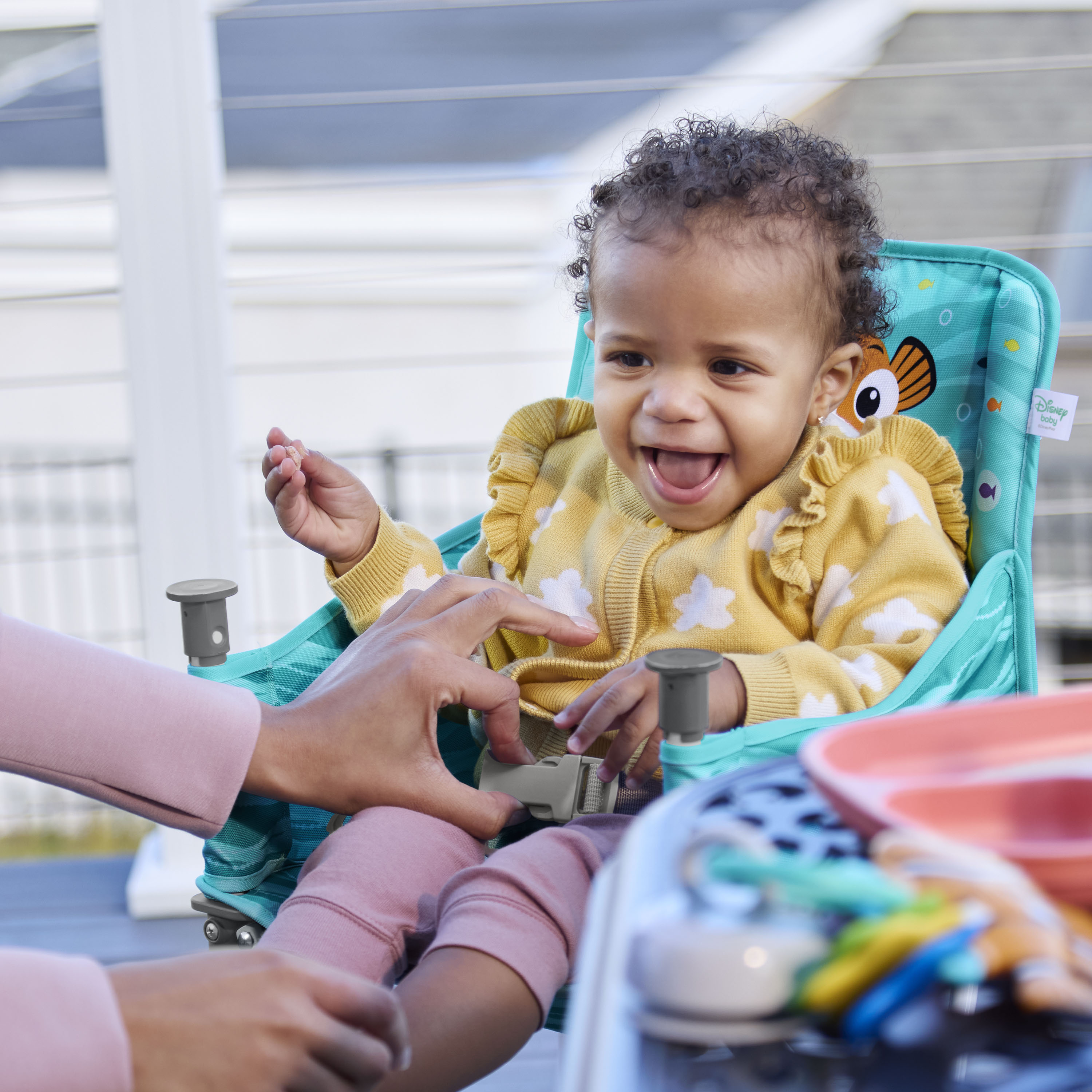 - Disney Baby Finding Nemo Pop ‘N Dine portable high chair makes on-the-go mealtime a breeze, from restaurants to the backyard to family travels; made for indoor/outdoor use
