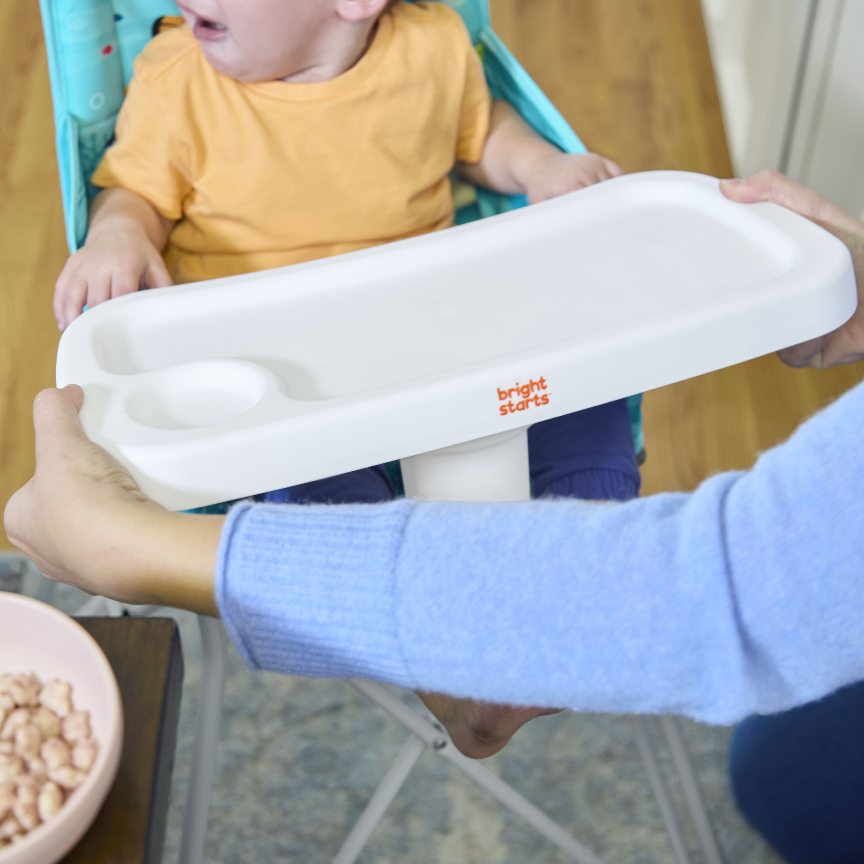 - When mealtime gets messy, cleanup is quick and easy thanks to the wipe-clean fabric and dishwasher-safe tray with cup holder