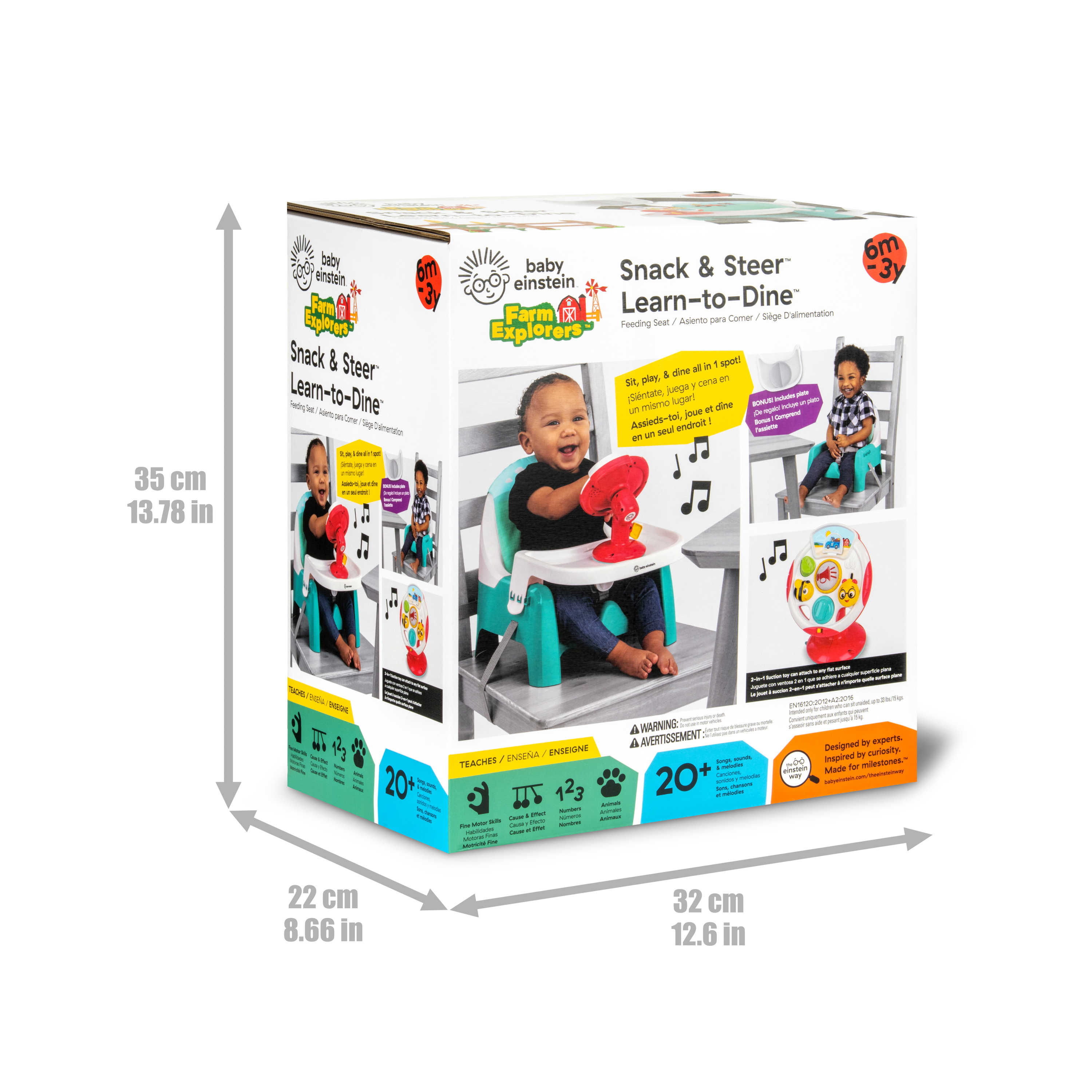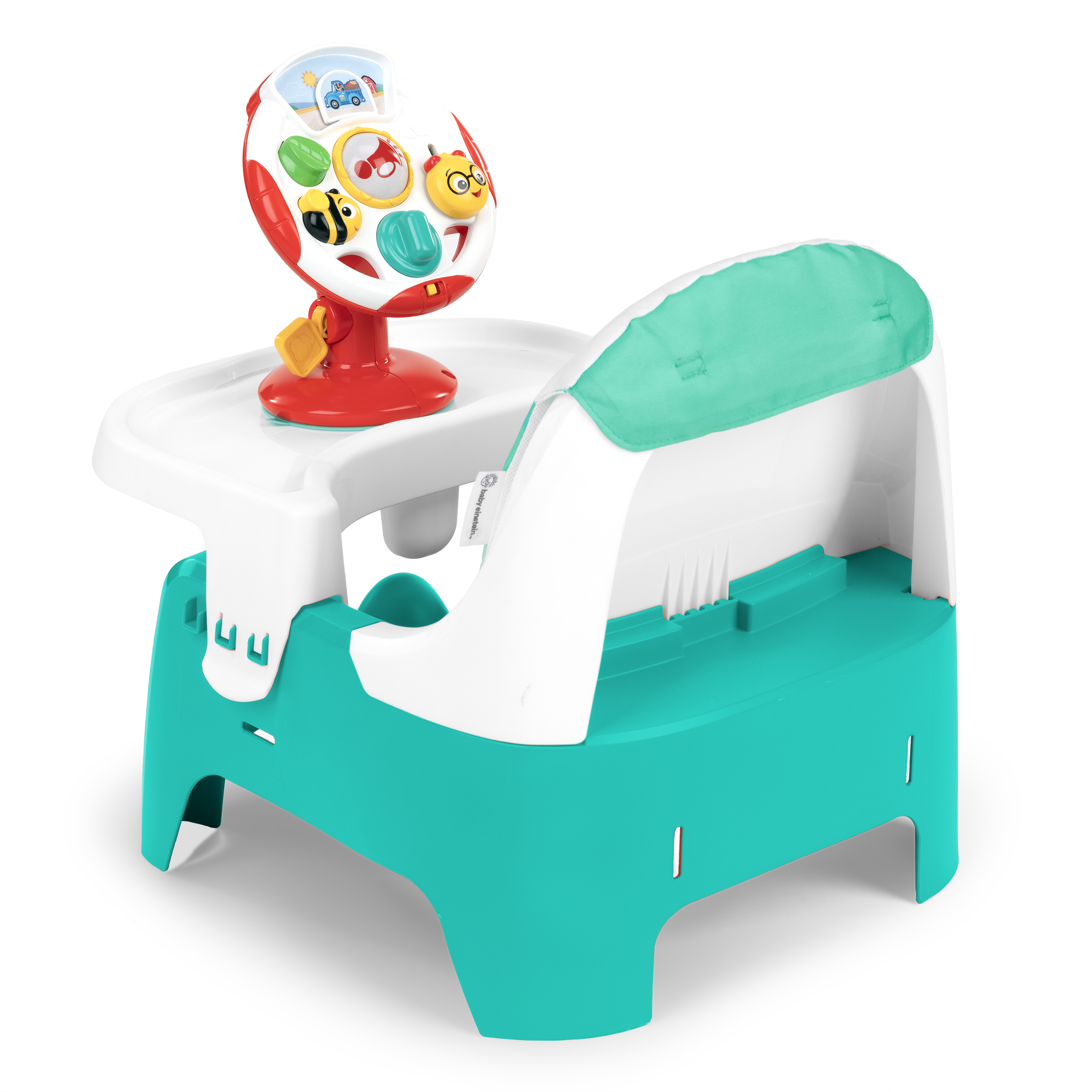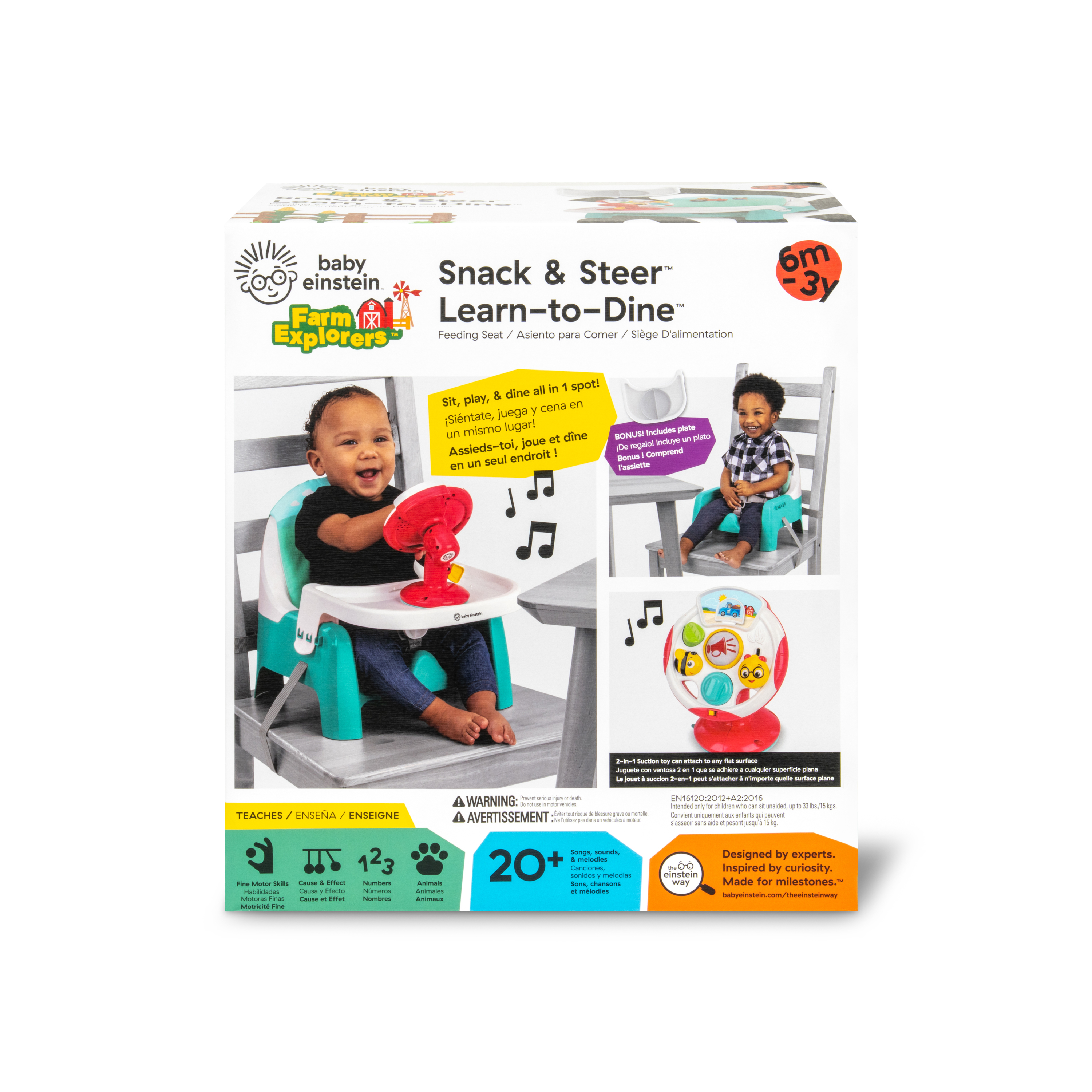 - The Baby Einstein Farm Explorers Snack & Steer Learn-to-Dine Feeding Seat is a compact booster and multisensory toy to support baby's learning and dining needs from ages 6 months to 3 years of age