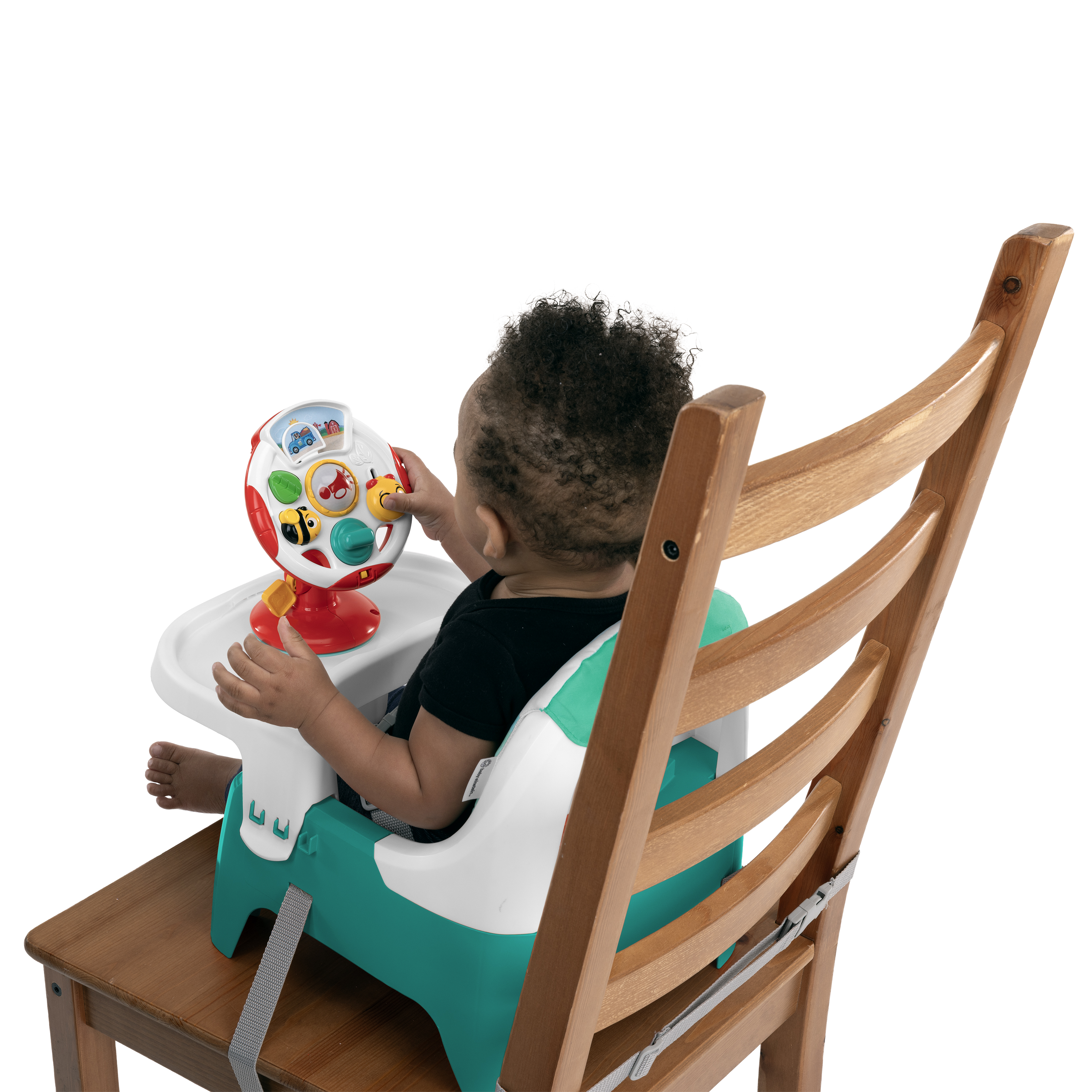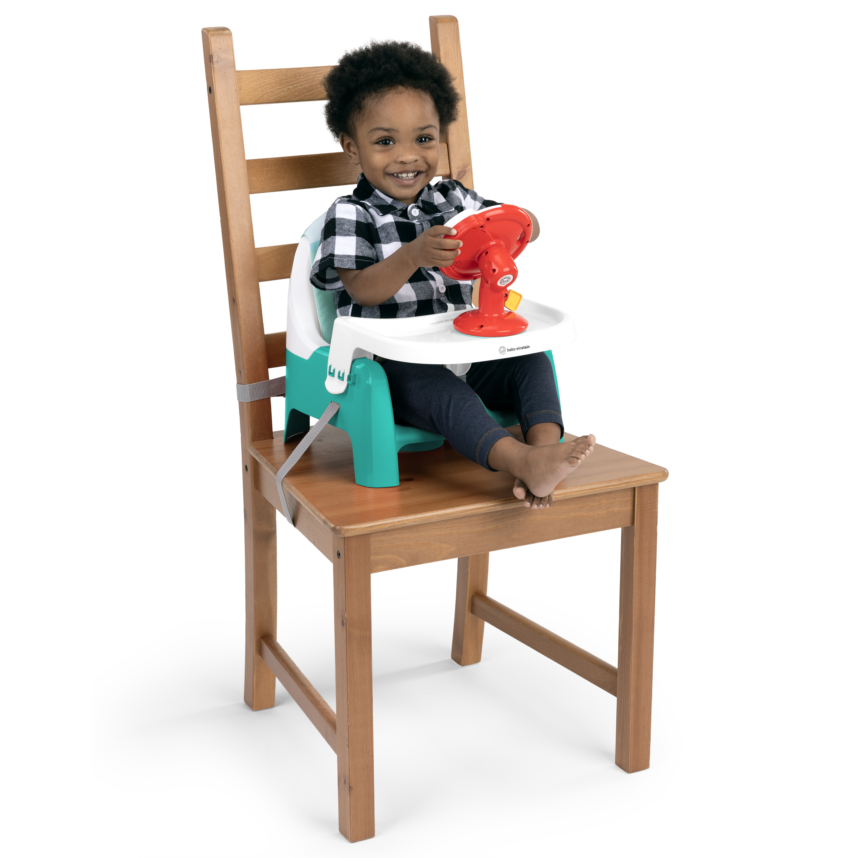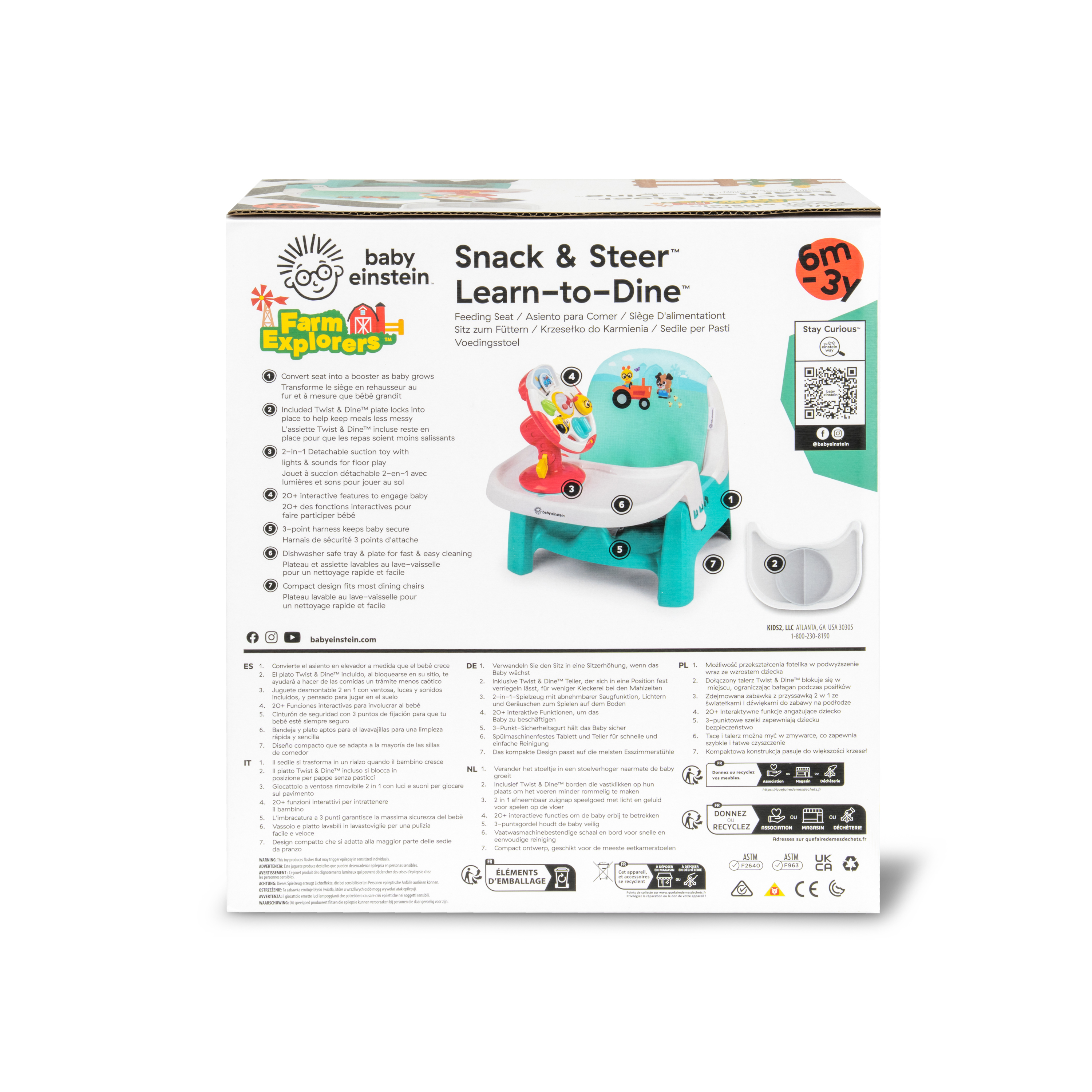 - The Baby Einstein Farm Explorers Snack & Steer Learn-to-Dine Feeding Seat is a compact booster and multisensory toy to support baby's learning and dining needs from ages 6 months to 3 years of age