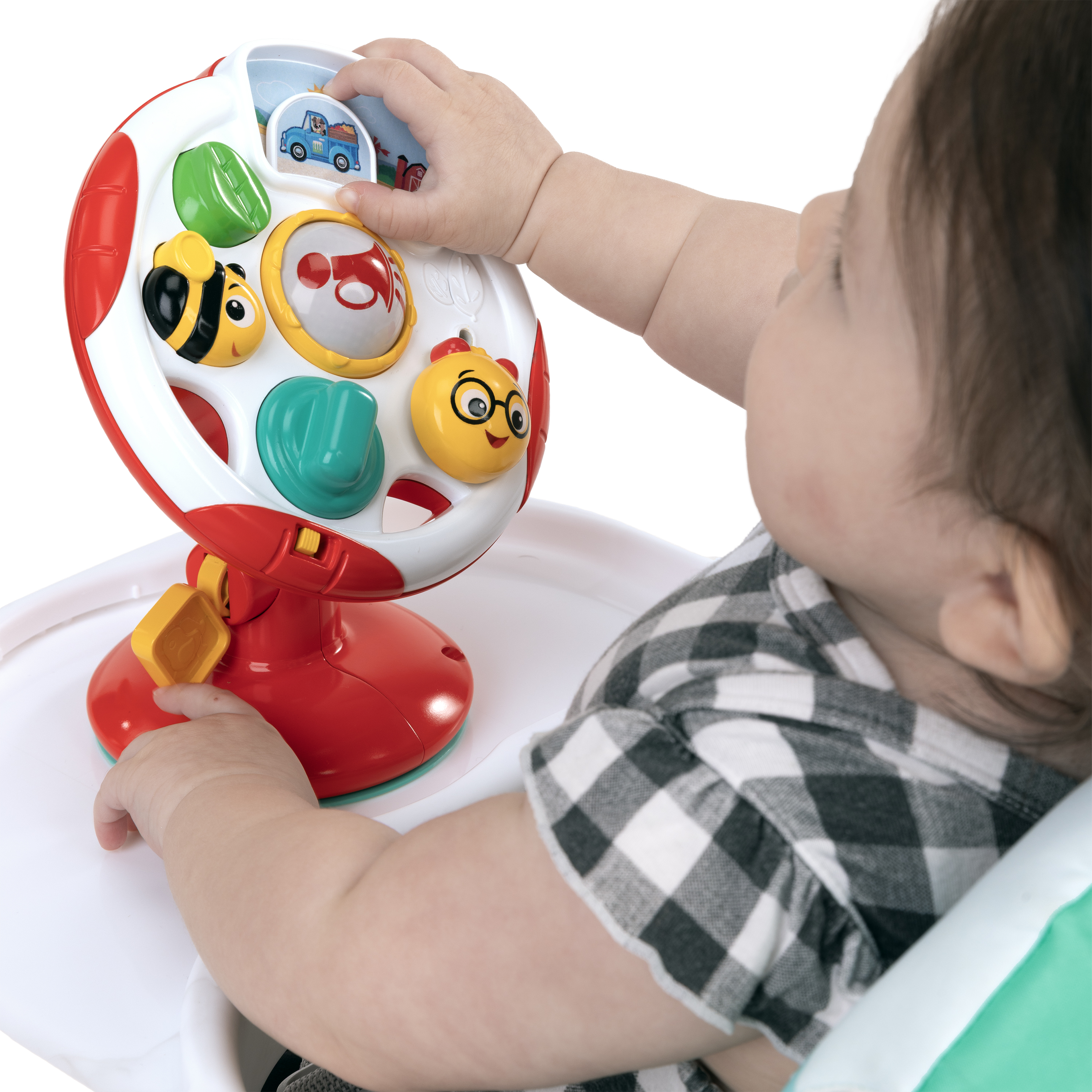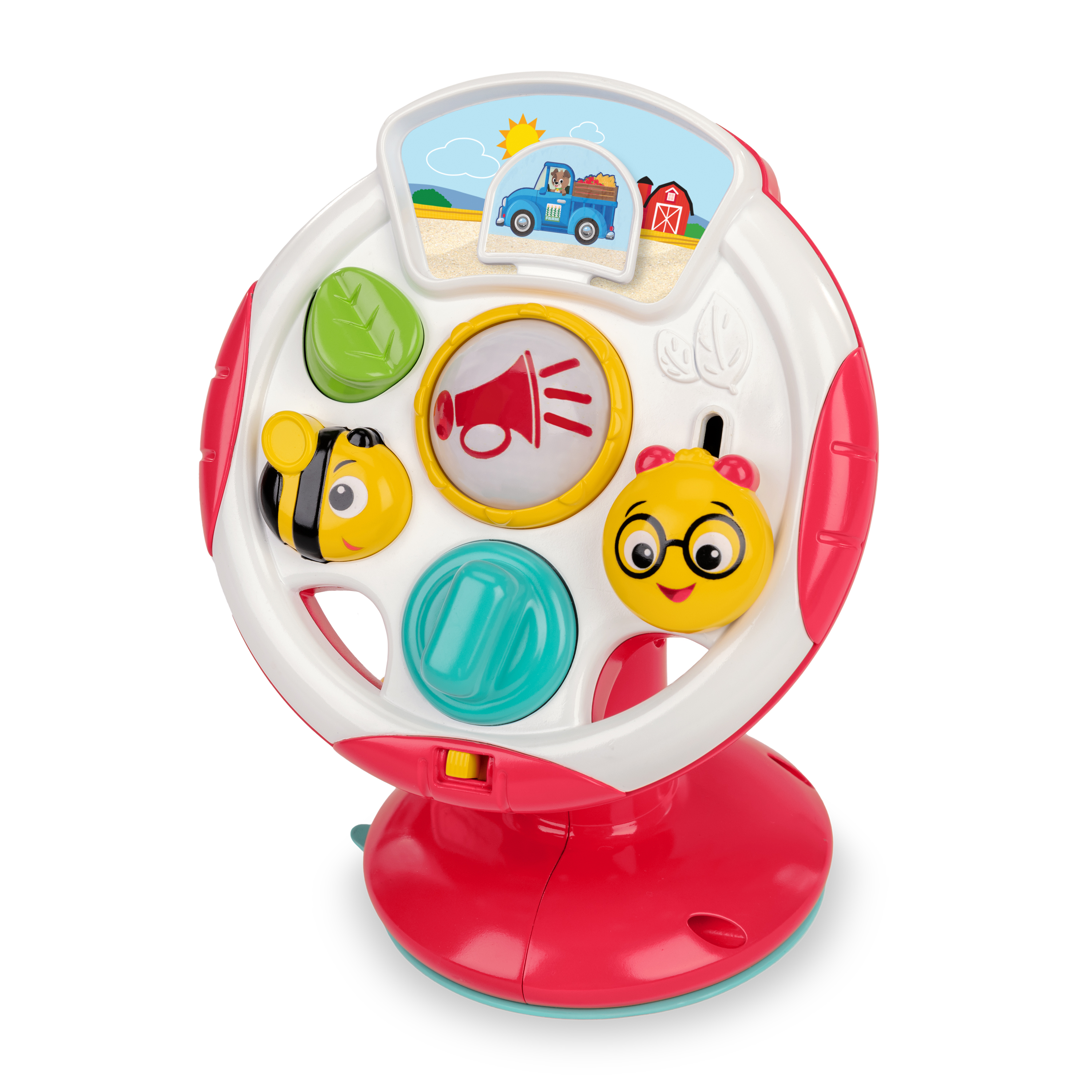 - Includes an engaging steering wheel toy to entertain baby with music, sounds, & interactive buttons; adhere toy to smooth surfaces via suction cup on base, or detach to take discovery on-the-go
