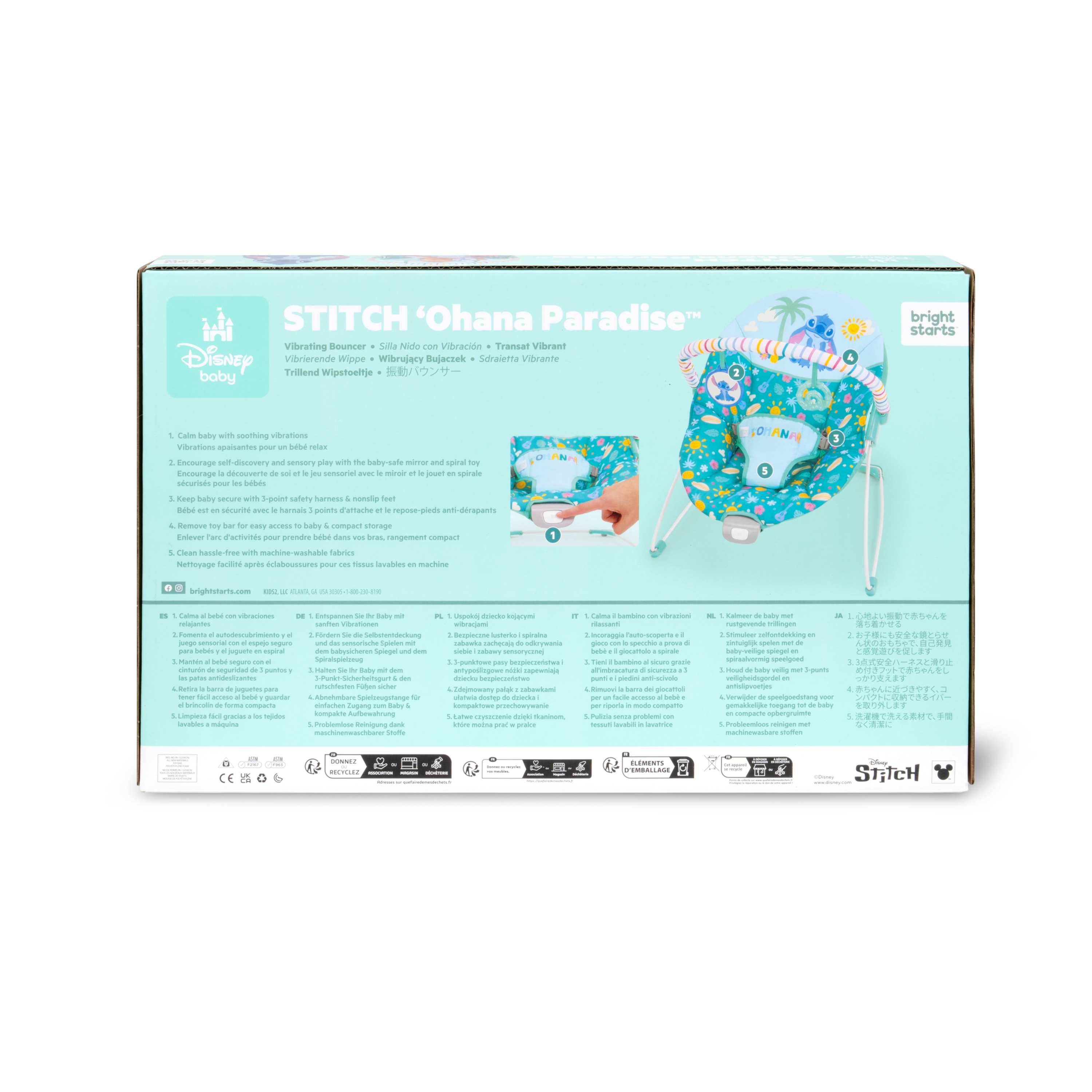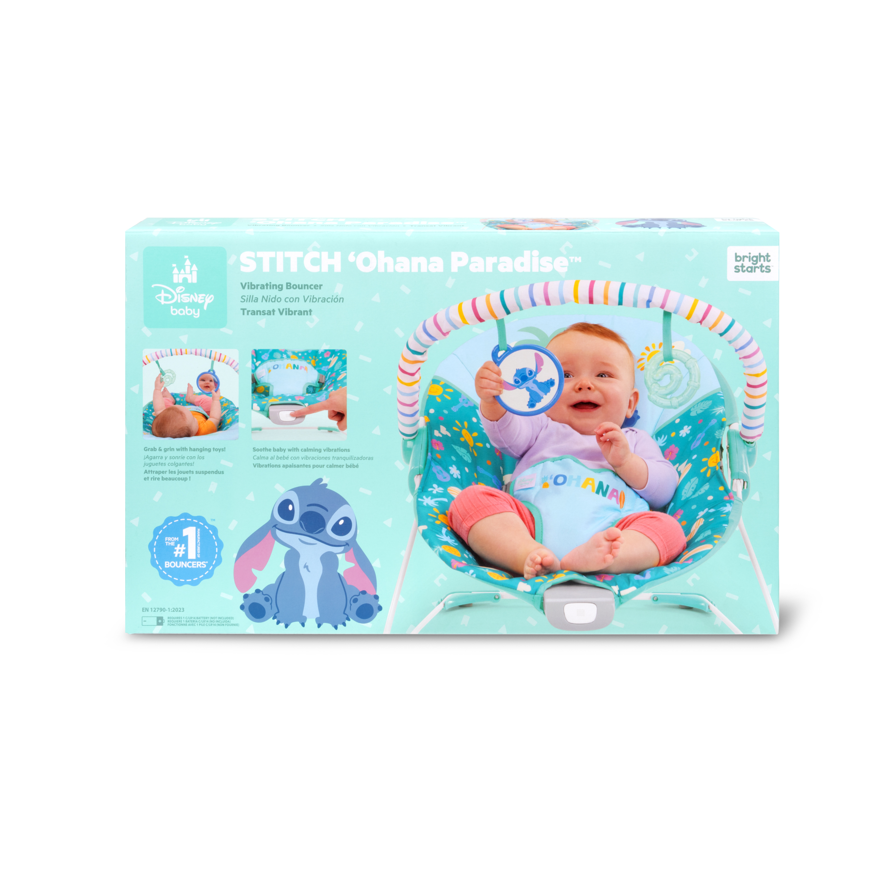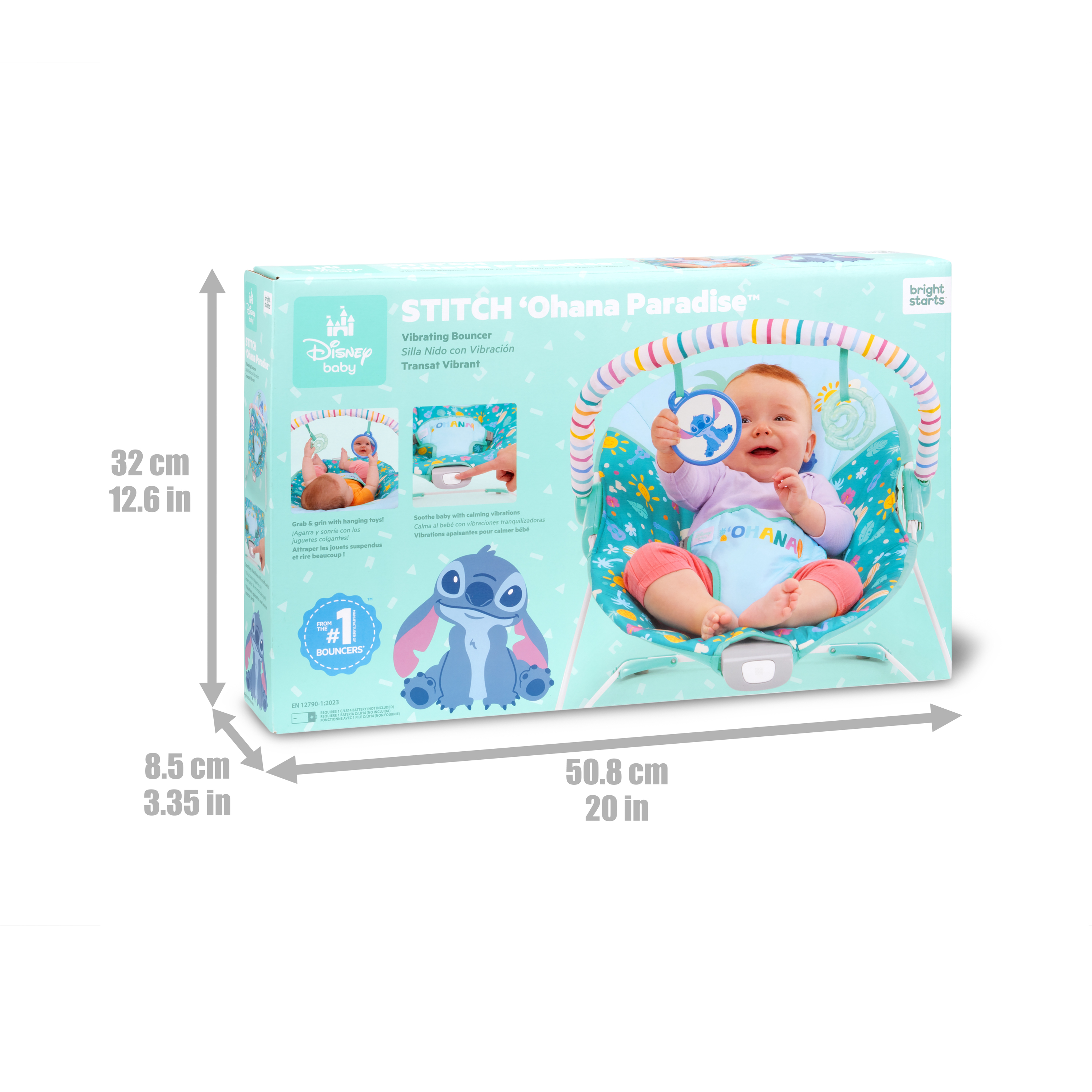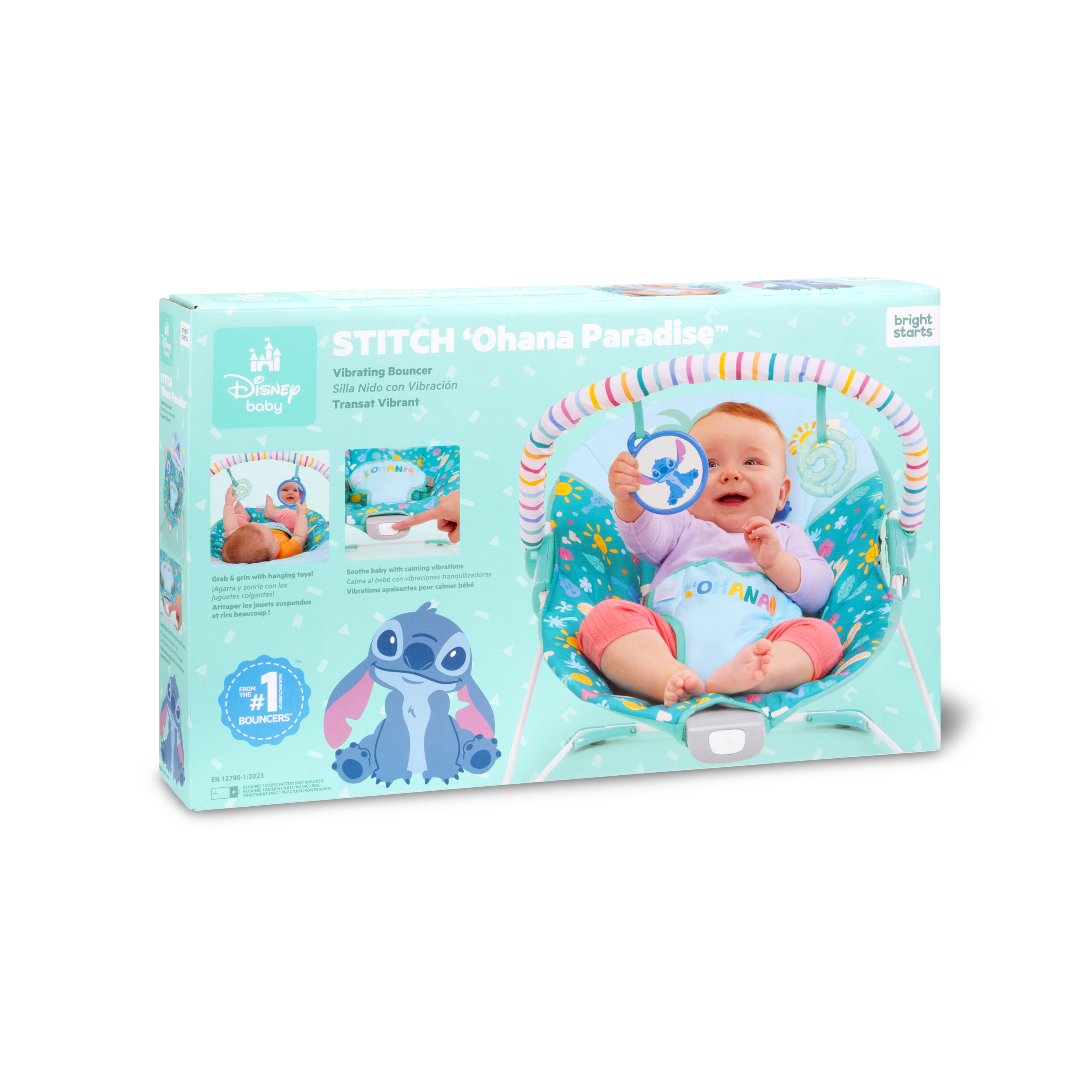 - Disney Baby Stitch ‘Ohana Paradise Bouncer by Bright Starts introduces baby to everyone’s favorite alien, Stitch; includes 2 hanging sensory toys for babies: mirror and spiral toy