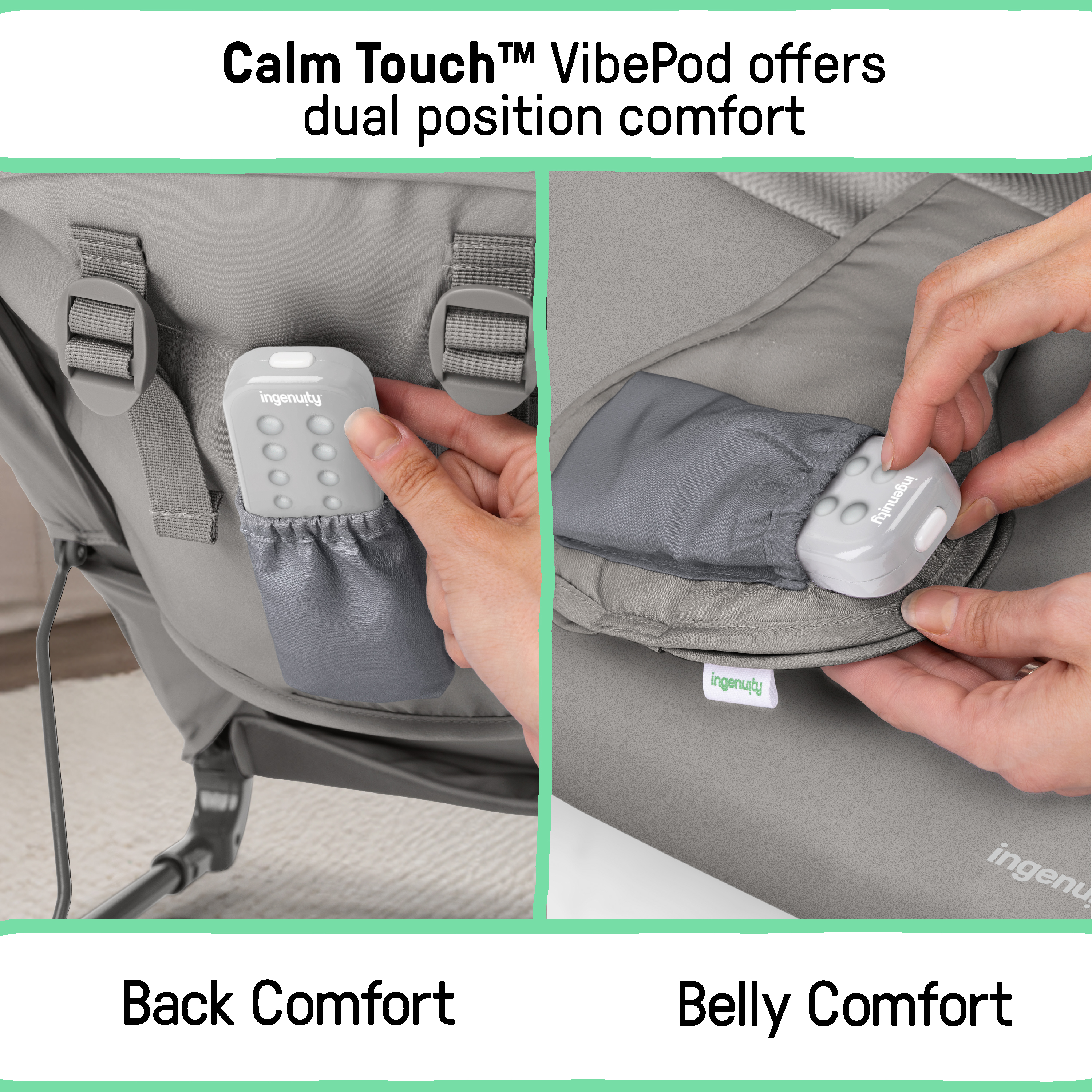 - Two-position recline and movable CalmTouch Vibe-Pod unit provide gentle vibration on baby’s belly or back, offering extra soothing support