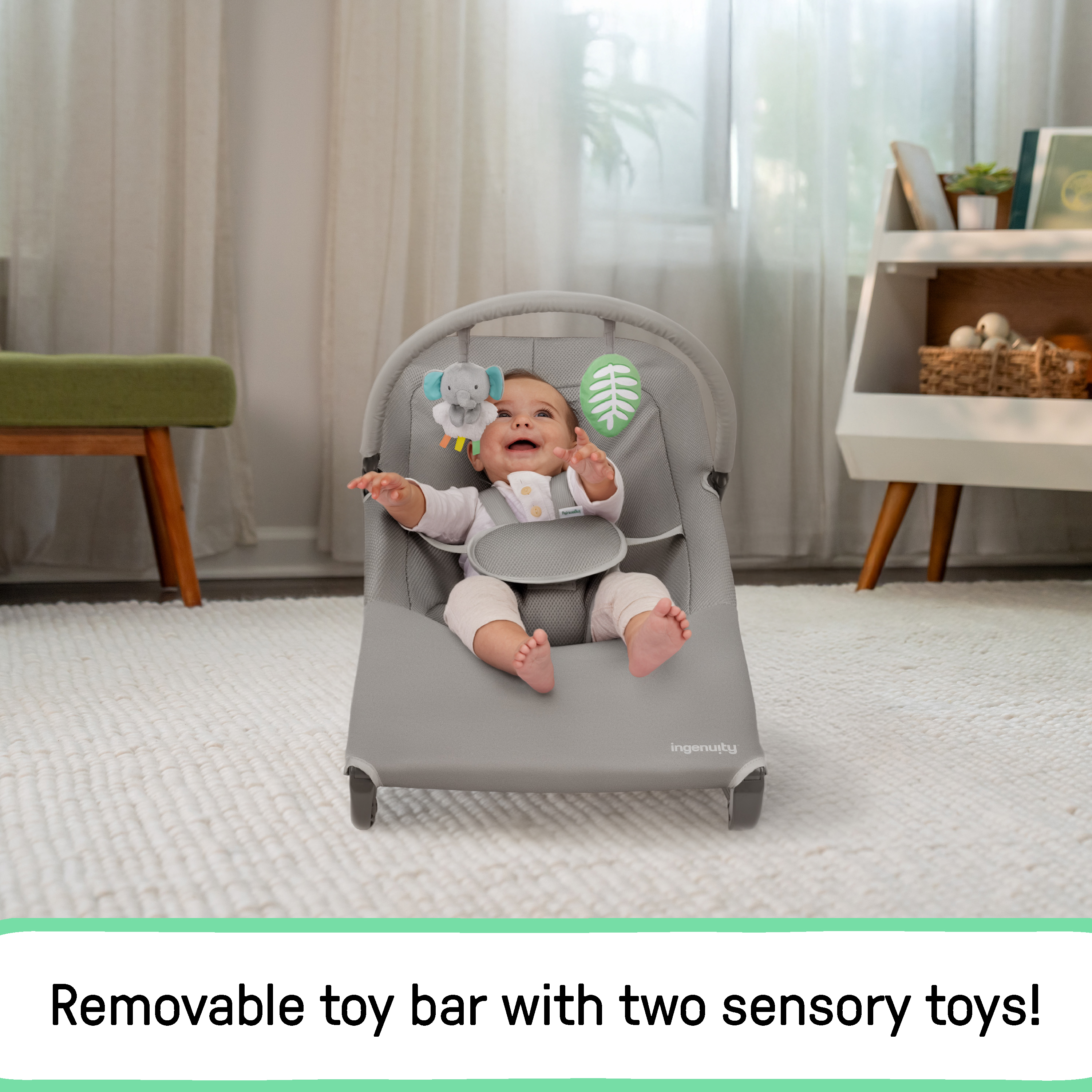- Removable toy bar with two engaging toys, a crinkly plant and a soft elephant, encourages reaching, grasping, and early sensory exploration