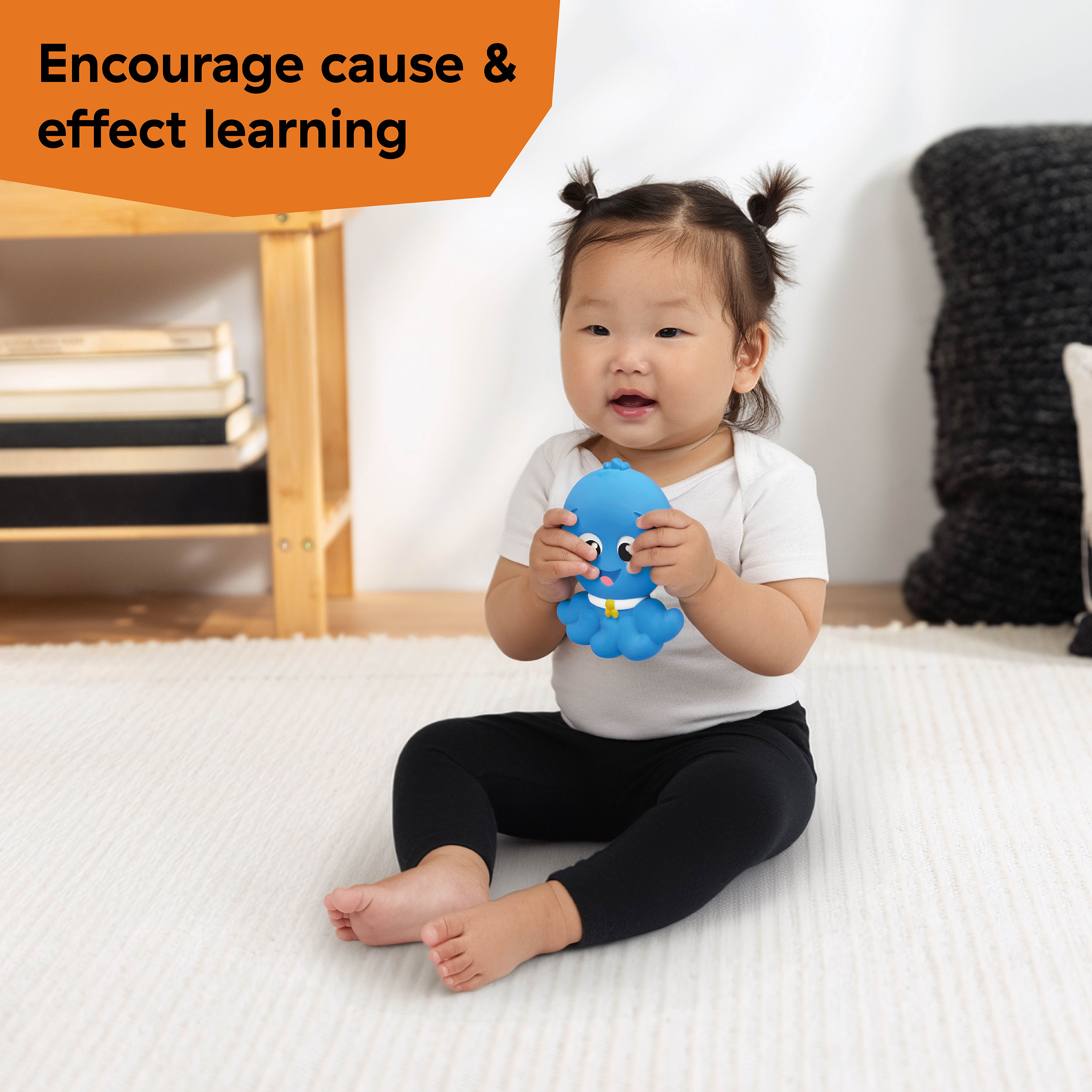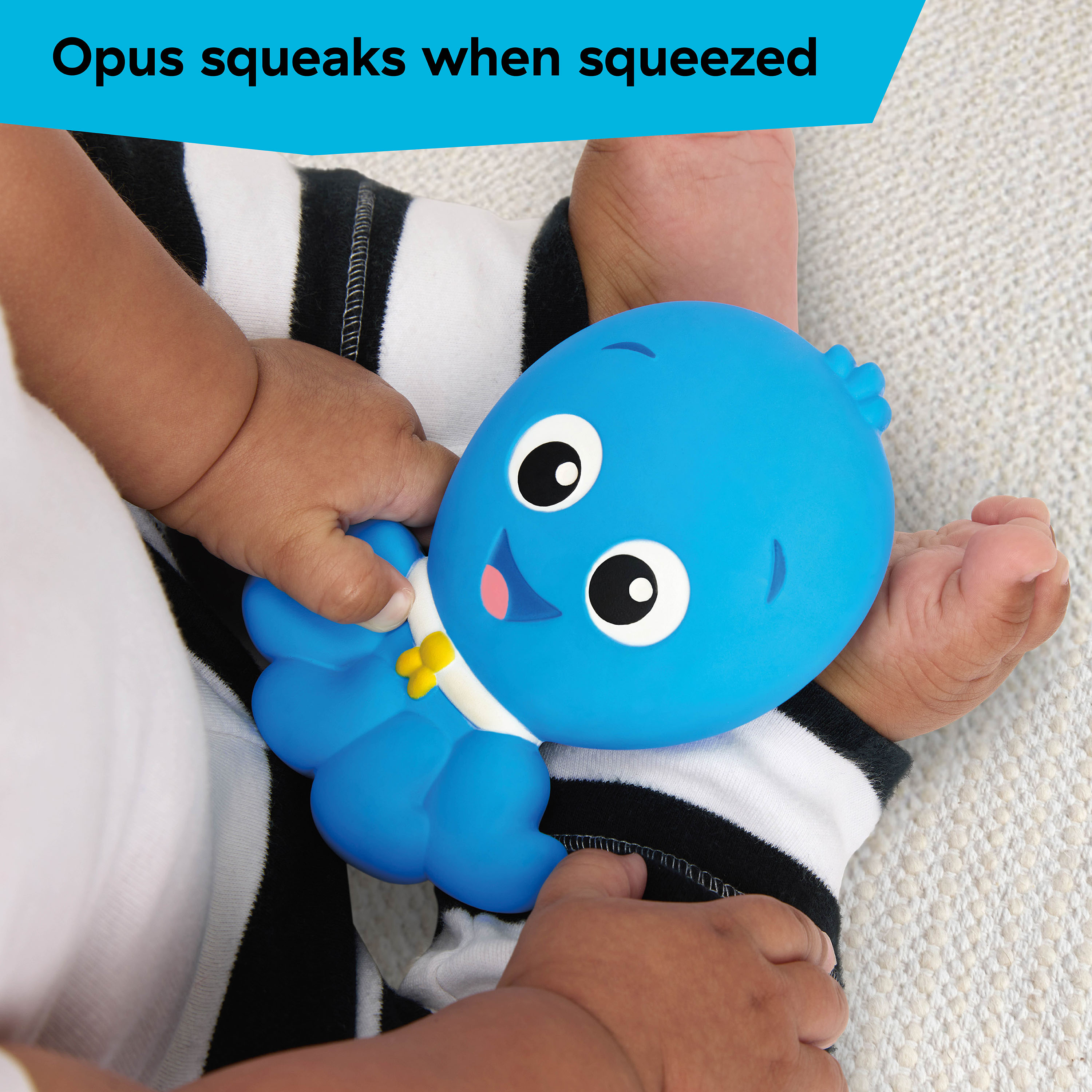 - Responsive rubber material is easy for baby to hold, chew, and squeeze; Opus squeaks when squeezed to engage baby and promote cause and effect learning