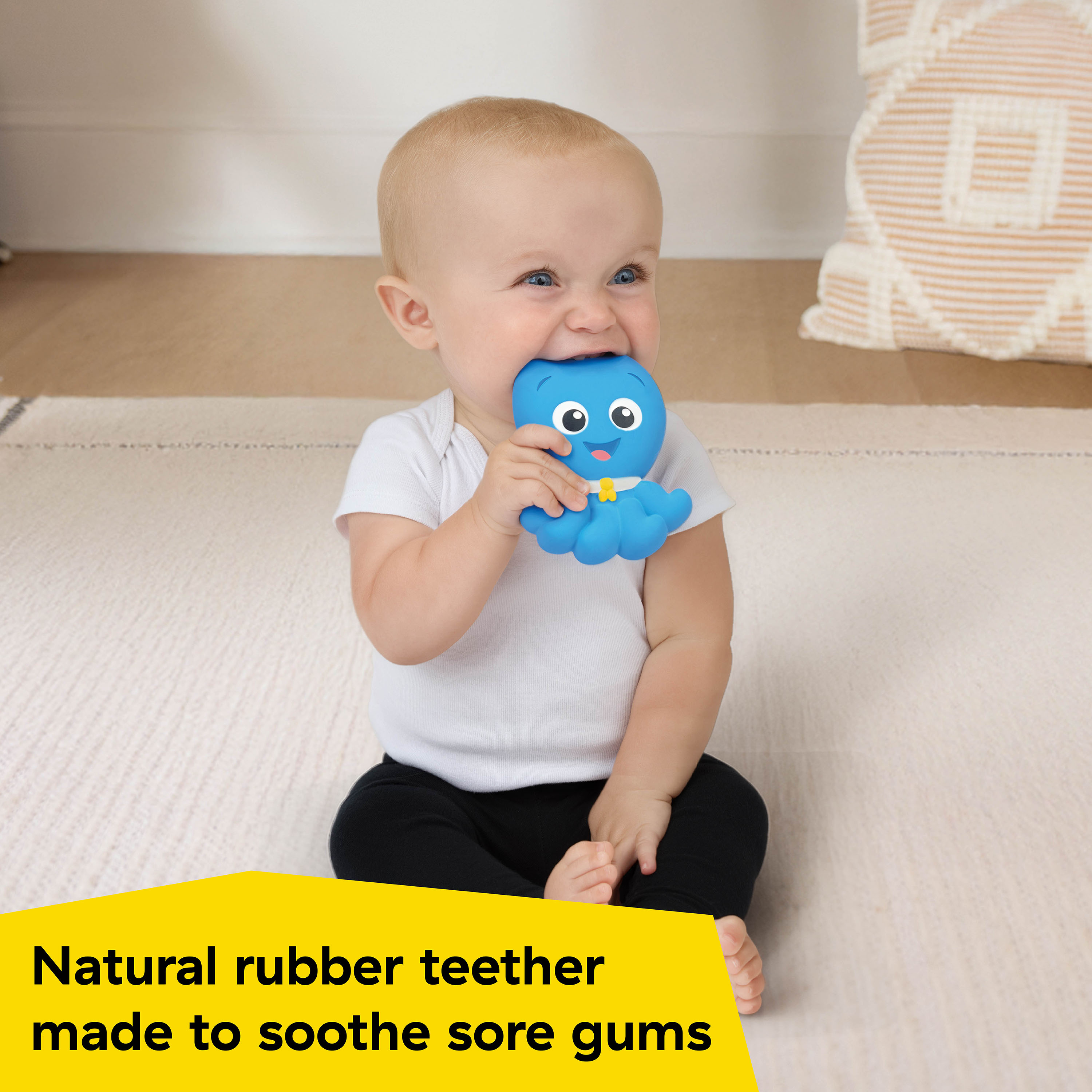- Made with natural rubber, this octopus-shaped teether toy helps soothe sore gums while stimulating baby’s senses and tactile development
