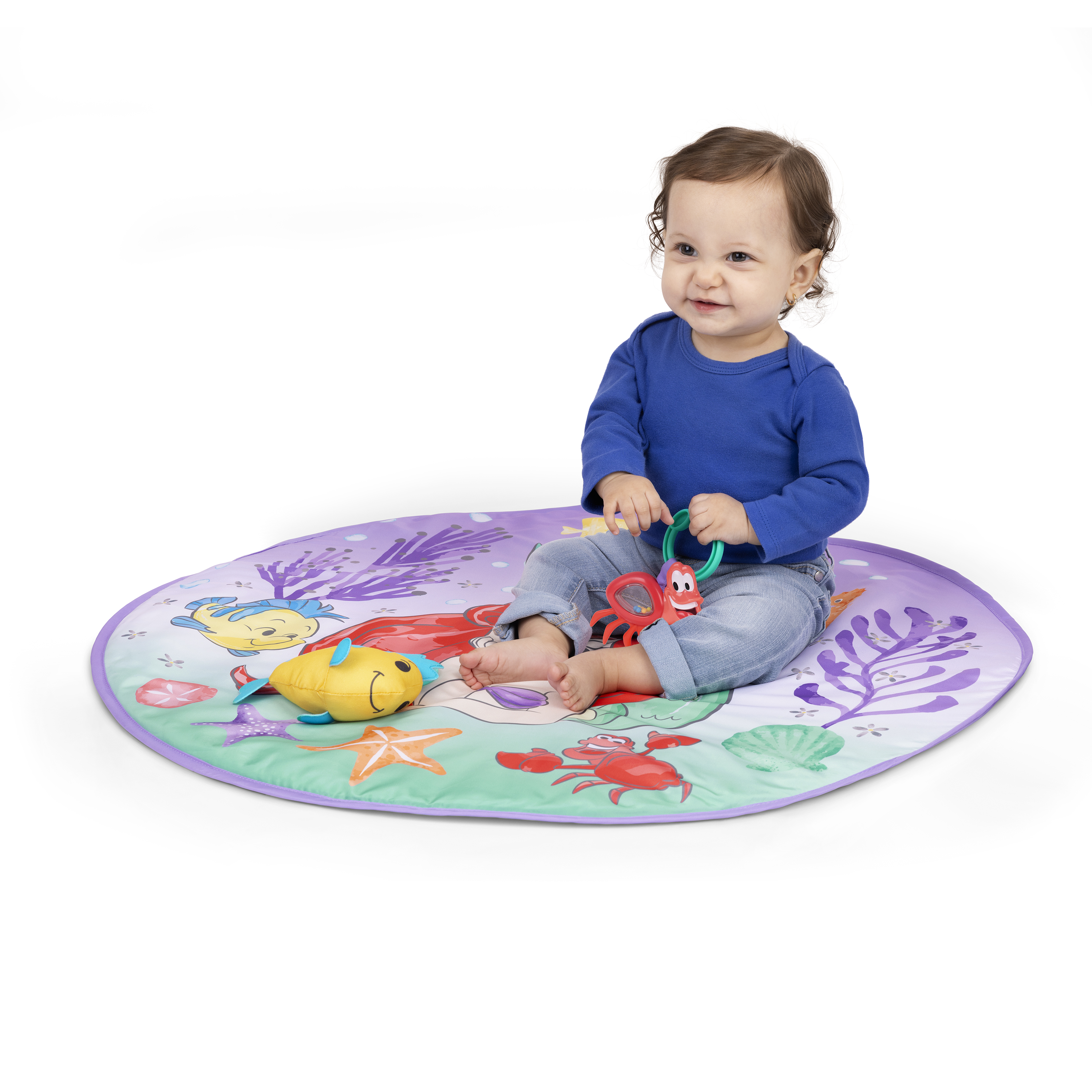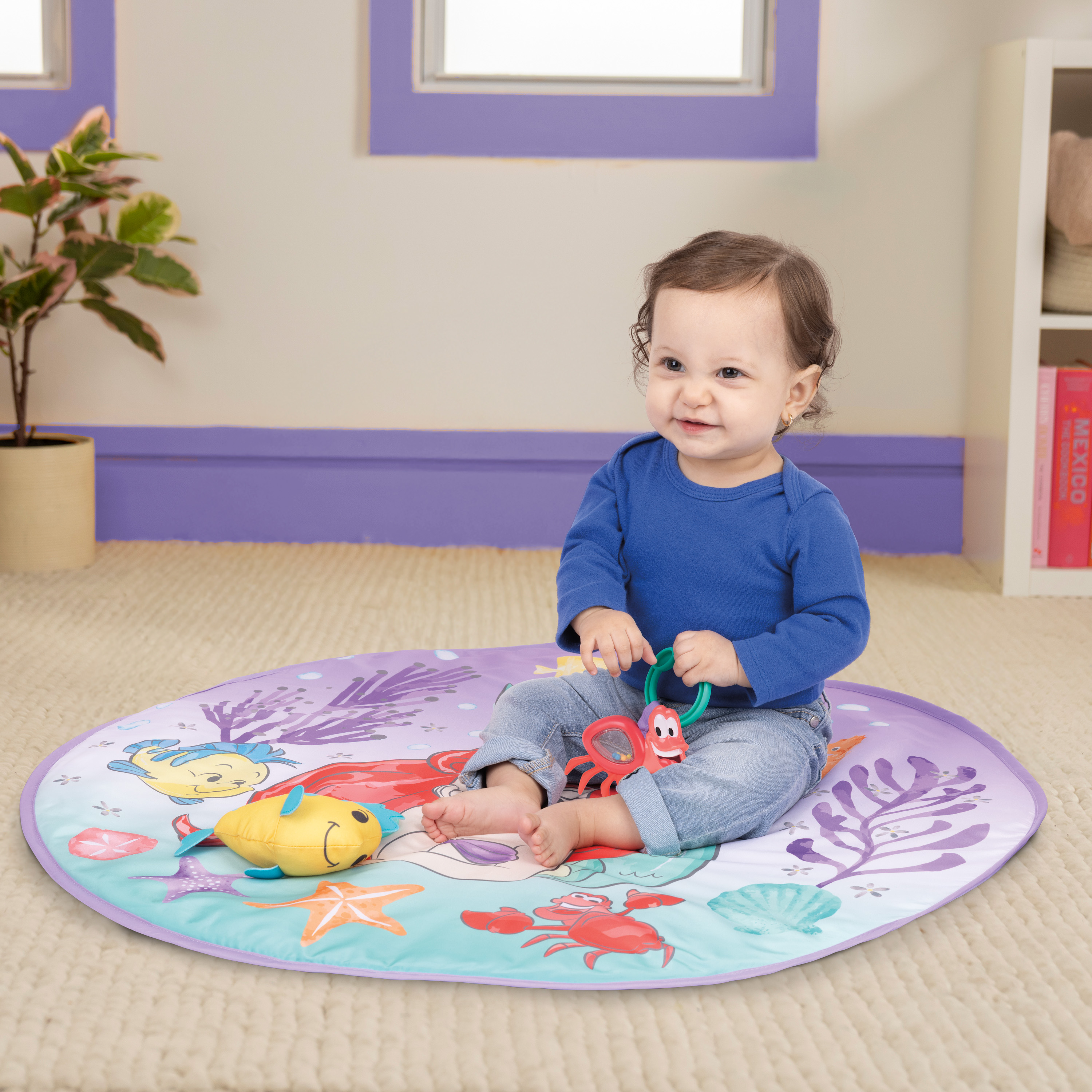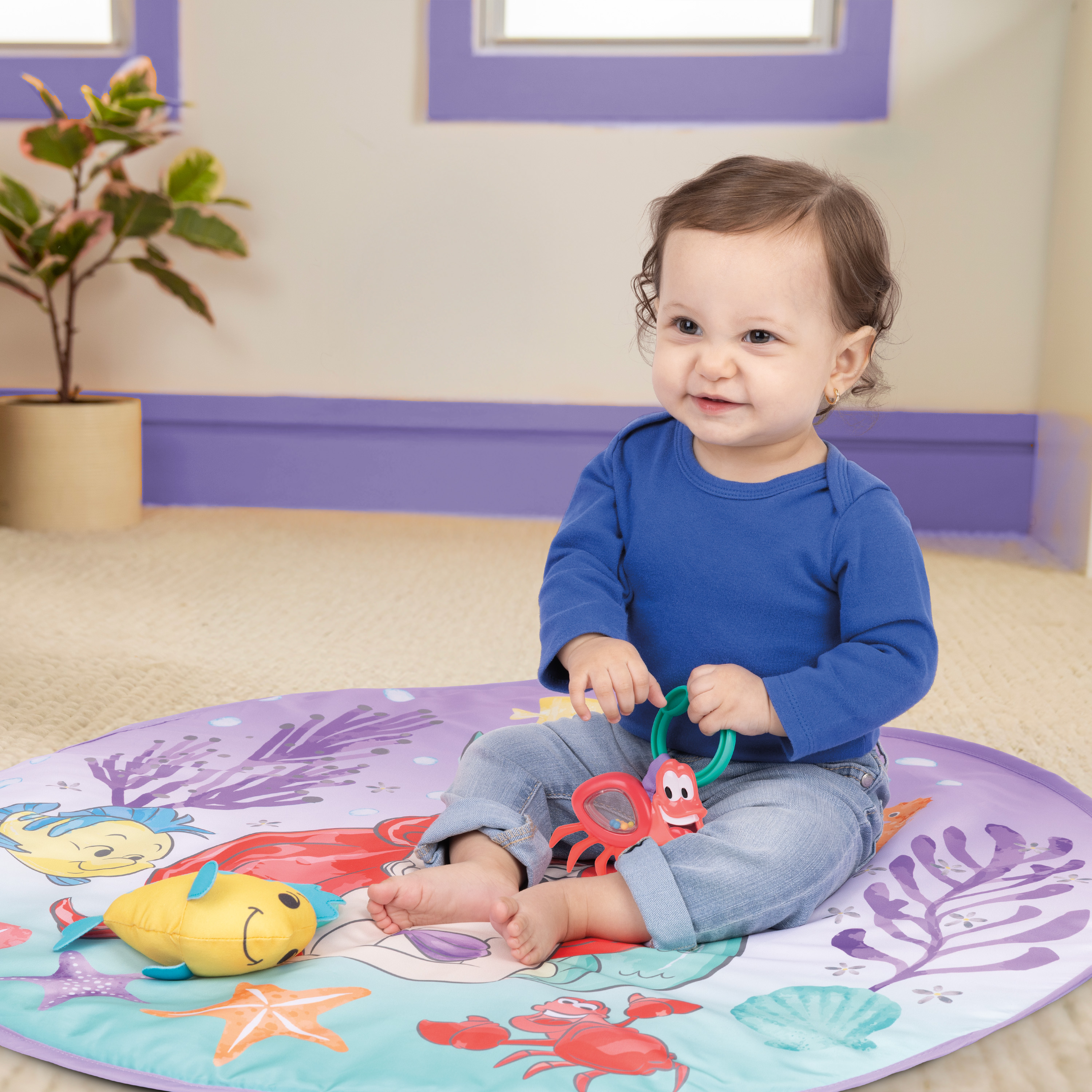 - 6 juguetes con los que jugar tumbado boca abajo: Un peluche de Flounder, galleta de arena de juguete, sonajero de Sebastián, espejo para sus ratos tumbado boca abajo, medalla de caballito de mar y pececito y las tarjetas de La sirenita