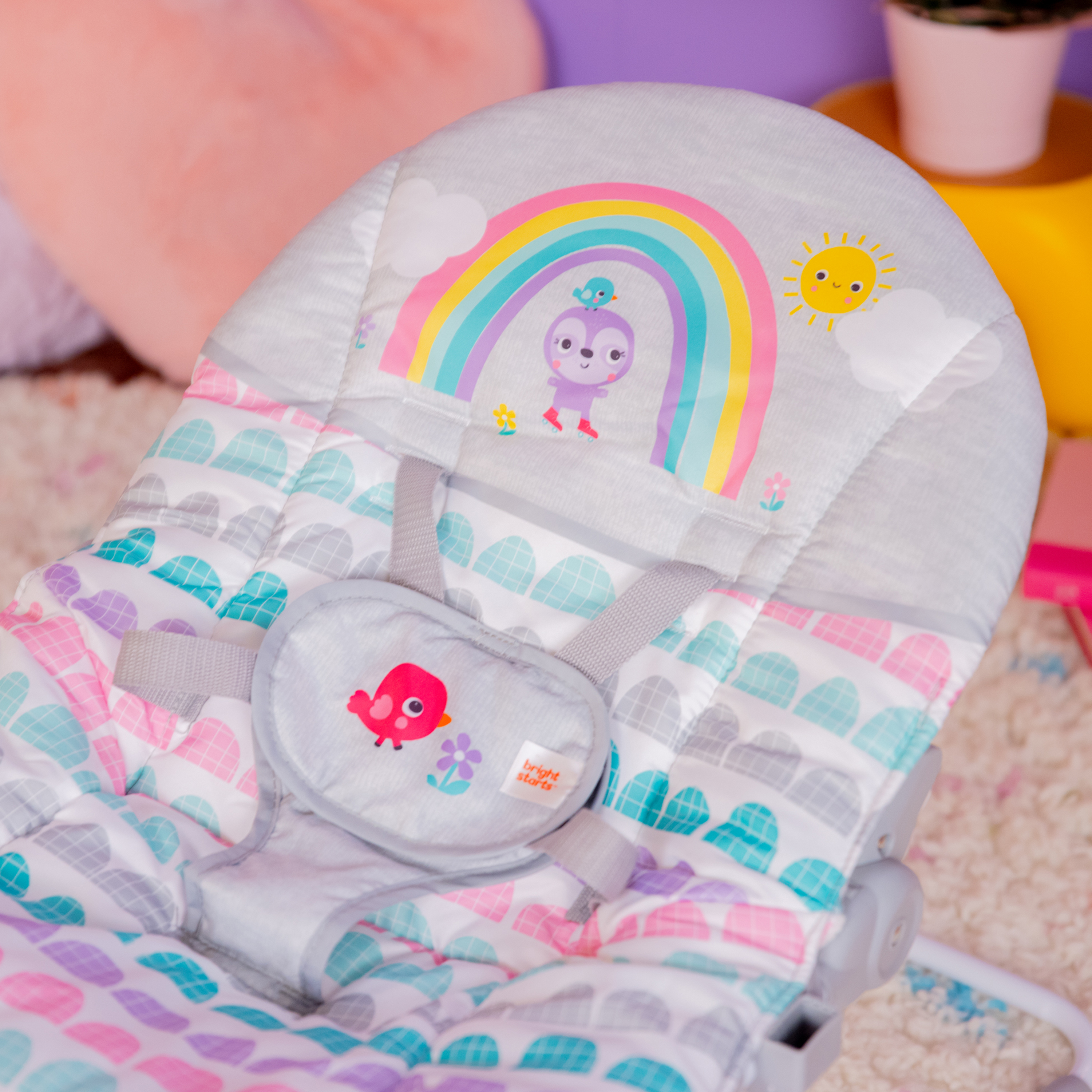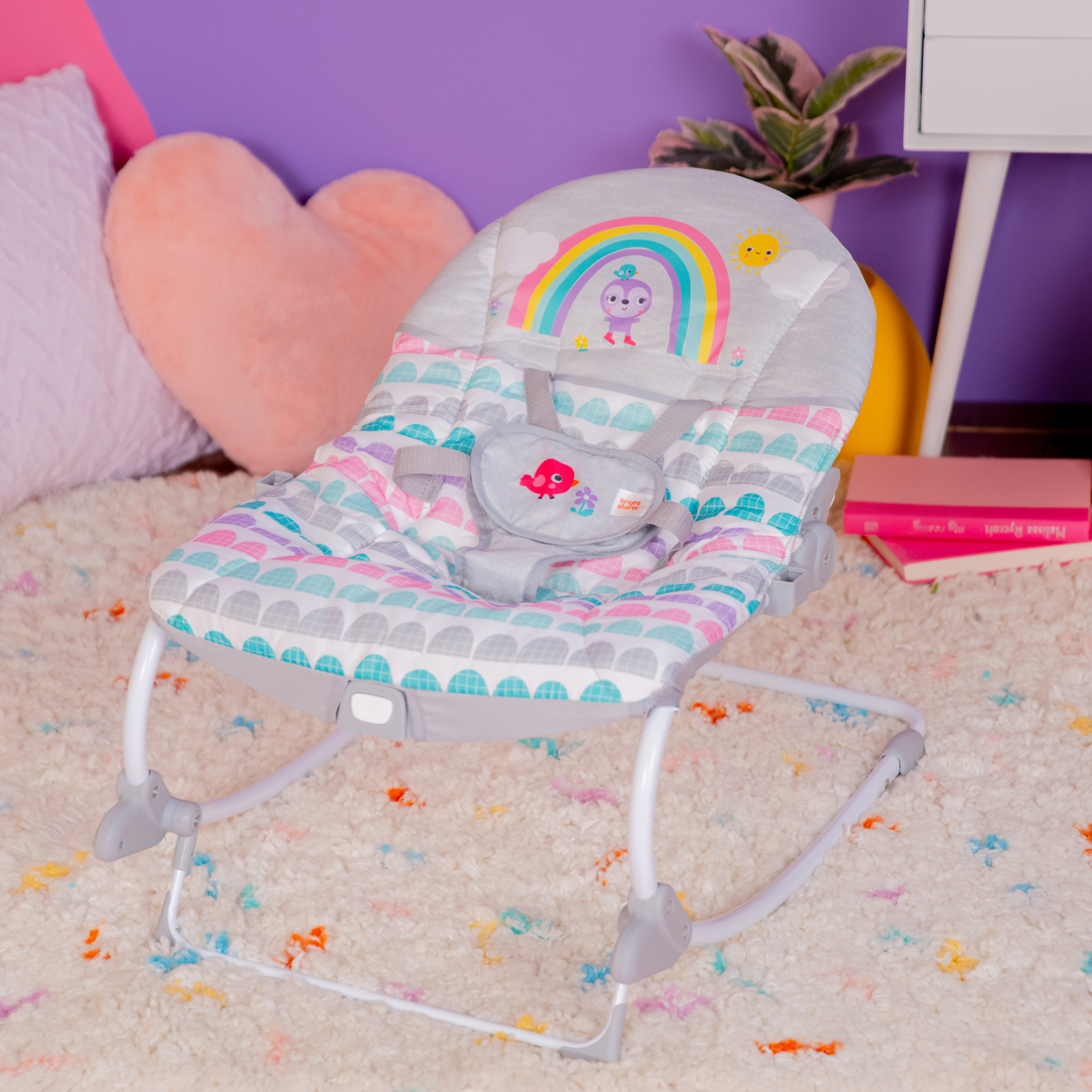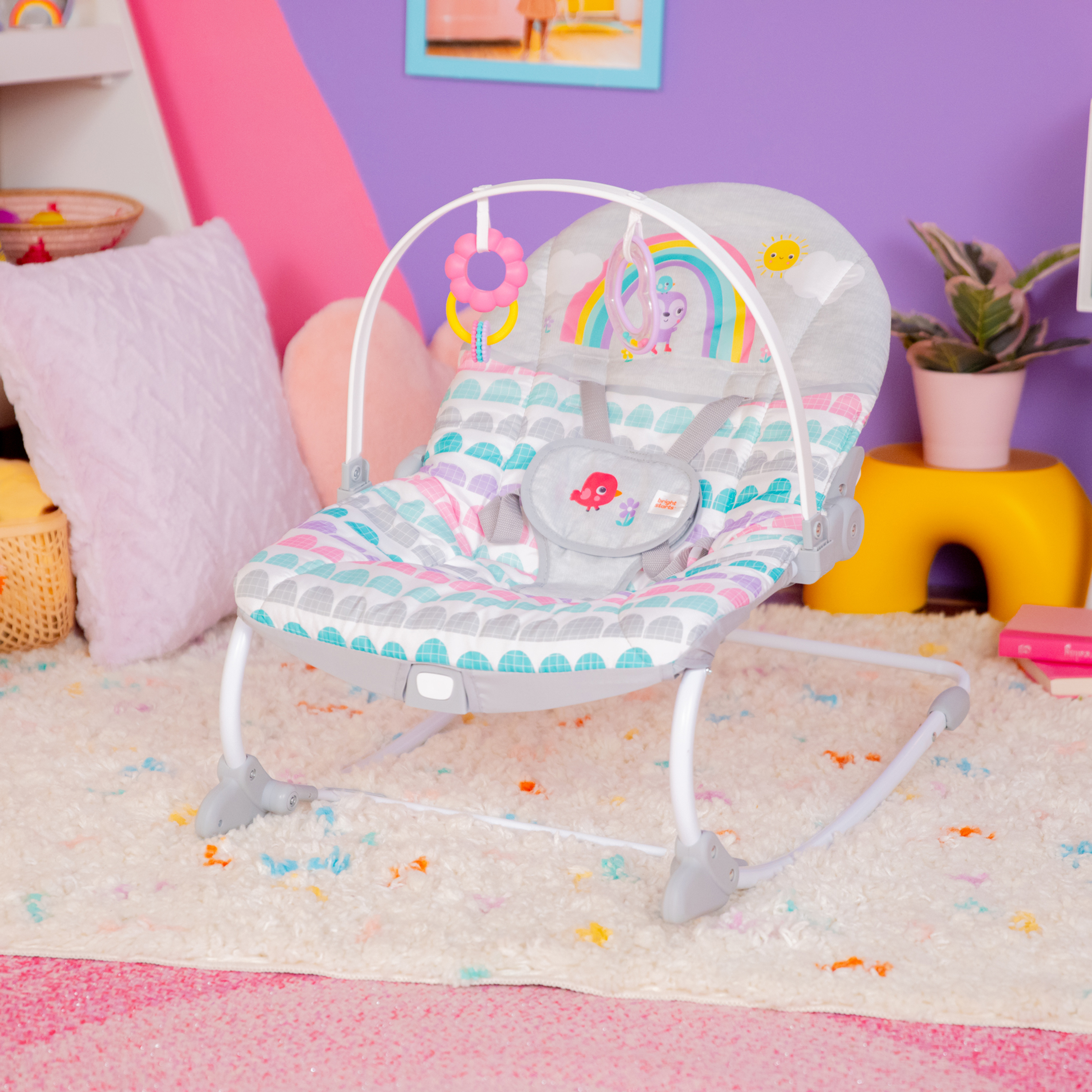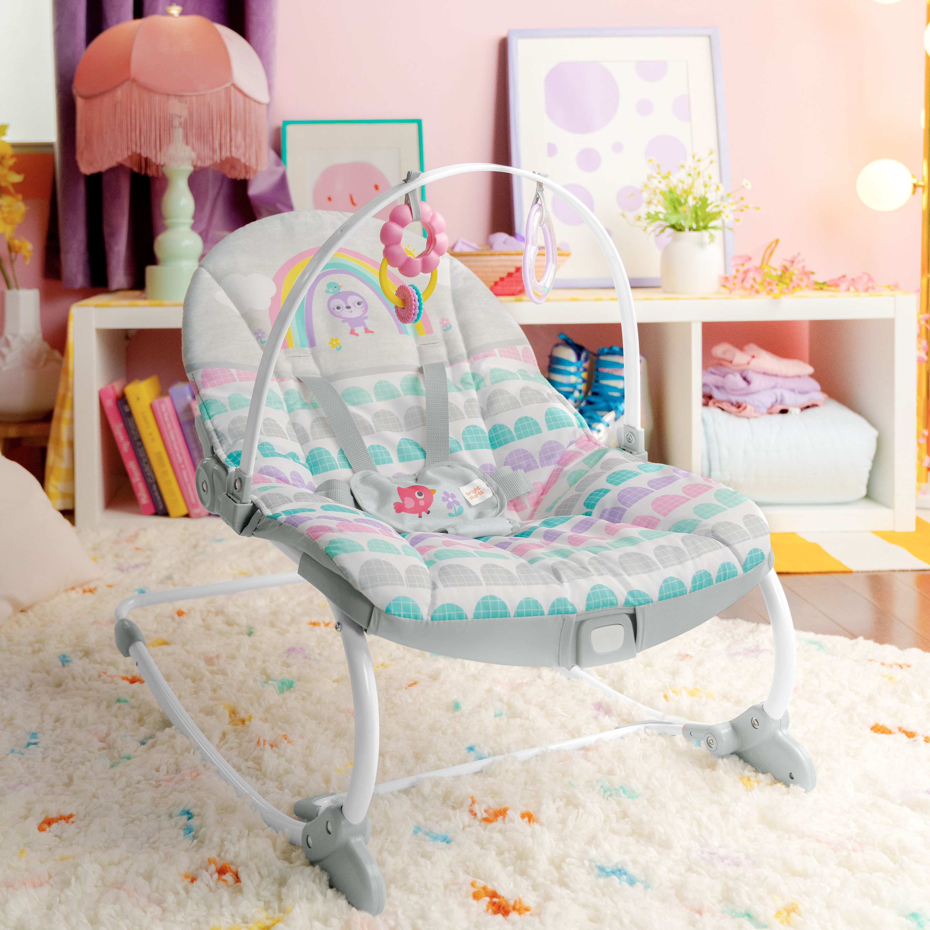 - ¡Años de diversión gracias a este polivalente asiento! La hamaca Rosy Rainbow de Bright Starts se transforma en asiento fijo y crece junto a tu bebé hasta que alcanza los 18 kg. Su soporte delantero permite transformarla de hamaca en asiento fijo