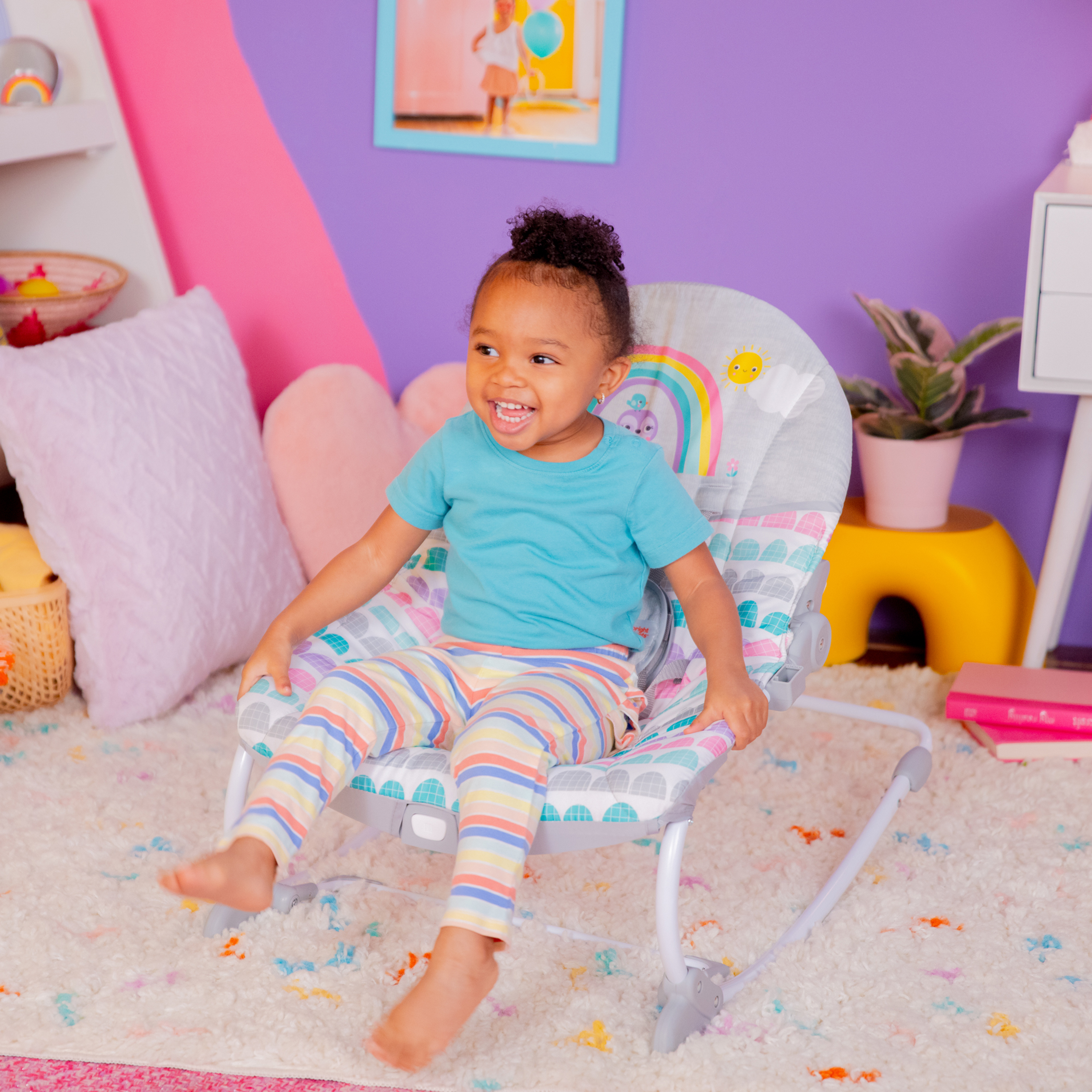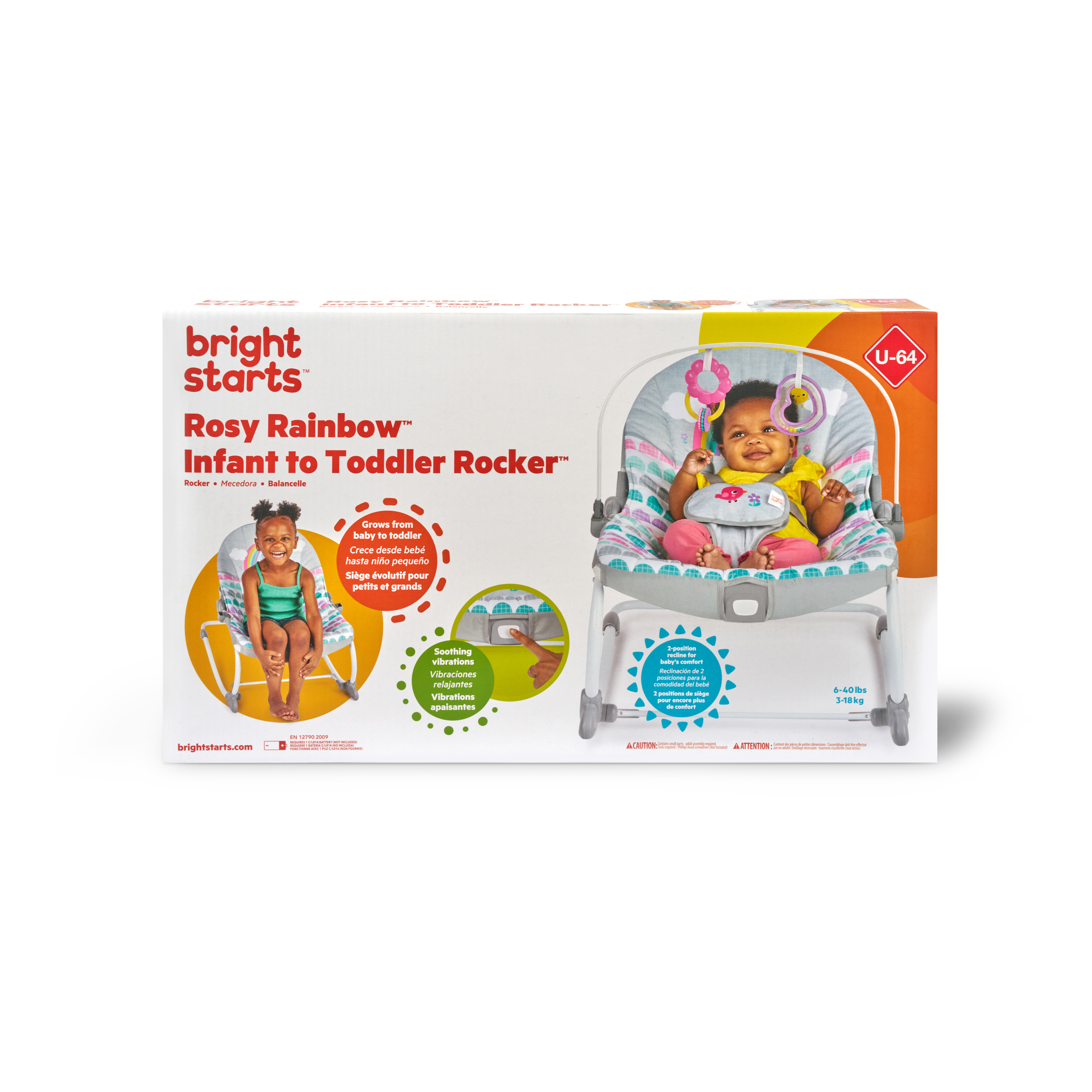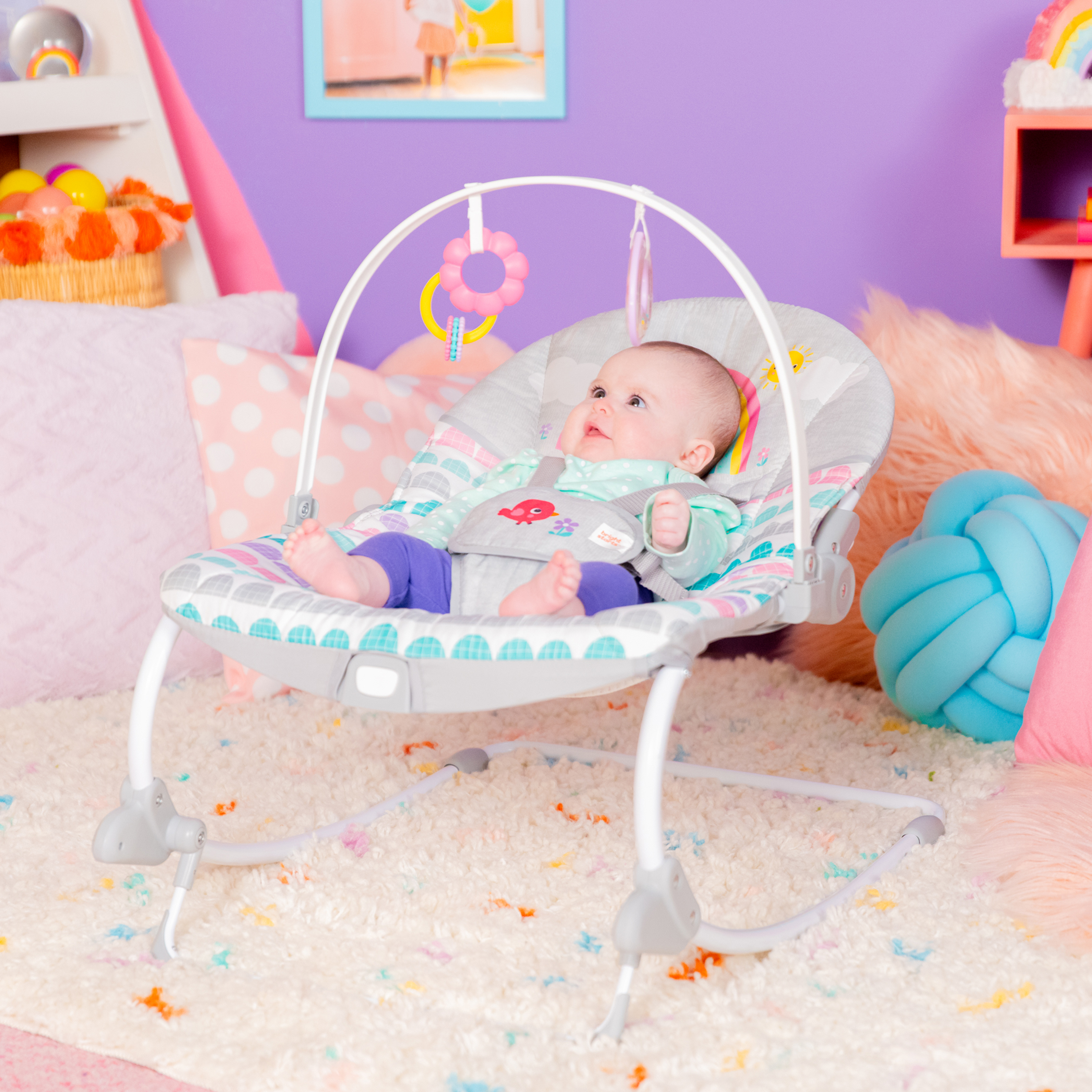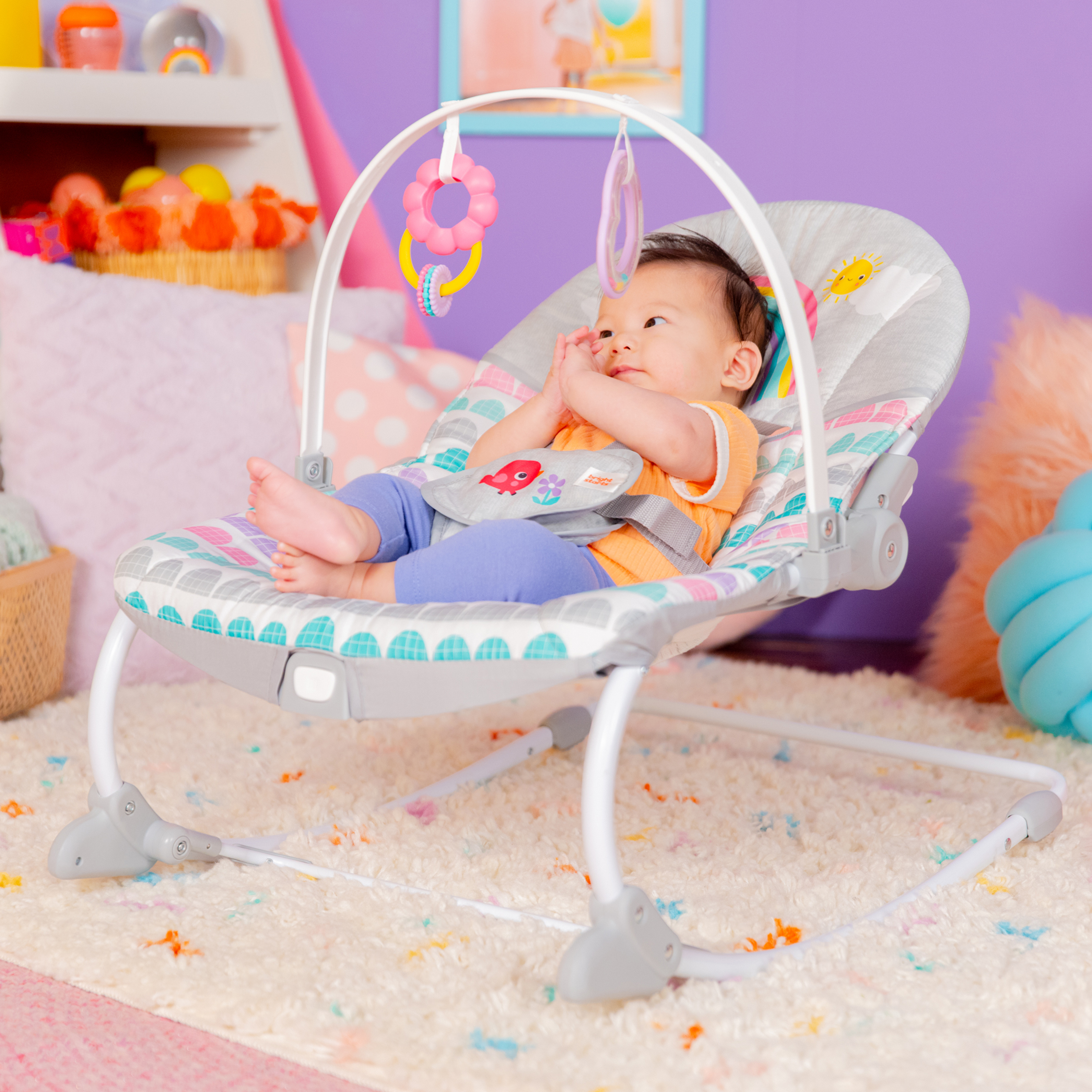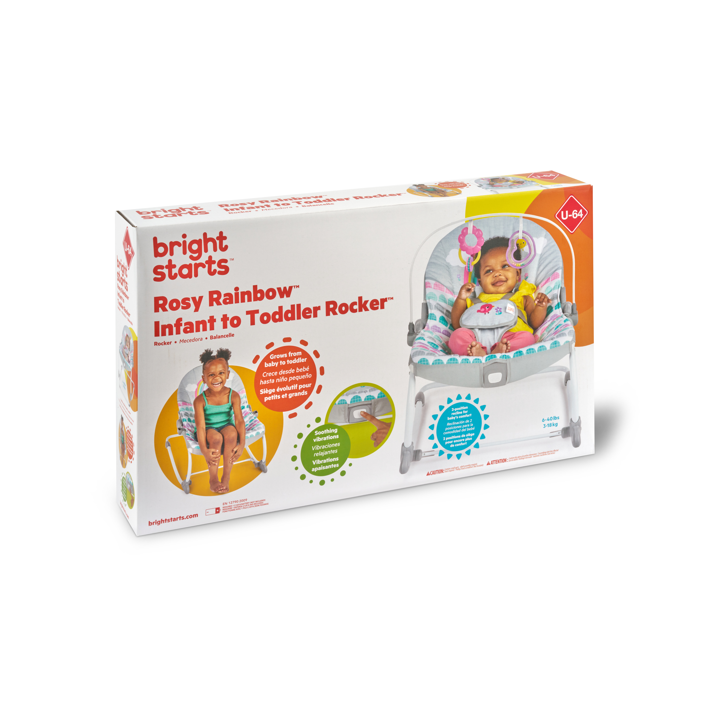 - ¡Años de diversión gracias a este polivalente asiento! La hamaca Rosy Rainbow de Bright Starts se transforma en asiento fijo y crece junto a tu bebé hasta que alcanza los 18 kg. Su soporte delantero permite transformarla de hamaca en asiento fijo