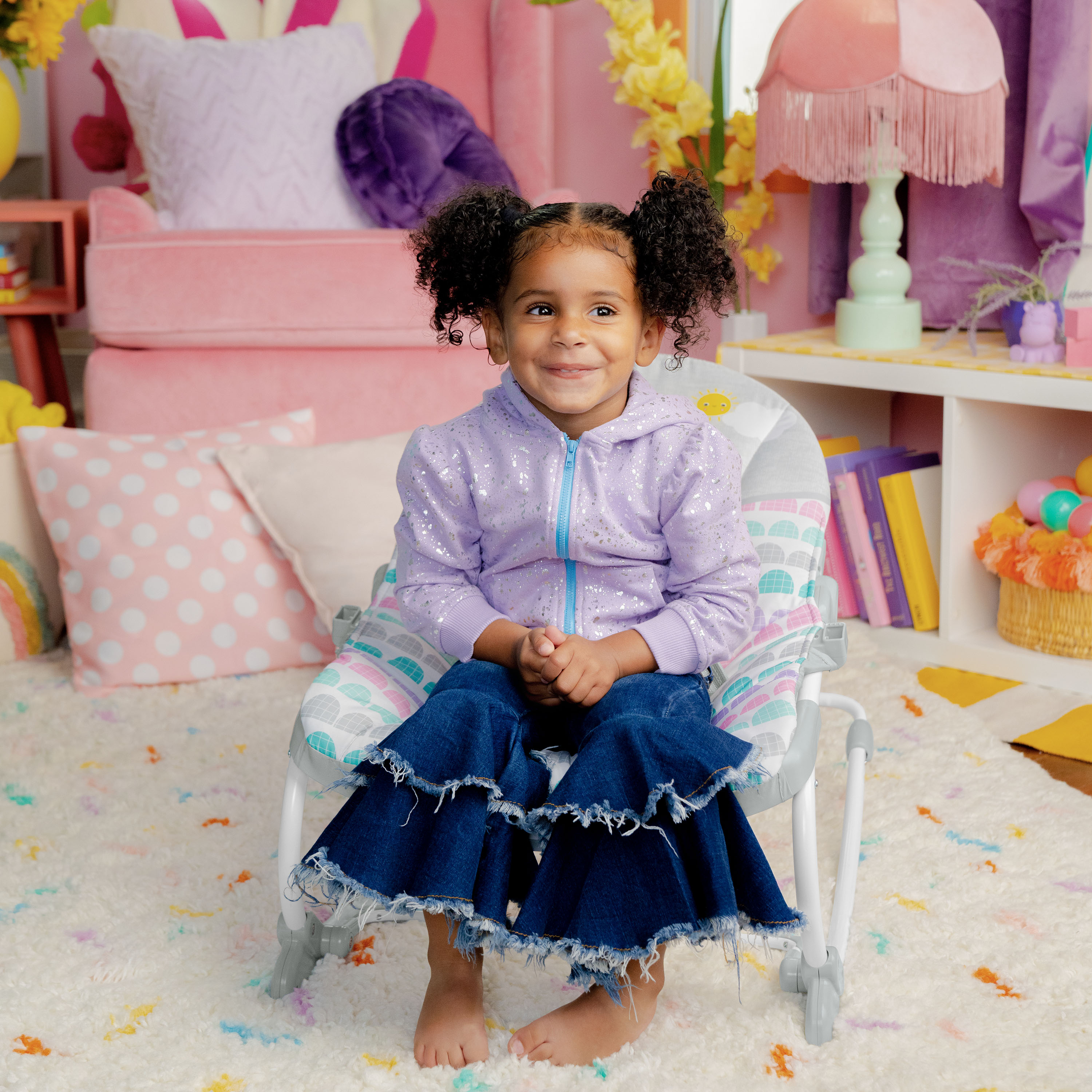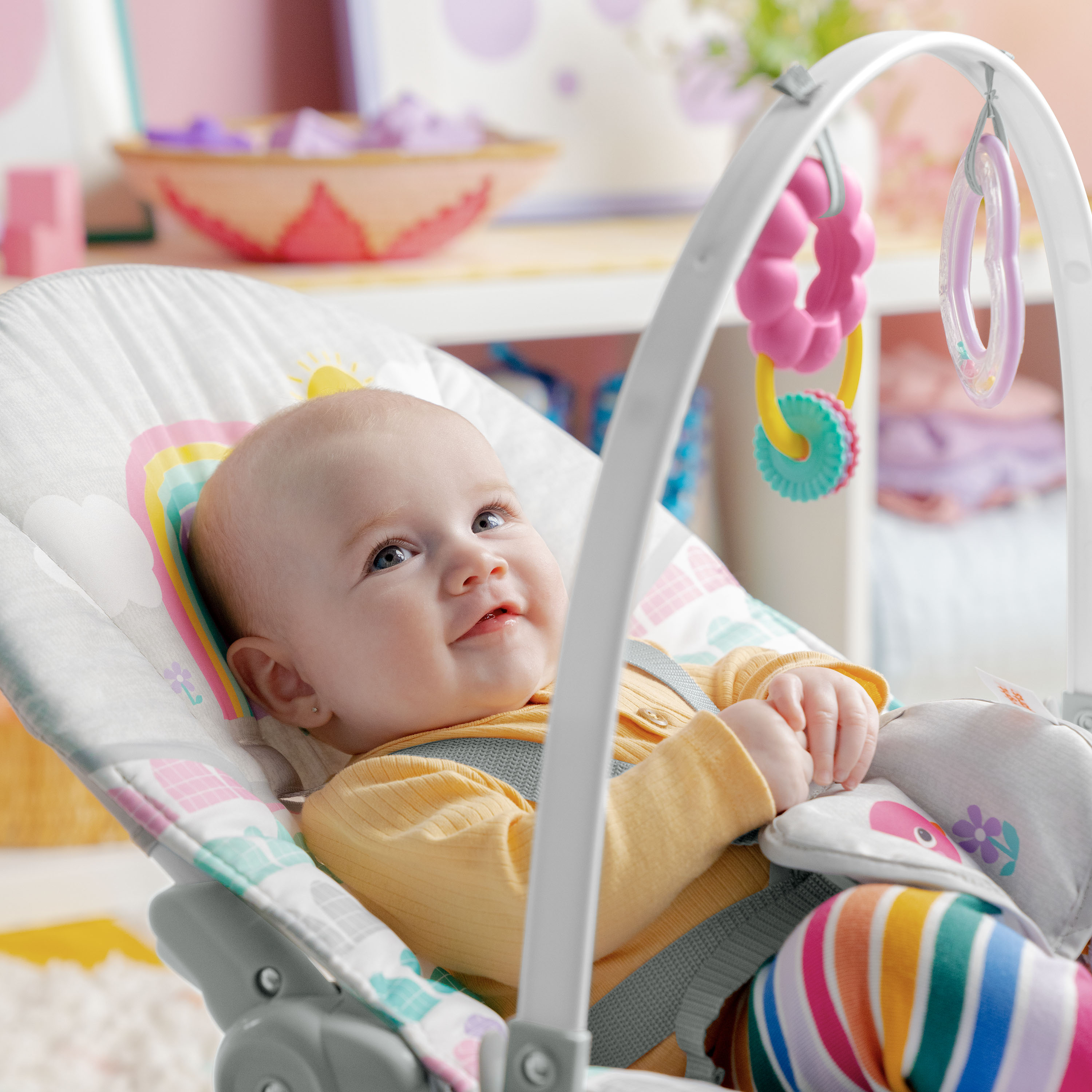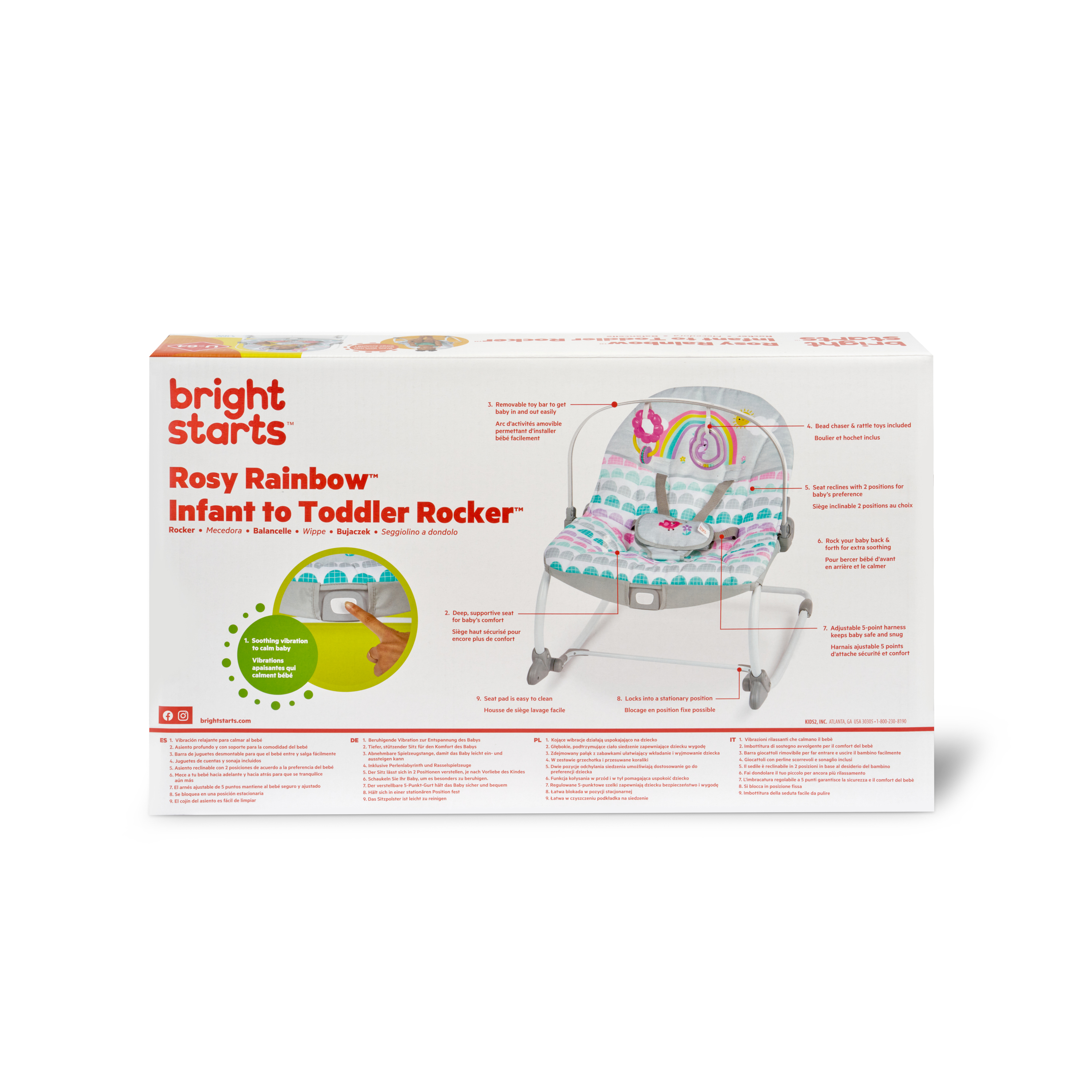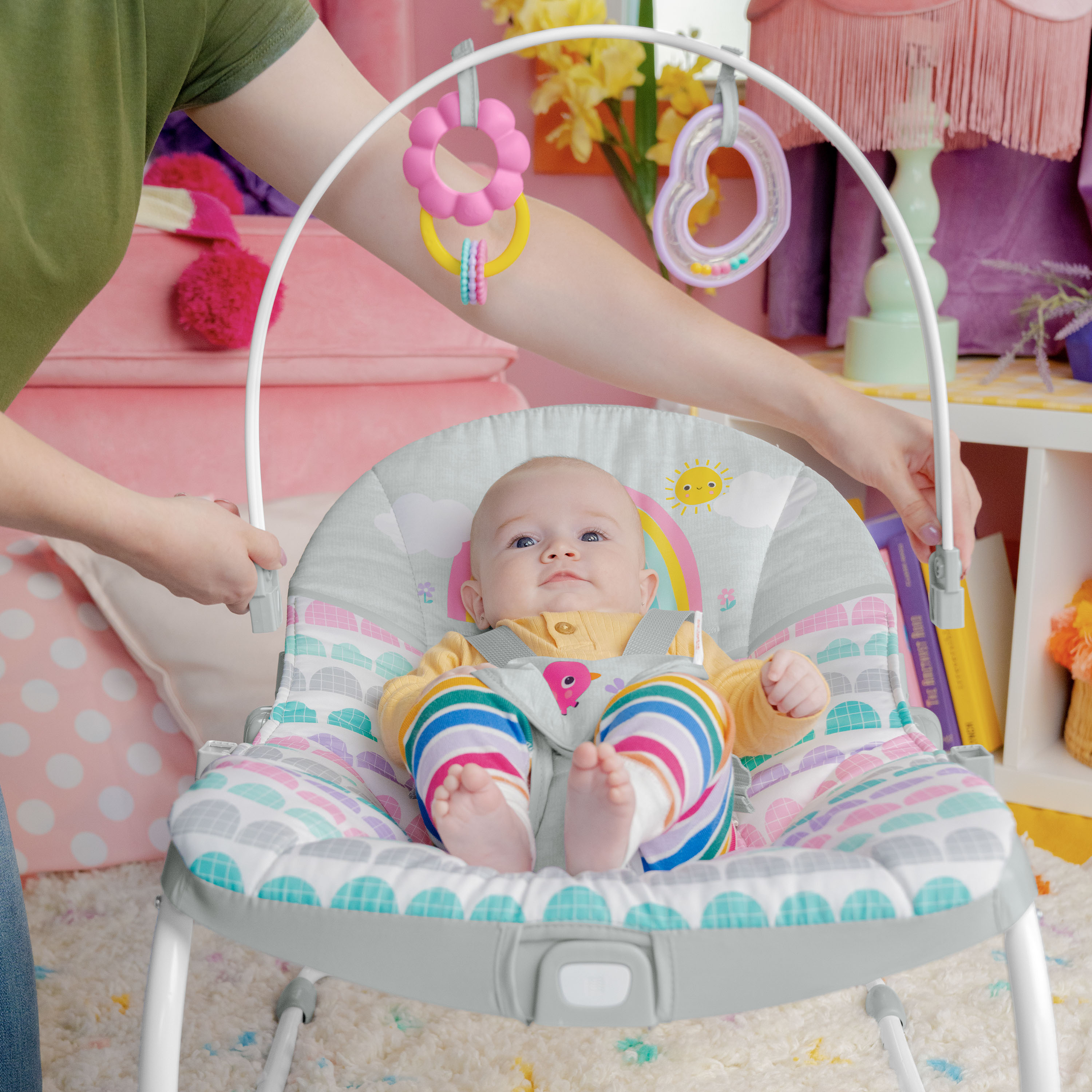 - ¡Años de diversión gracias a este polivalente asiento! La hamaca Rosy Rainbow de Bright Starts se transforma en asiento fijo y crece junto a tu bebé hasta que alcanza los 18 kg. Su soporte delantero permite transformarla de hamaca en asiento fijo