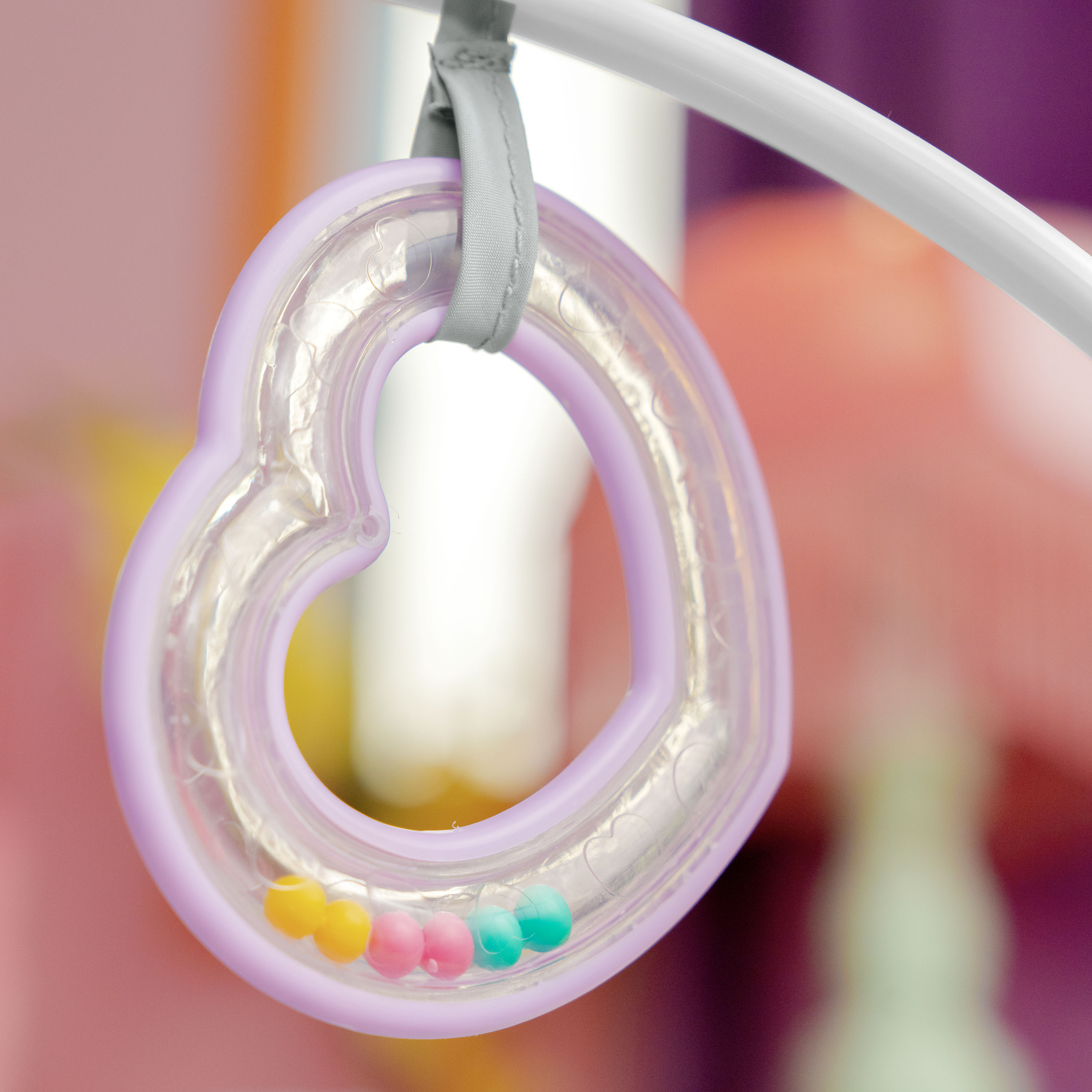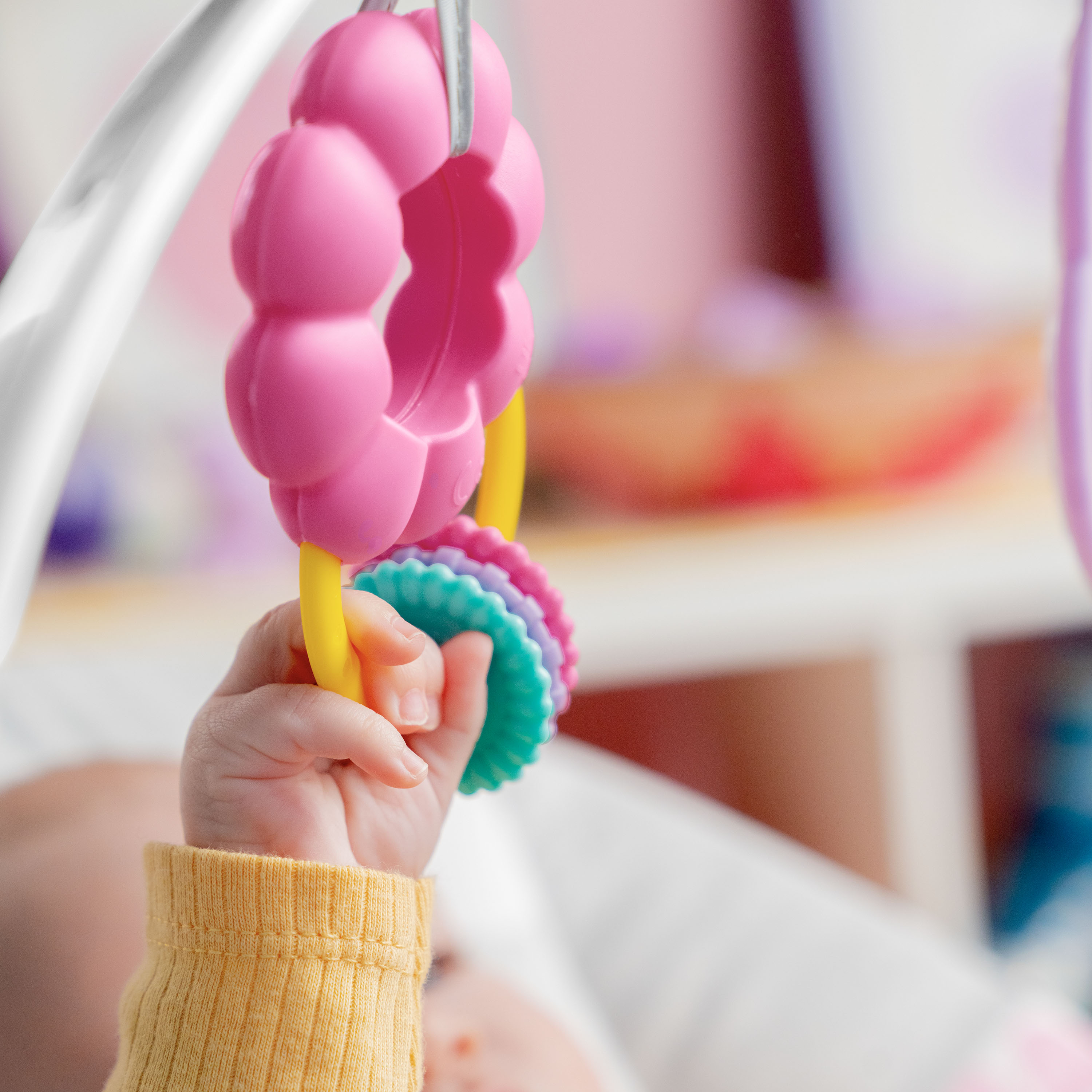 - Su divertido arco de actividades le presenta el juego interactivo. Incluye un sonajero multicolor con forma de corazón y un colgante-flor para fomentar el movimiento de manos y brazos y las habilidades motoras gruesas. El arco de actividades puede quitarse fácilmente para que puedas sentar y coger al bebé sin ningún problema