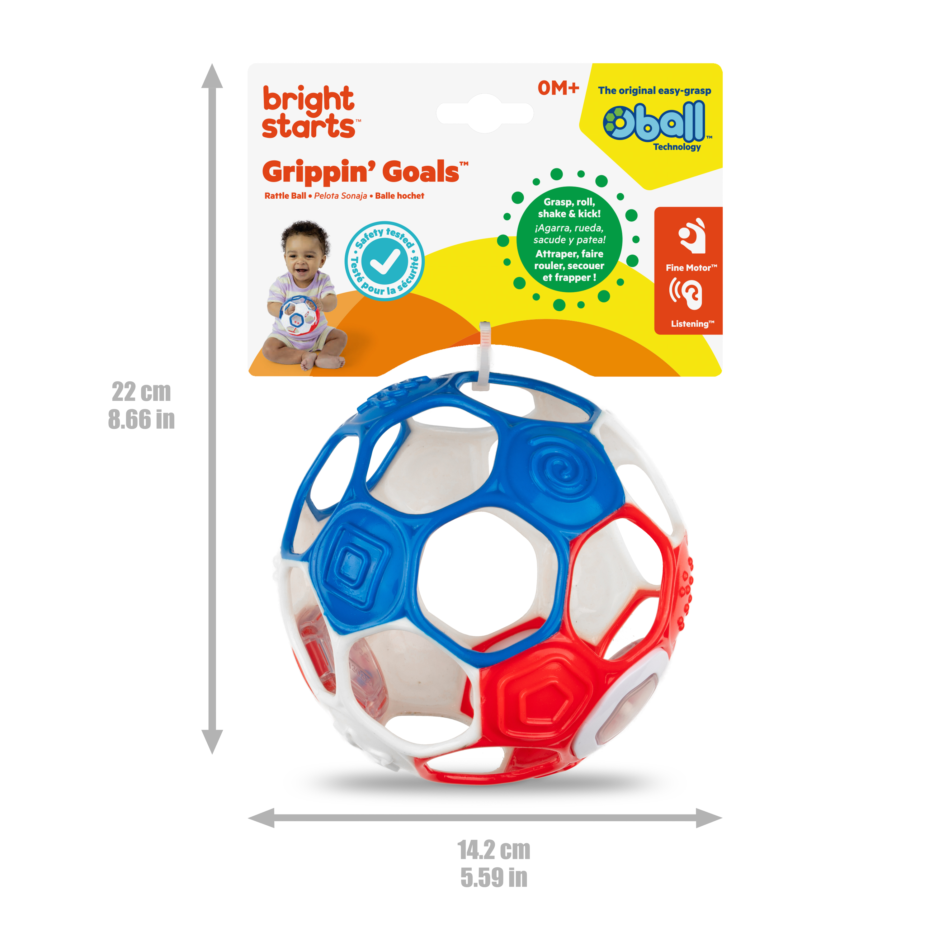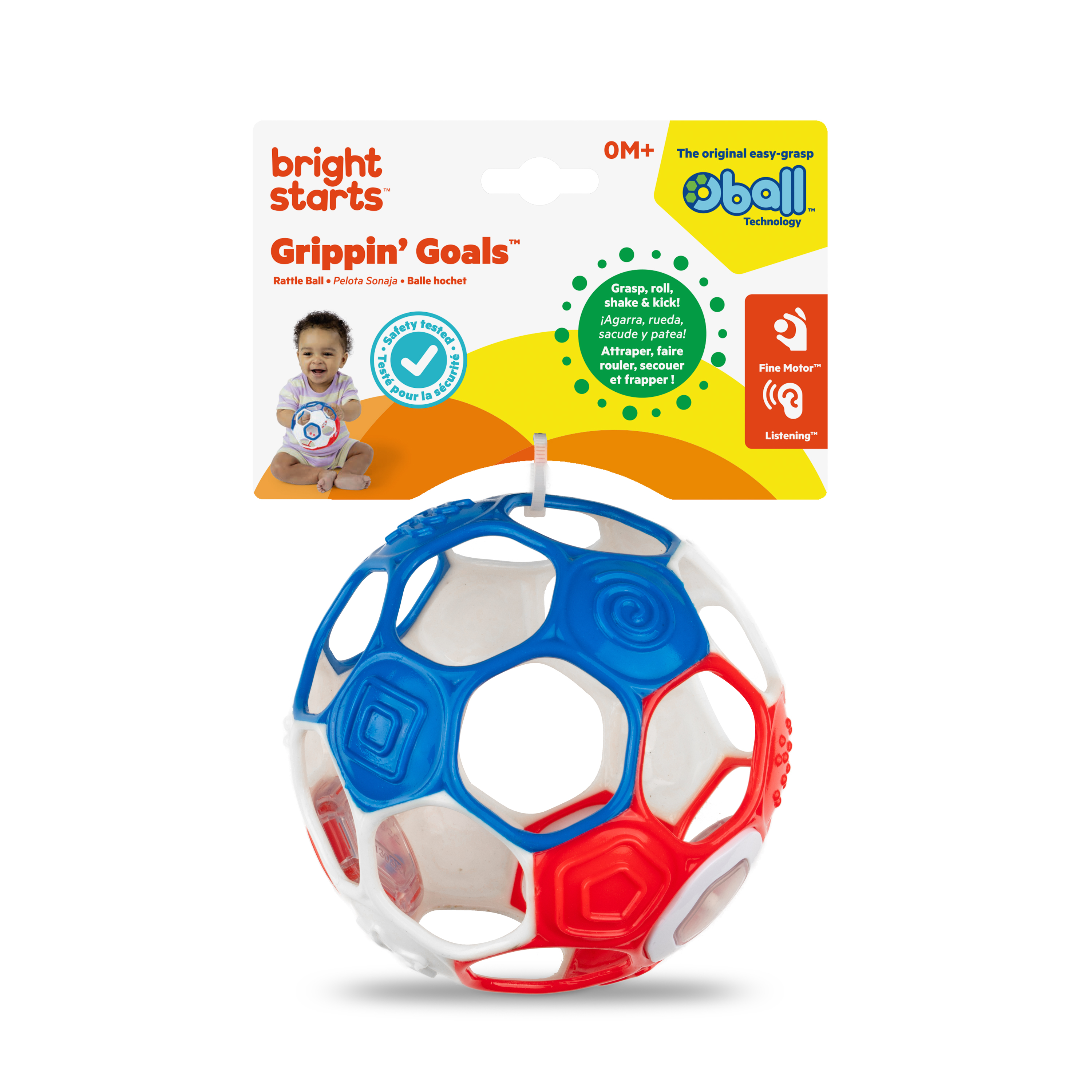 - ¡Grippin' Goals cuenta con la célebre tecnología Oball! La tecnología flexible, duradera y patentada de Bright Starts cuenta con un gran número de orificios para los deditos de tu bebé e incluye elementos de agarre para poder cogerla más fácilmente
