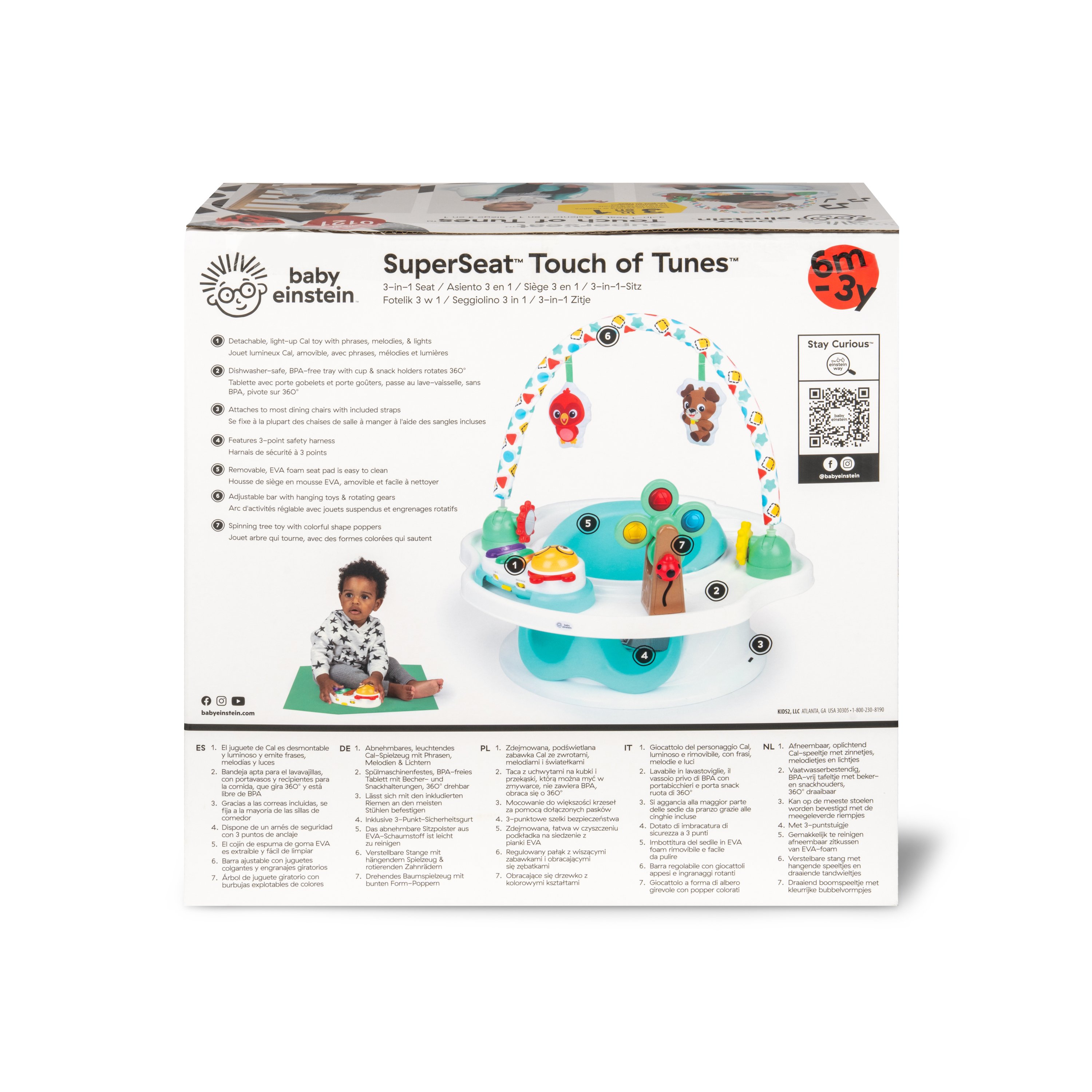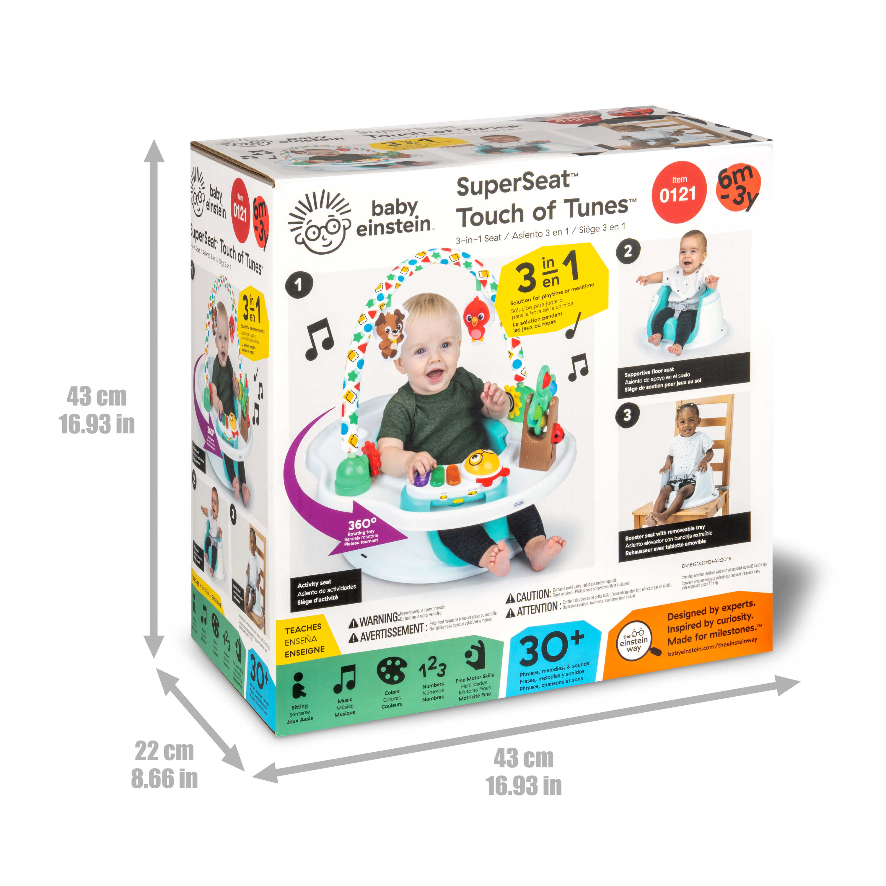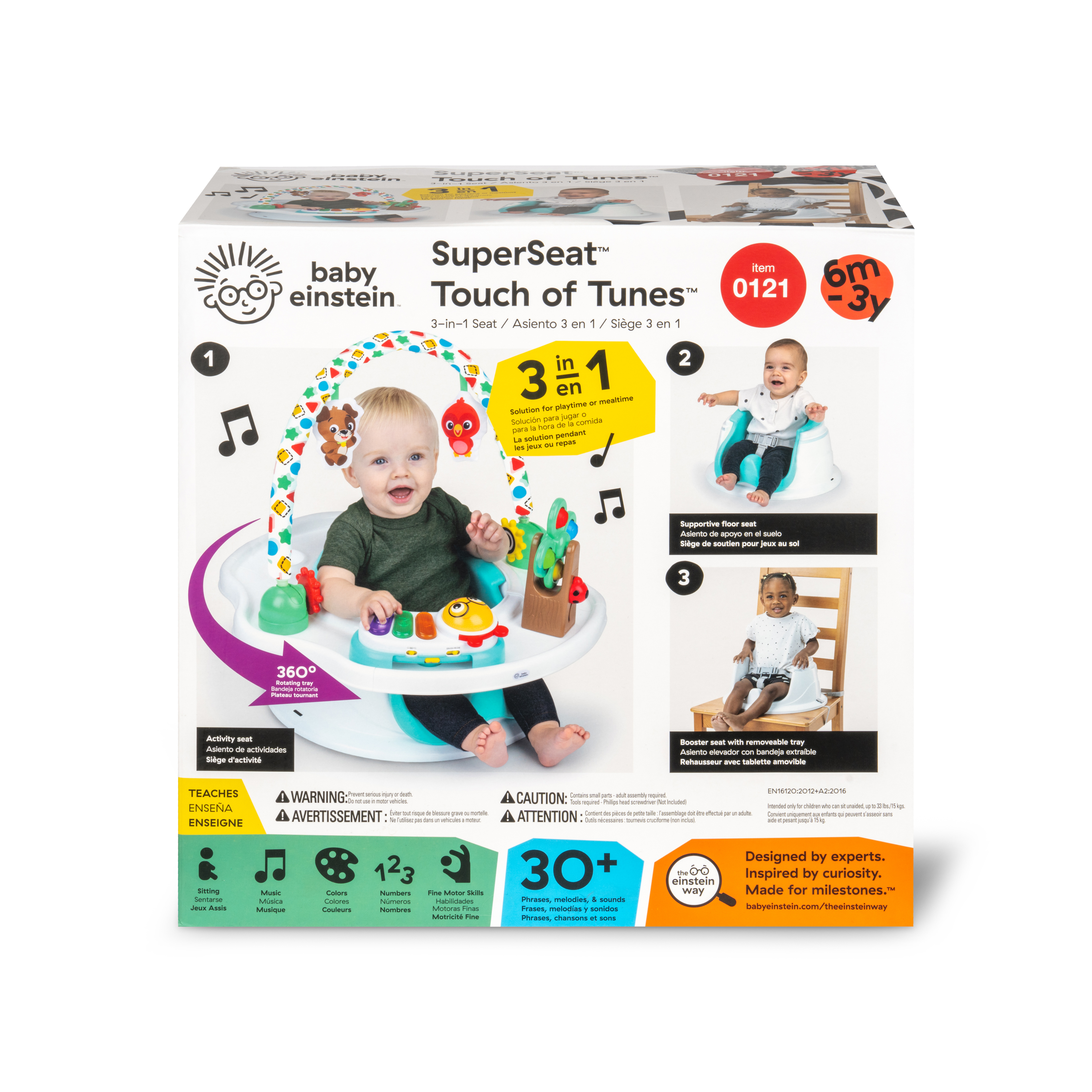 - El asiento 3 en 1 SuperSeat Touch of Tunes de Baby Einstein es un asiento de actividades, un asiento de apoyo en el suelo para la merienda y un asiento elevador diseñado para edades comprendidas entre los 6 meses y los 3 años, con un peso máximo de 15 kilos