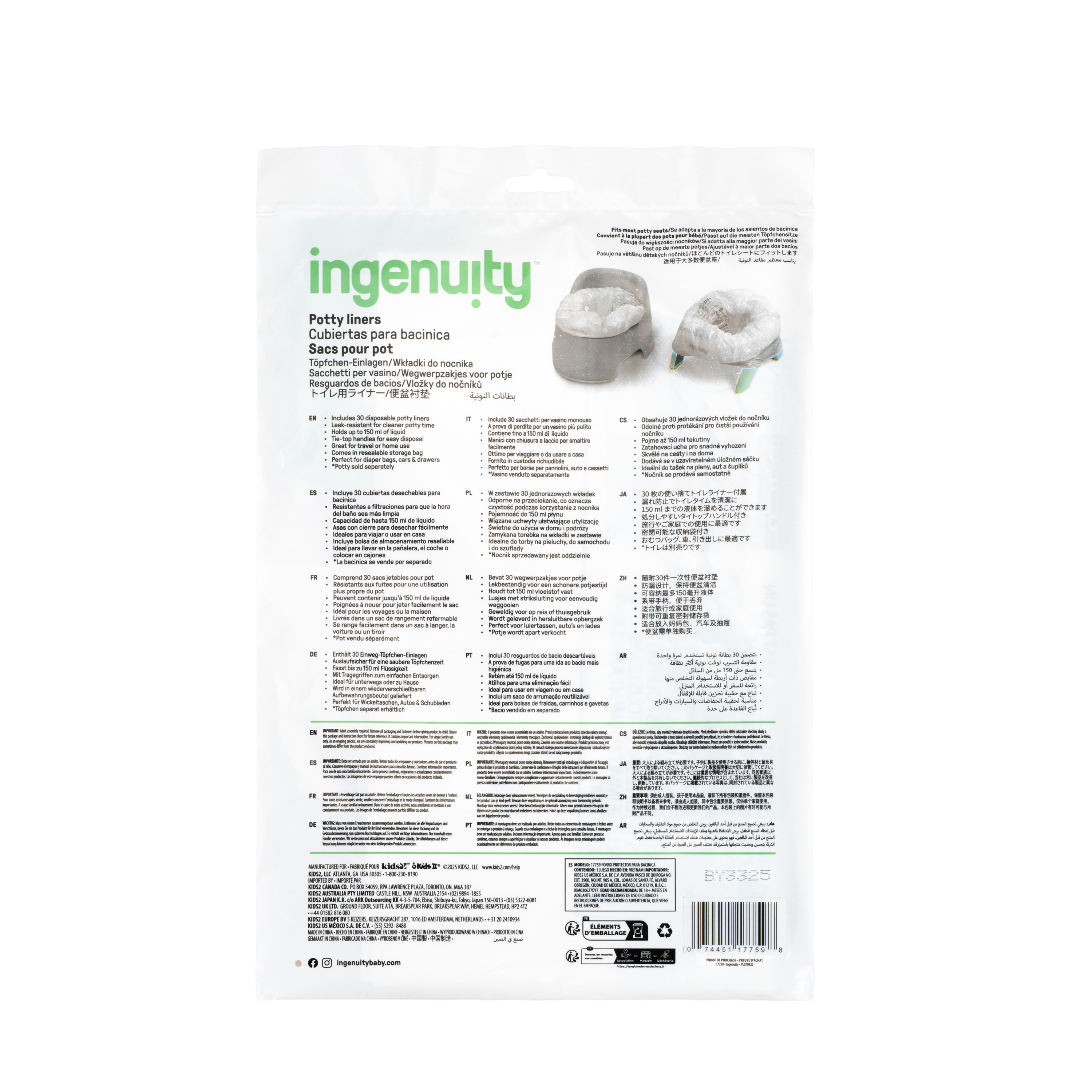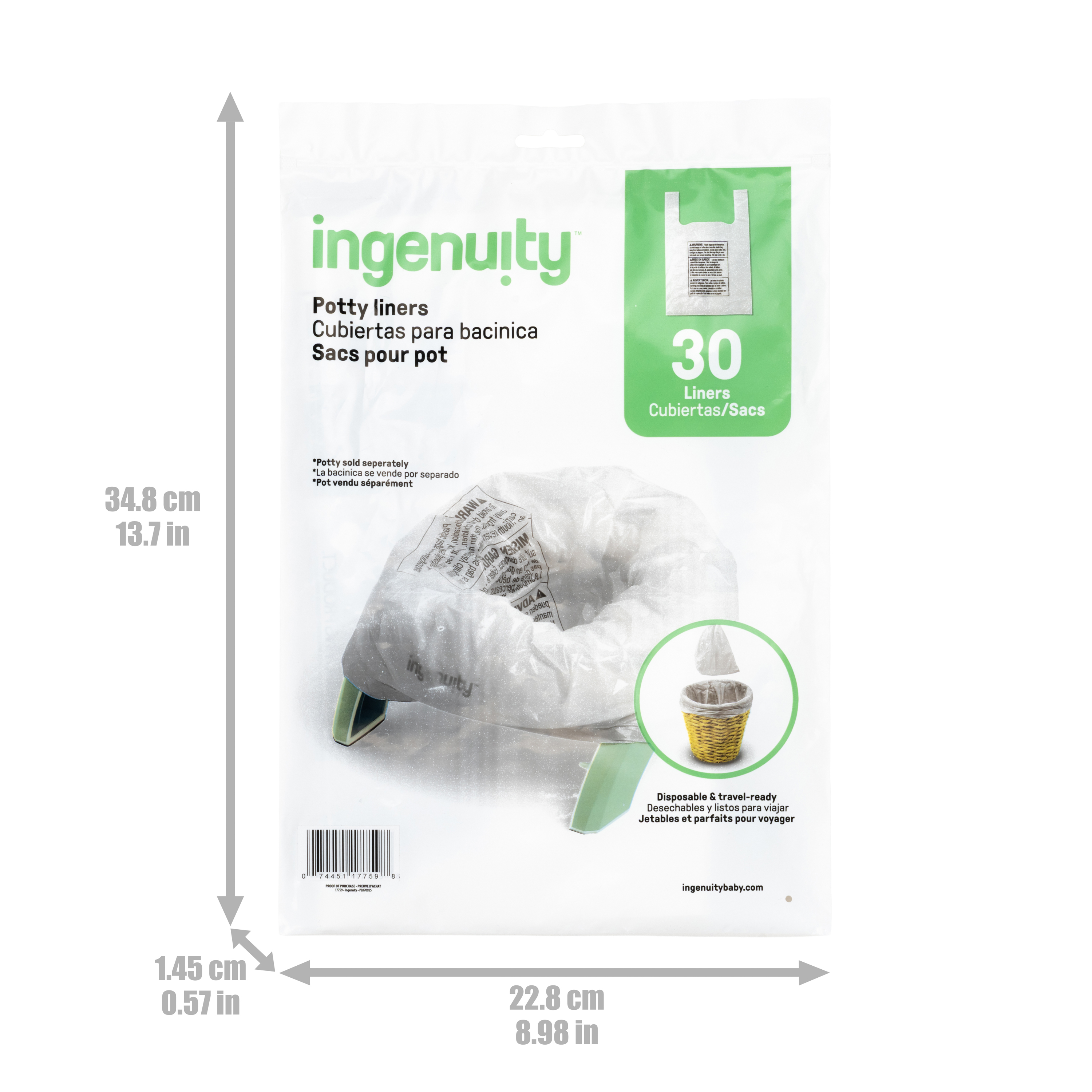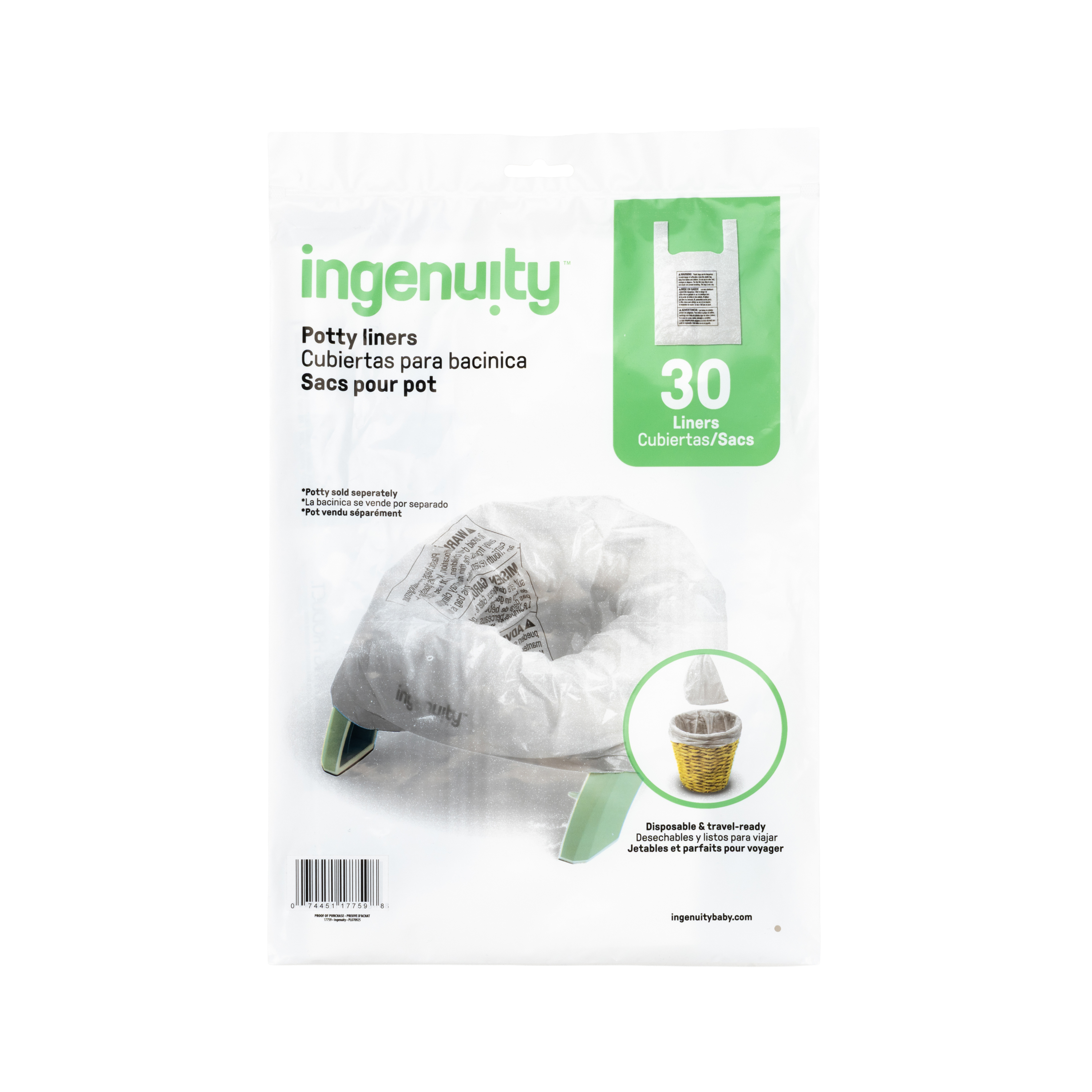 - Incluye 30 forros desechables a prueba de derrames, diseñados para usarse con la bacinica 2 en 1 My Travel Potty de Ingenuity™ o con la mayoría de los asientos para bacinica, tanto de viaje como para casa.