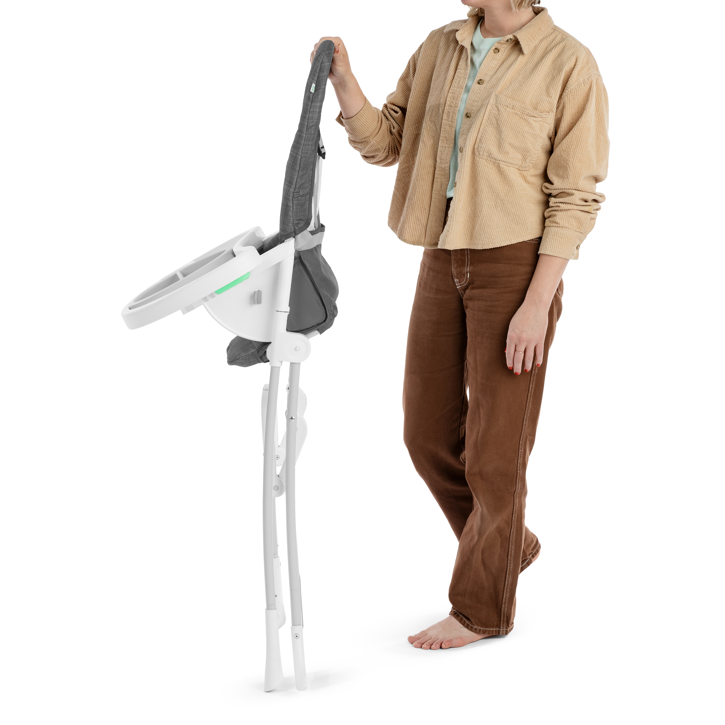- El diseño ligero de esta silla alta para bebé facilita su movilidad por toda la casa. La estilizada silla se sostiene por sí sola cuando está plegada y se pliega para guardarla.
