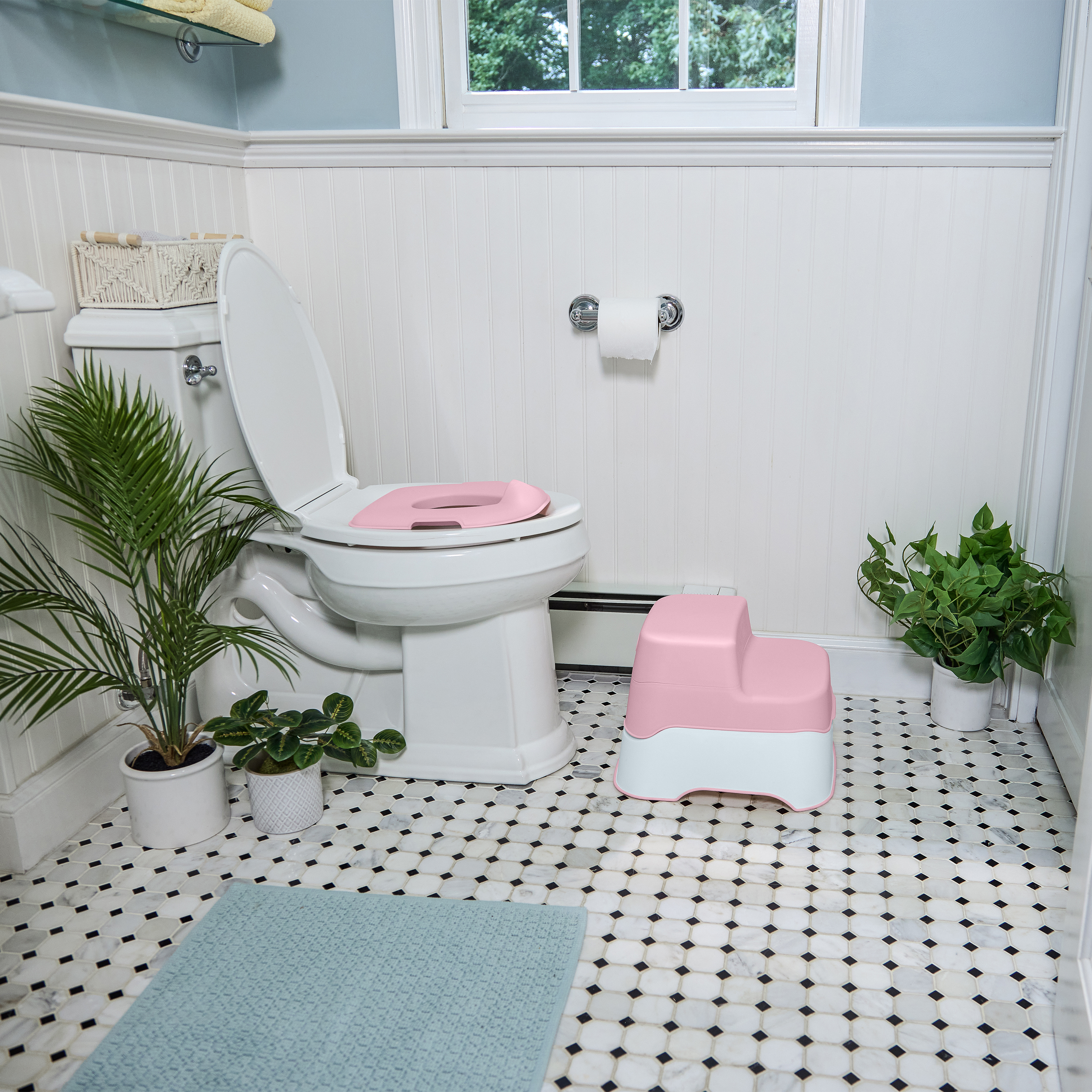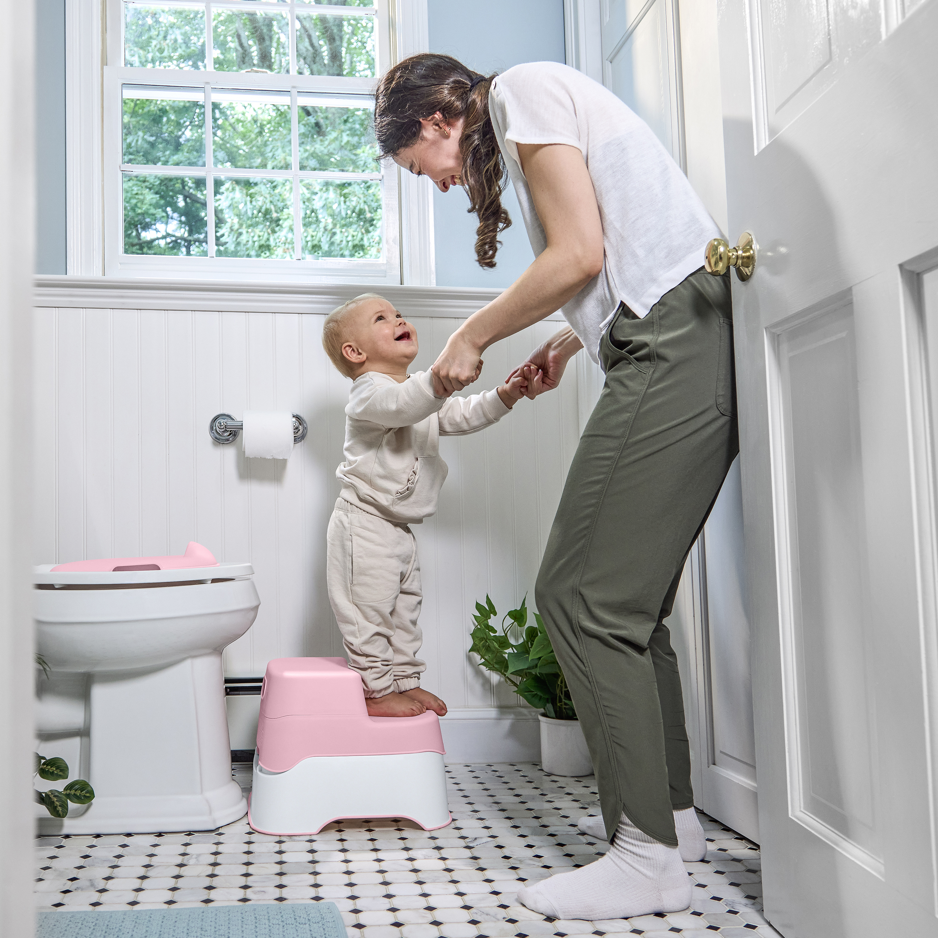 - Por último, cuando tu pequeño esté listo, cierra la tapa para convertir esta tapa en un taburete con dos escalones que le ayudará a llegar a cualquier inodoro y lavabo de tamaño normal para adultos.