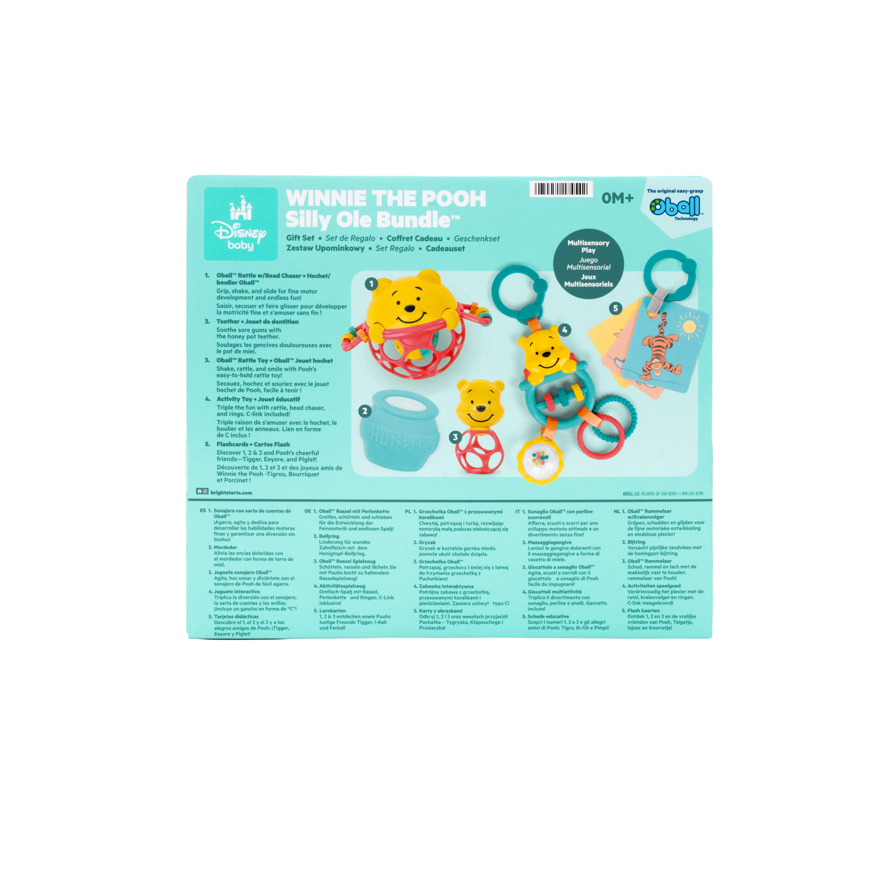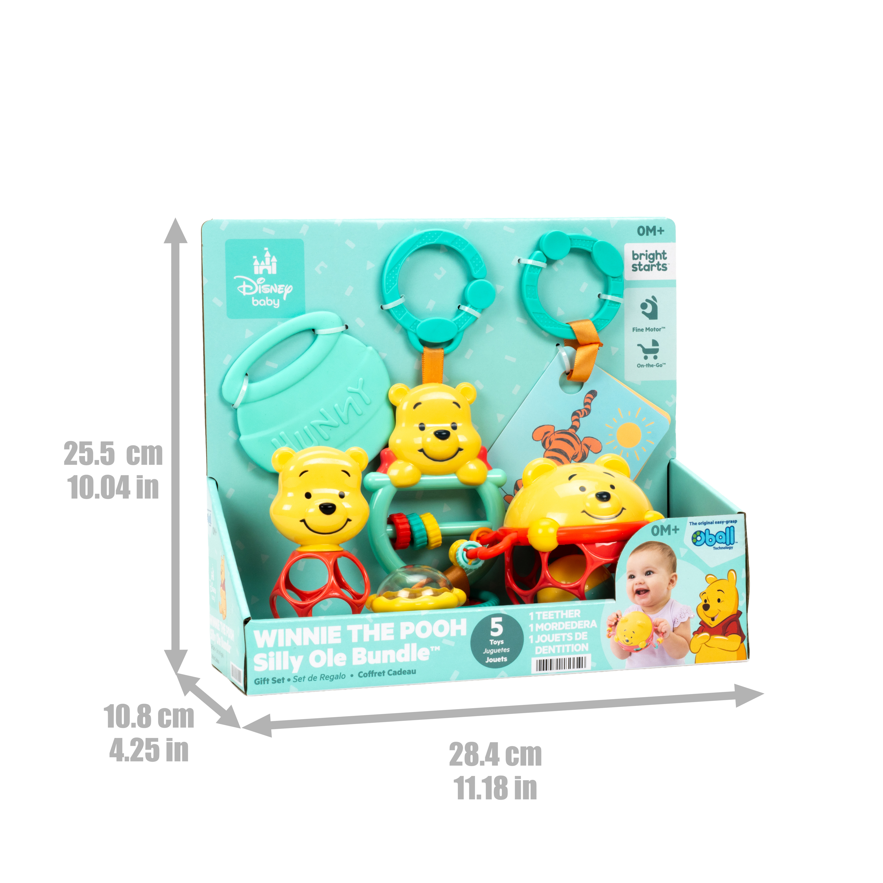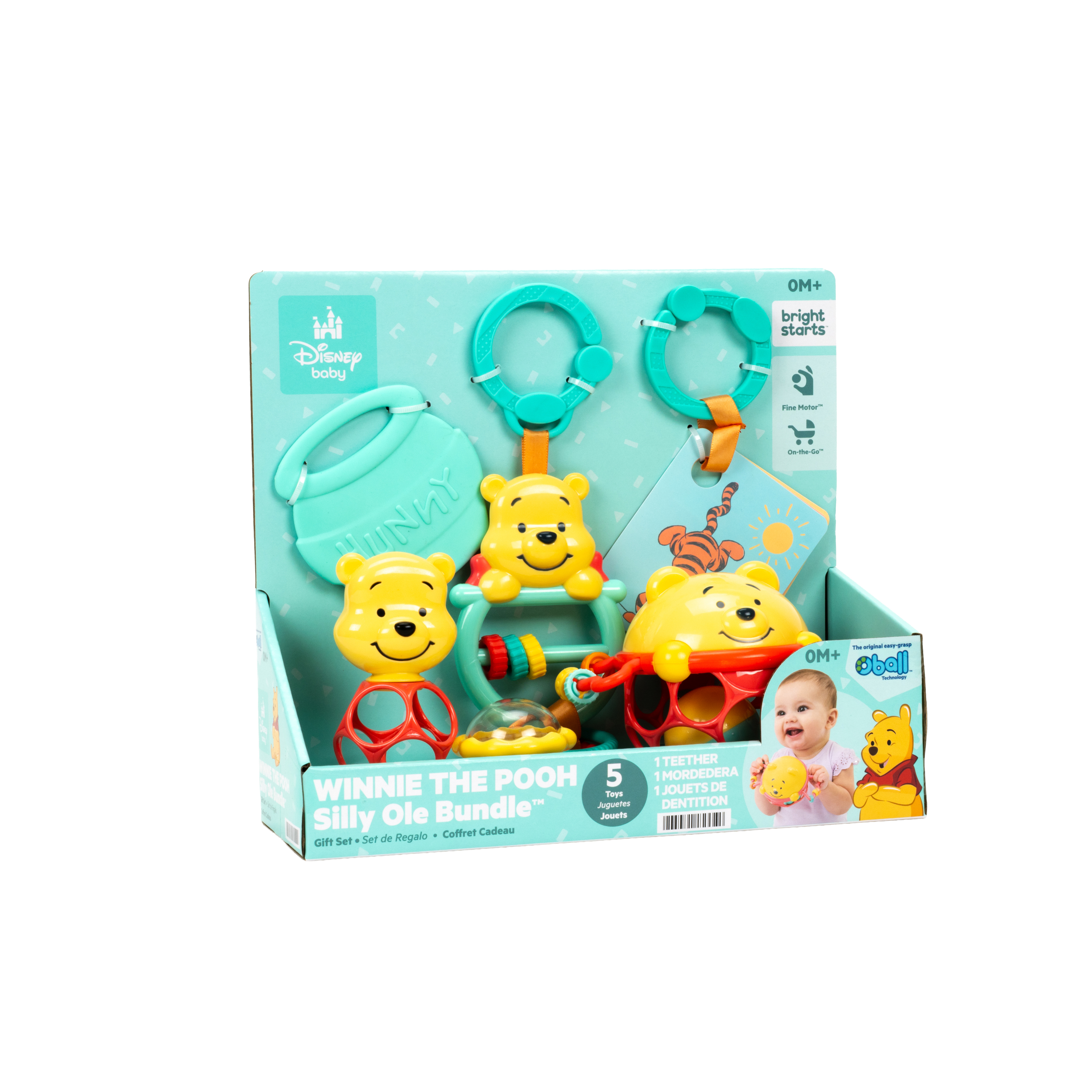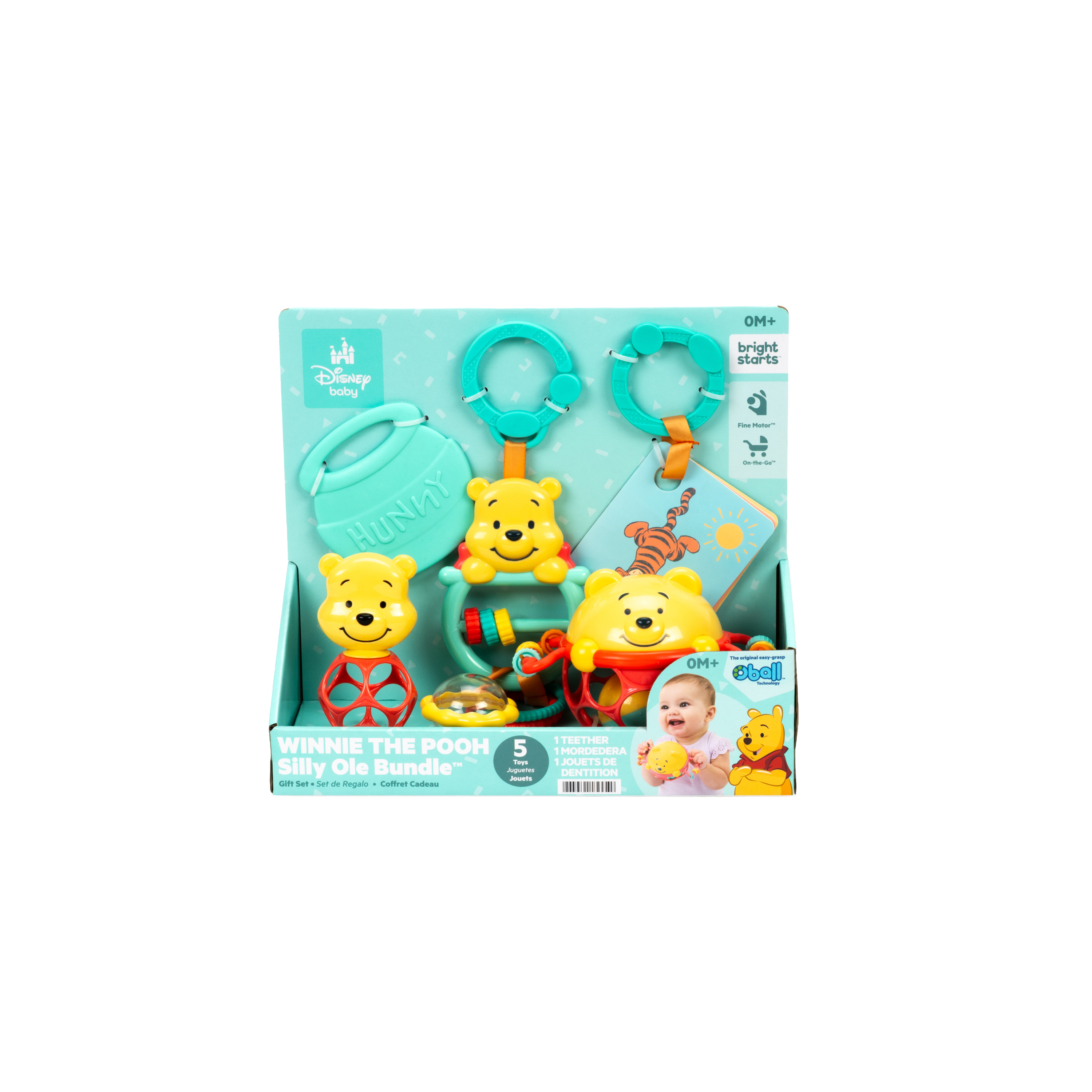 - El set de regalo Disney Baby Winnie the Pooh de Bright Starts celebra los 100 años de aventuras en el Bosque de los Cien Acres; el set incluye 5 juguetes multisensoriales clásicos para bebés: un juguete interactivo, una pelota Oball, una sonaja, tarjetas didácticas y una mordedera para bebés.