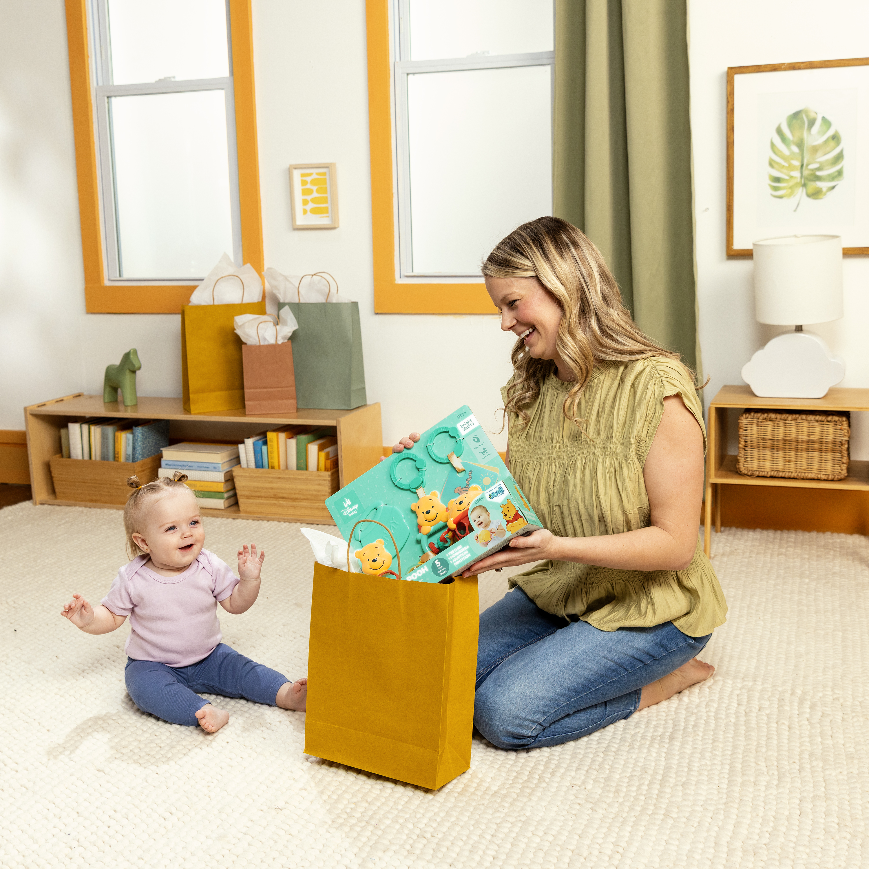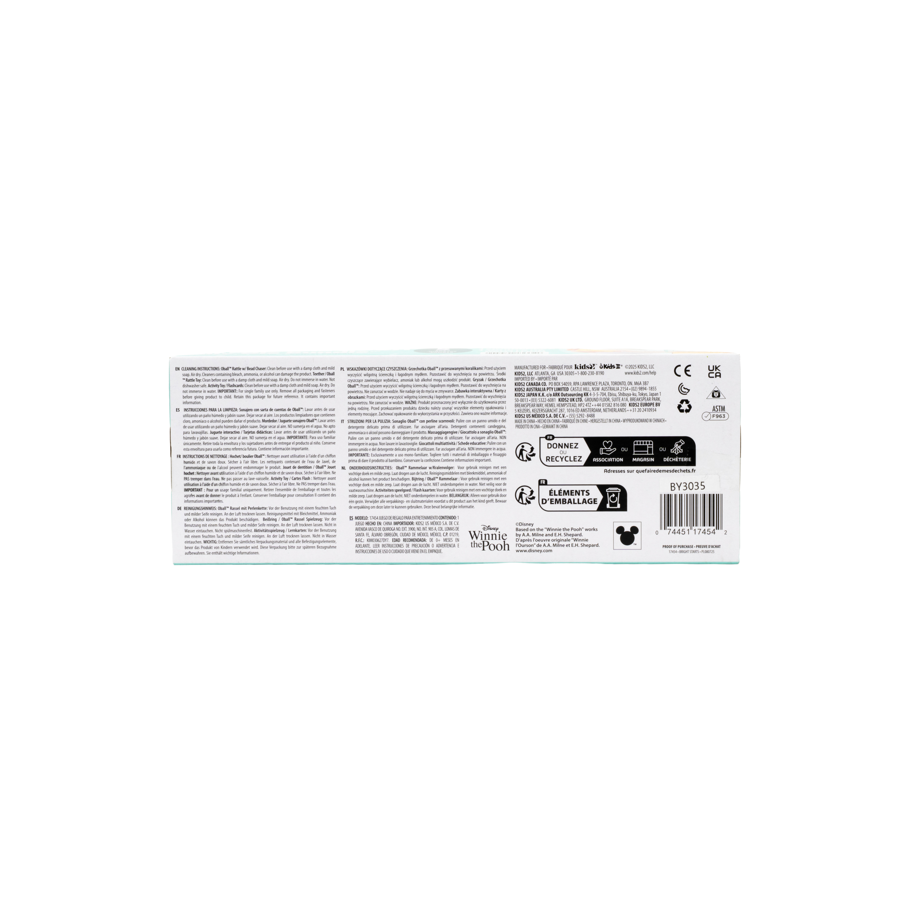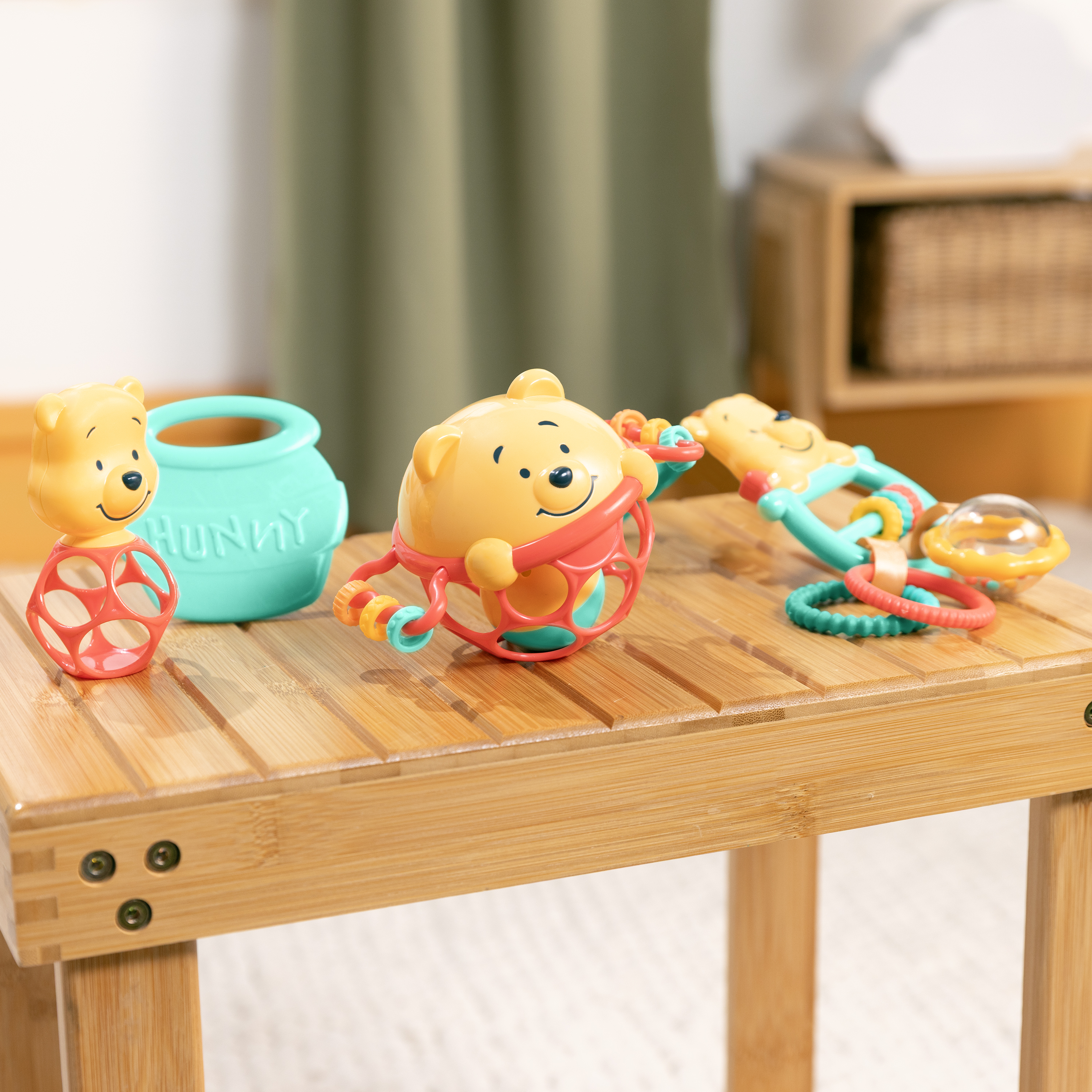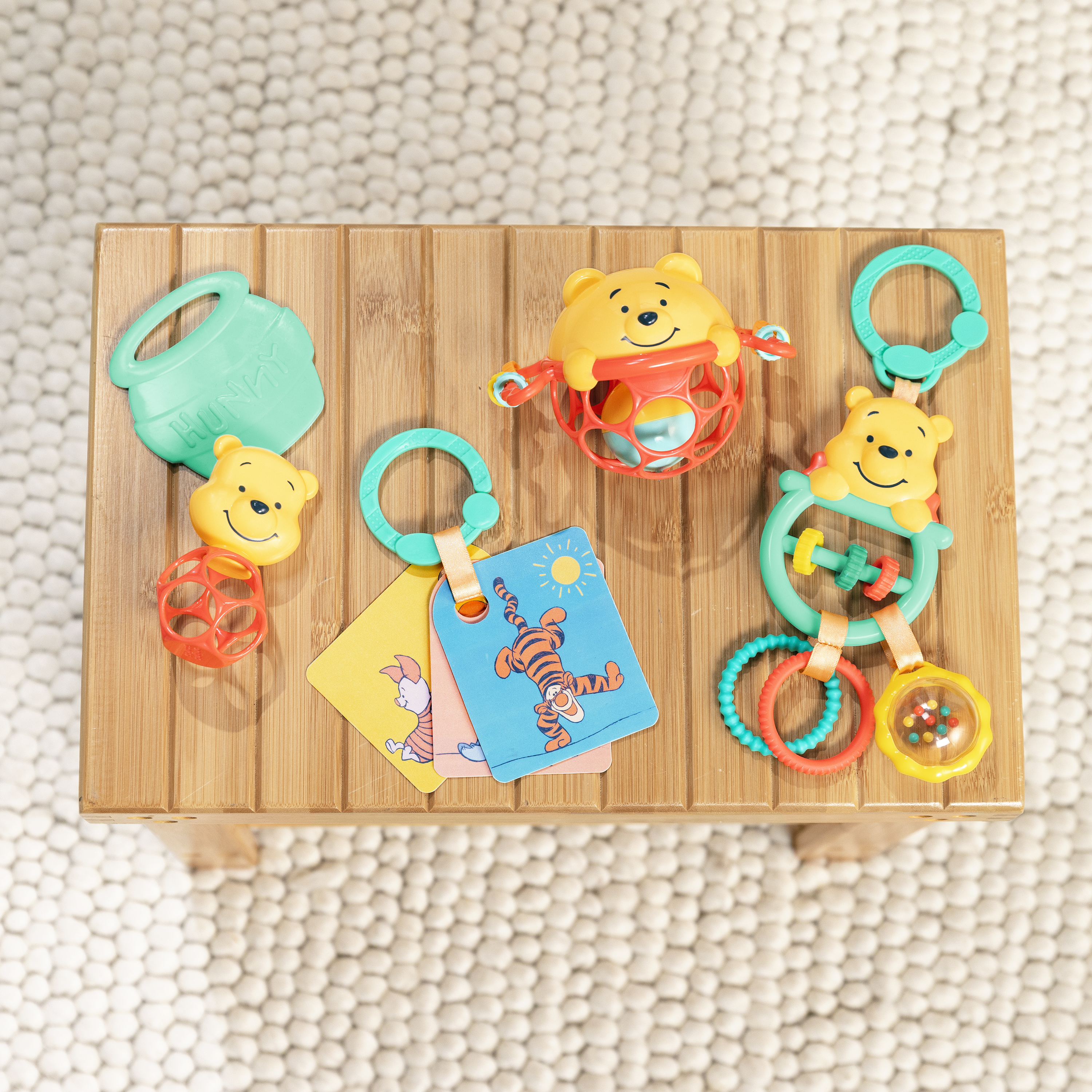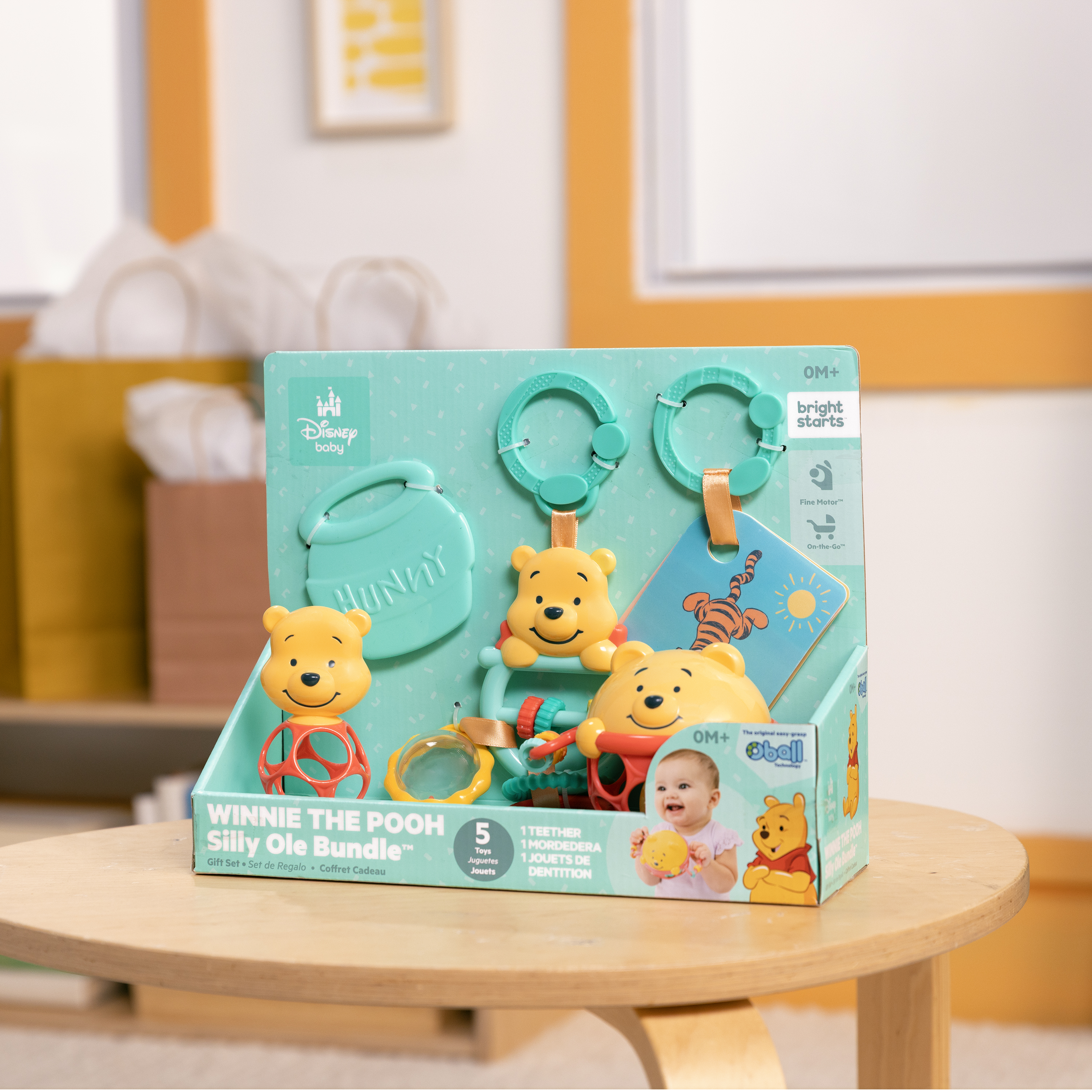 - El set de regalo Disney Baby Winnie the Pooh de Bright Starts celebra los 100 años de aventuras en el Bosque de los Cien Acres; el set incluye 5 juguetes multisensoriales clásicos para bebés: un juguete interactivo, una pelota Oball, una sonaja, tarjetas didácticas y una mordedera para bebés.