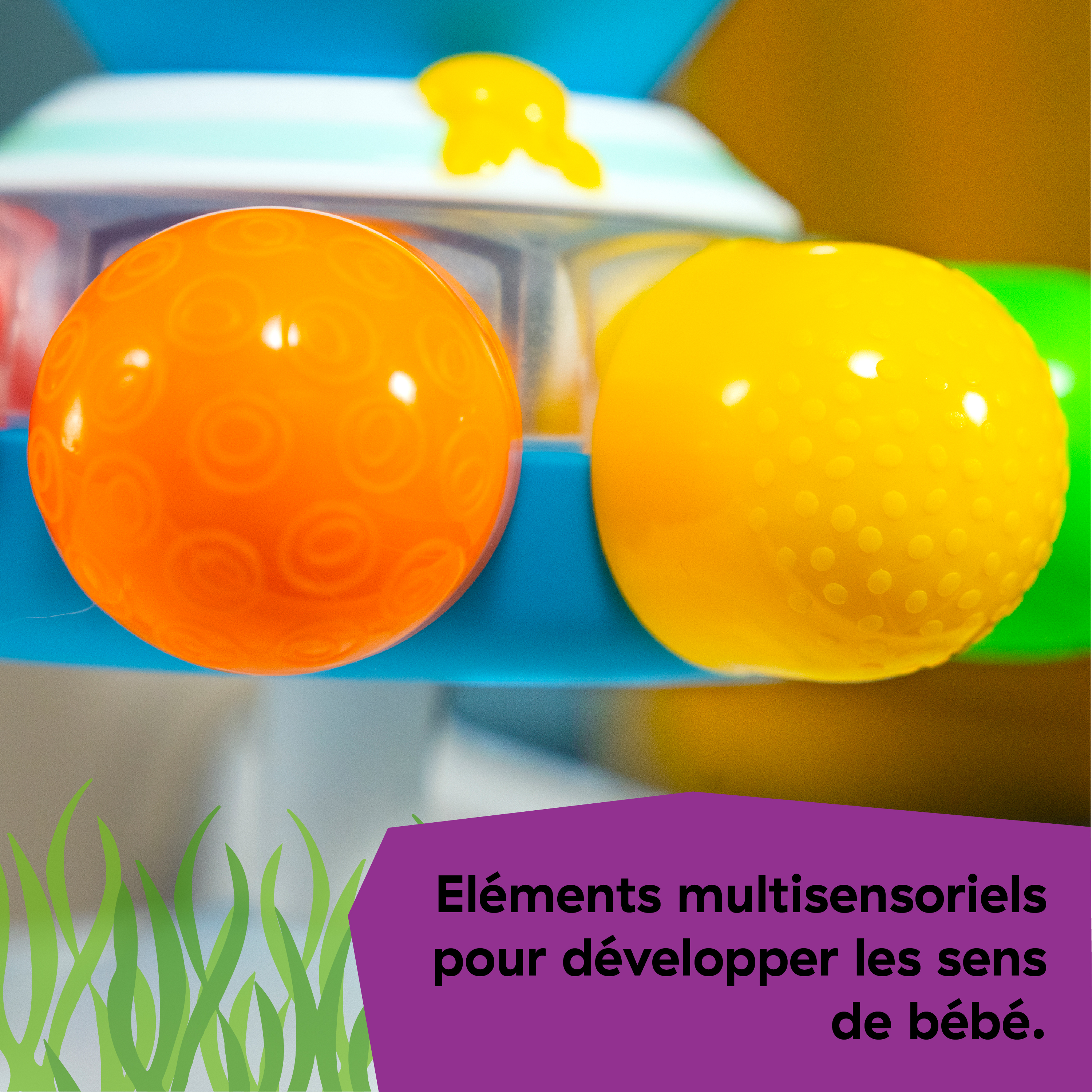 - Découverte cause effet et développement des capacités motrices fines et éveil des sens.