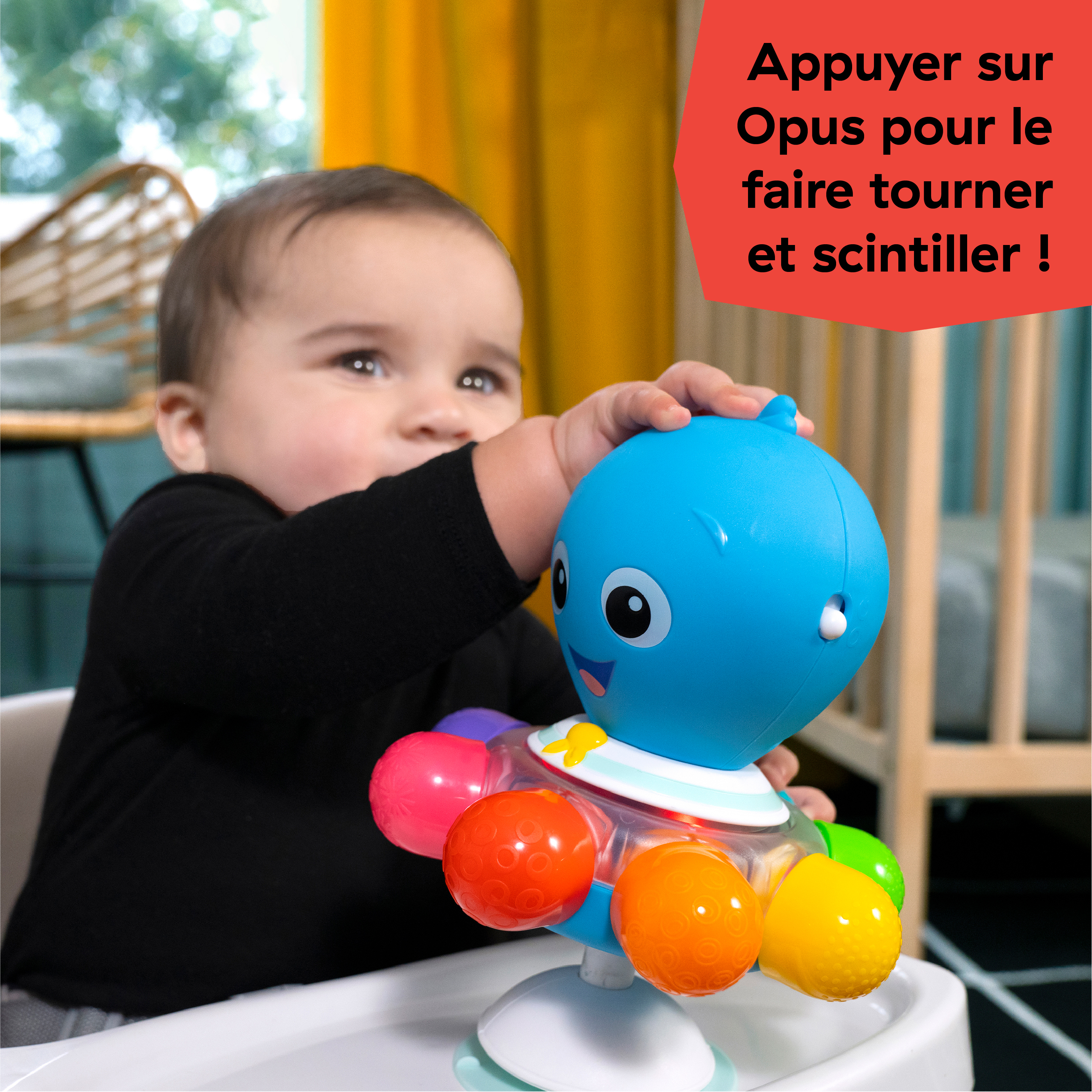 - Avec Opus le Poulpe des séries Ocean Explorers de Baby Einstein. Bébé appuie sur Opus pour faire tourner ses pattes et mettre en marche la fonction lumières. Opus fait un joli bruit de hochet quand bébé le secoue.