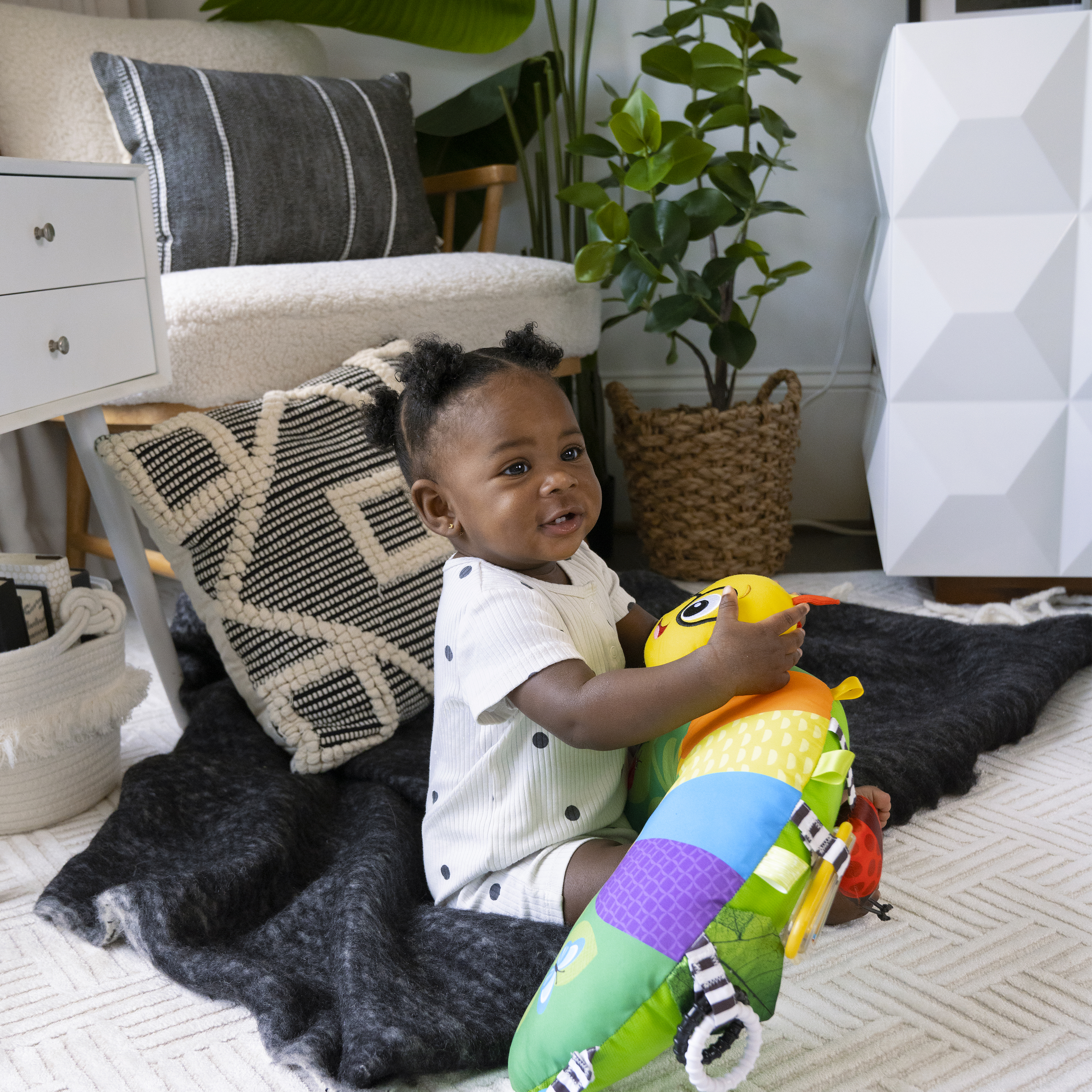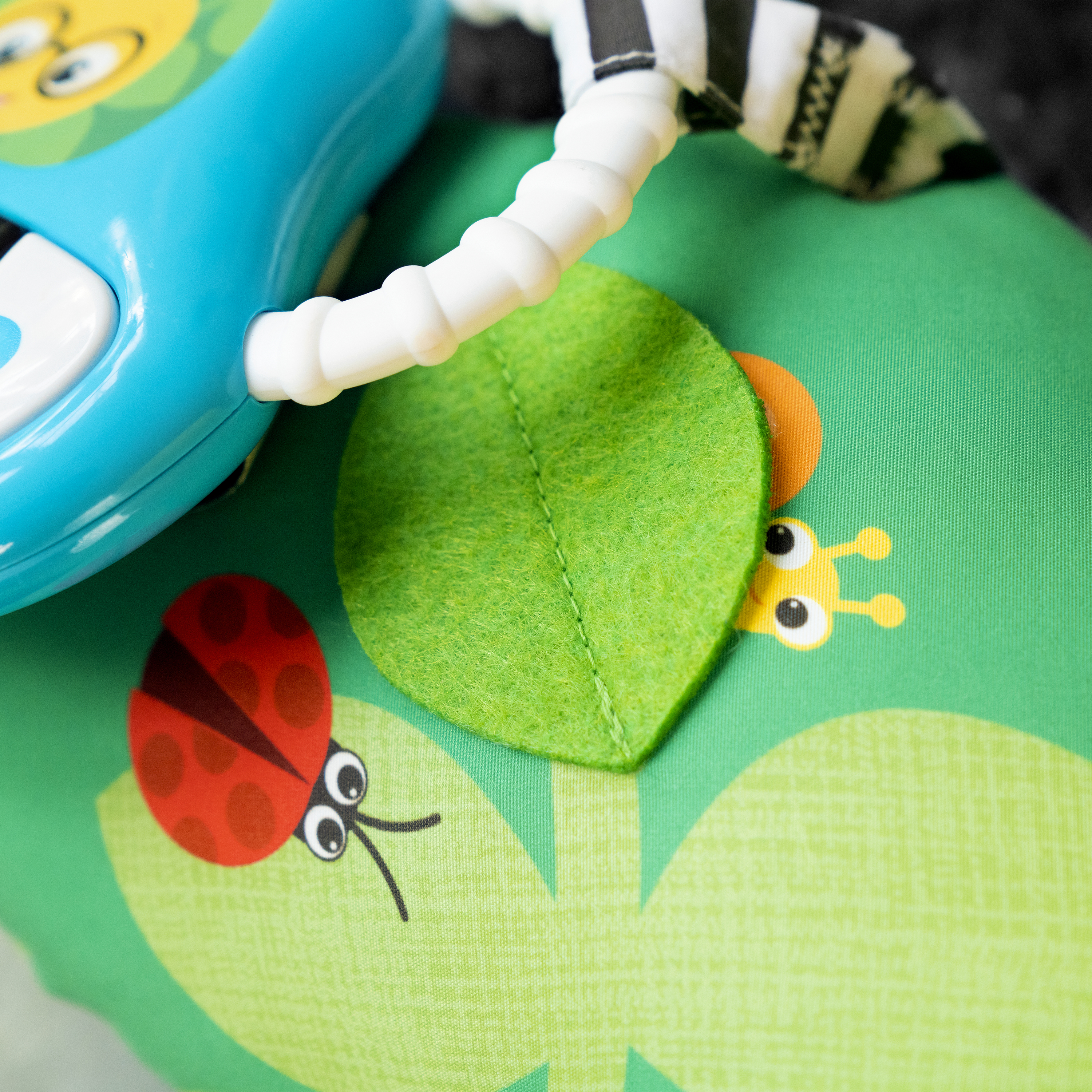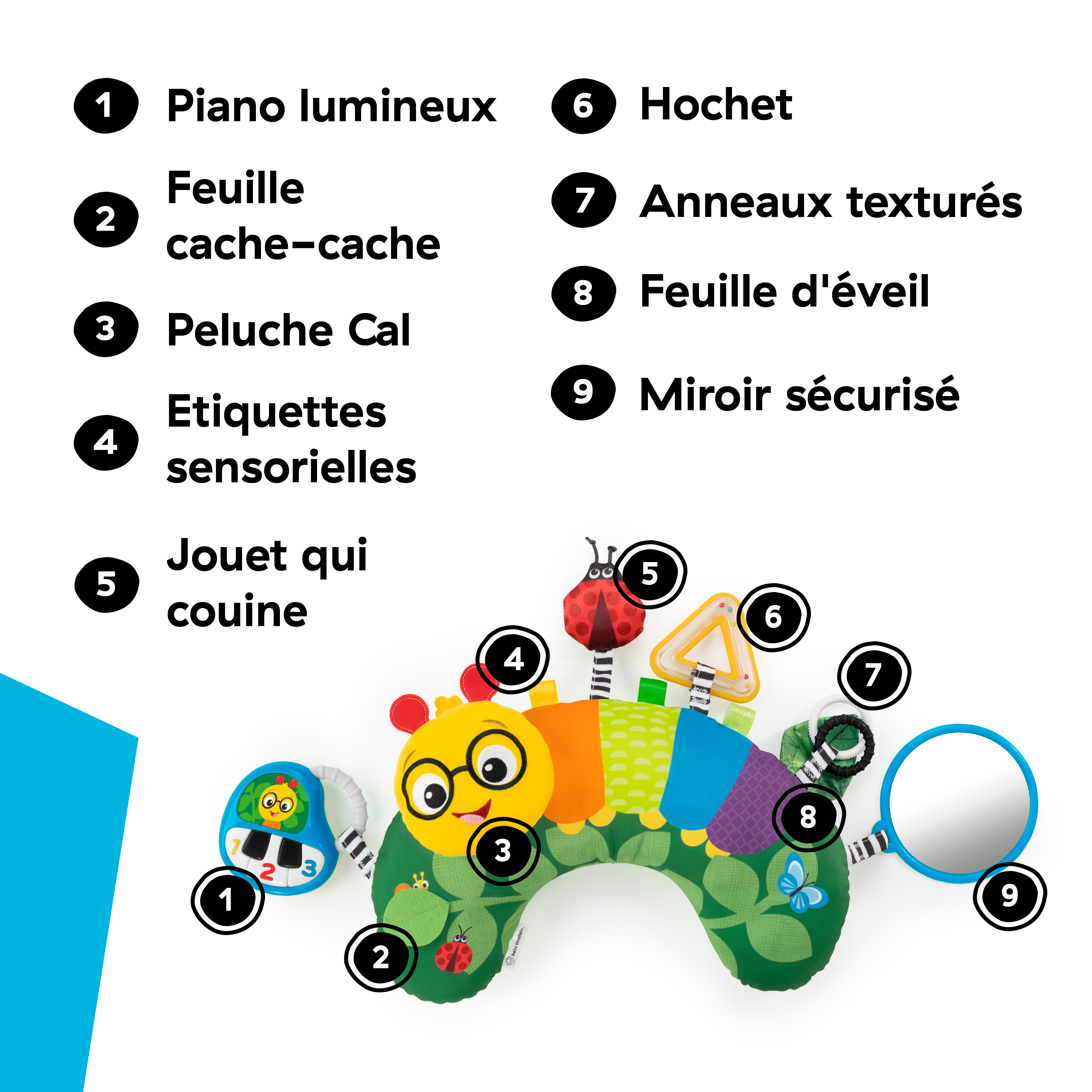 - Avec : haut-parleur coccinelle; piano lumineux et plus de 20 phrases et mélodies, un miroir pour découvrir le reflet, des étiquettes colorées, une feuille avec rabat, une feuille satinée qui crisse, un hochet triangle, des anneaux texturisés et le visage de Cal la chenille.