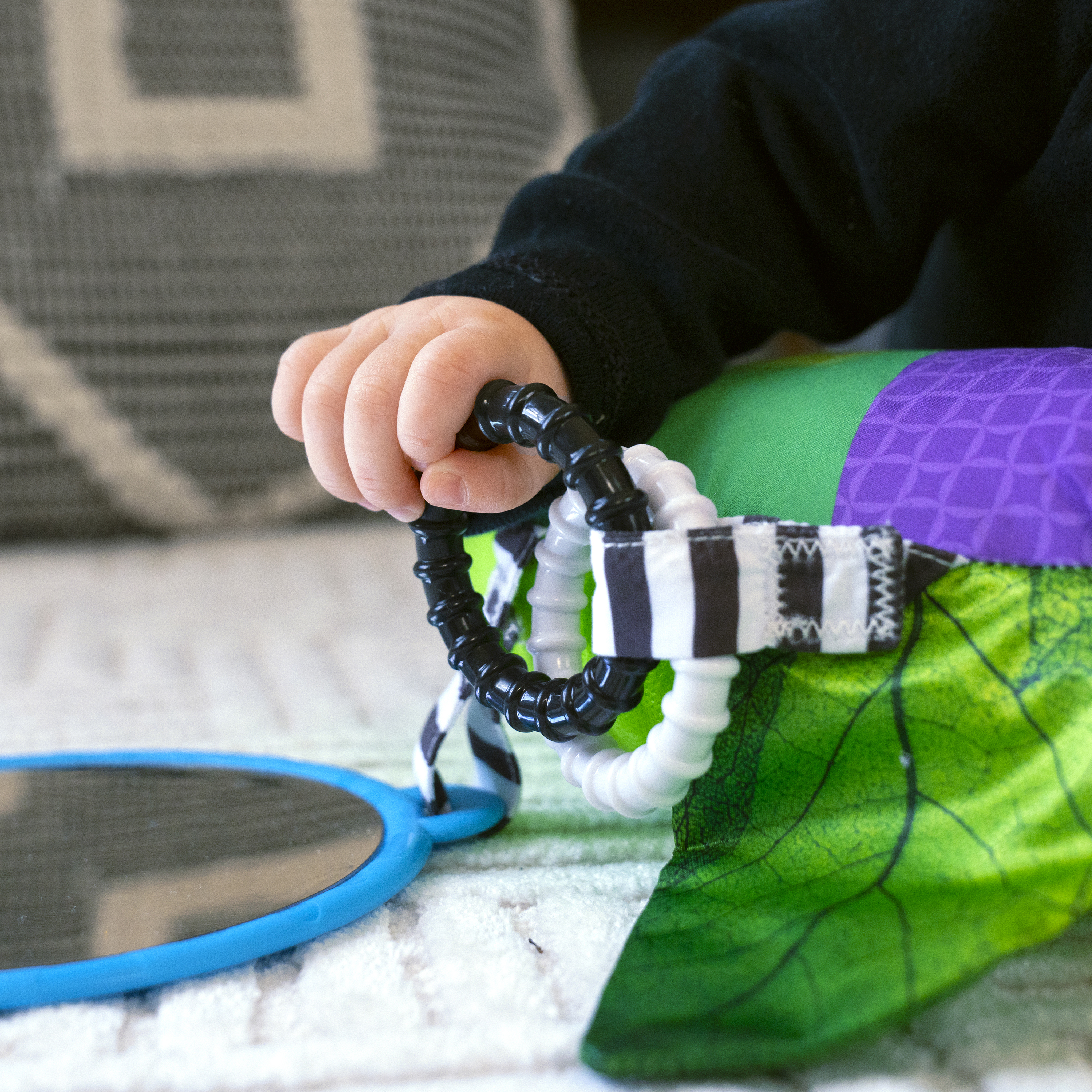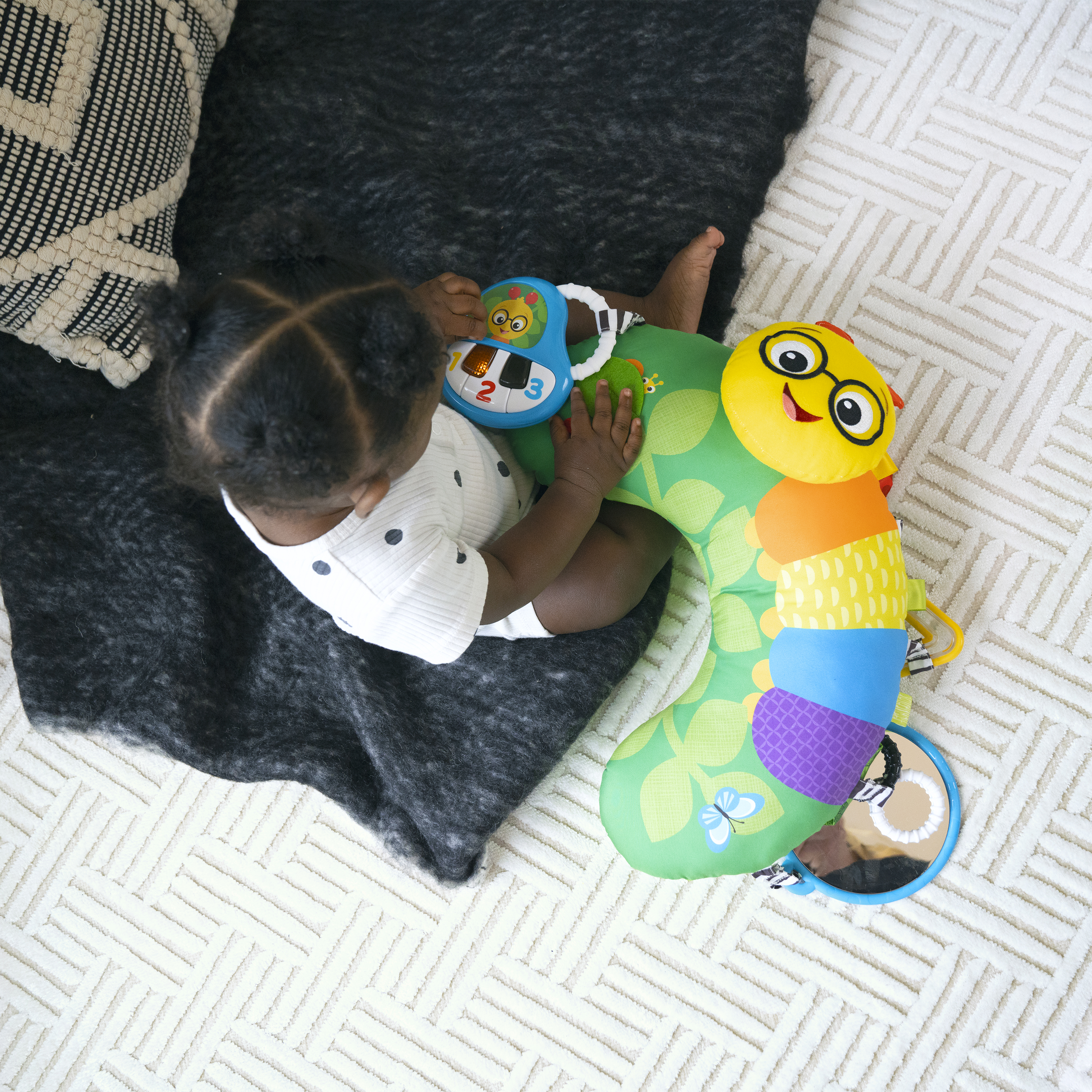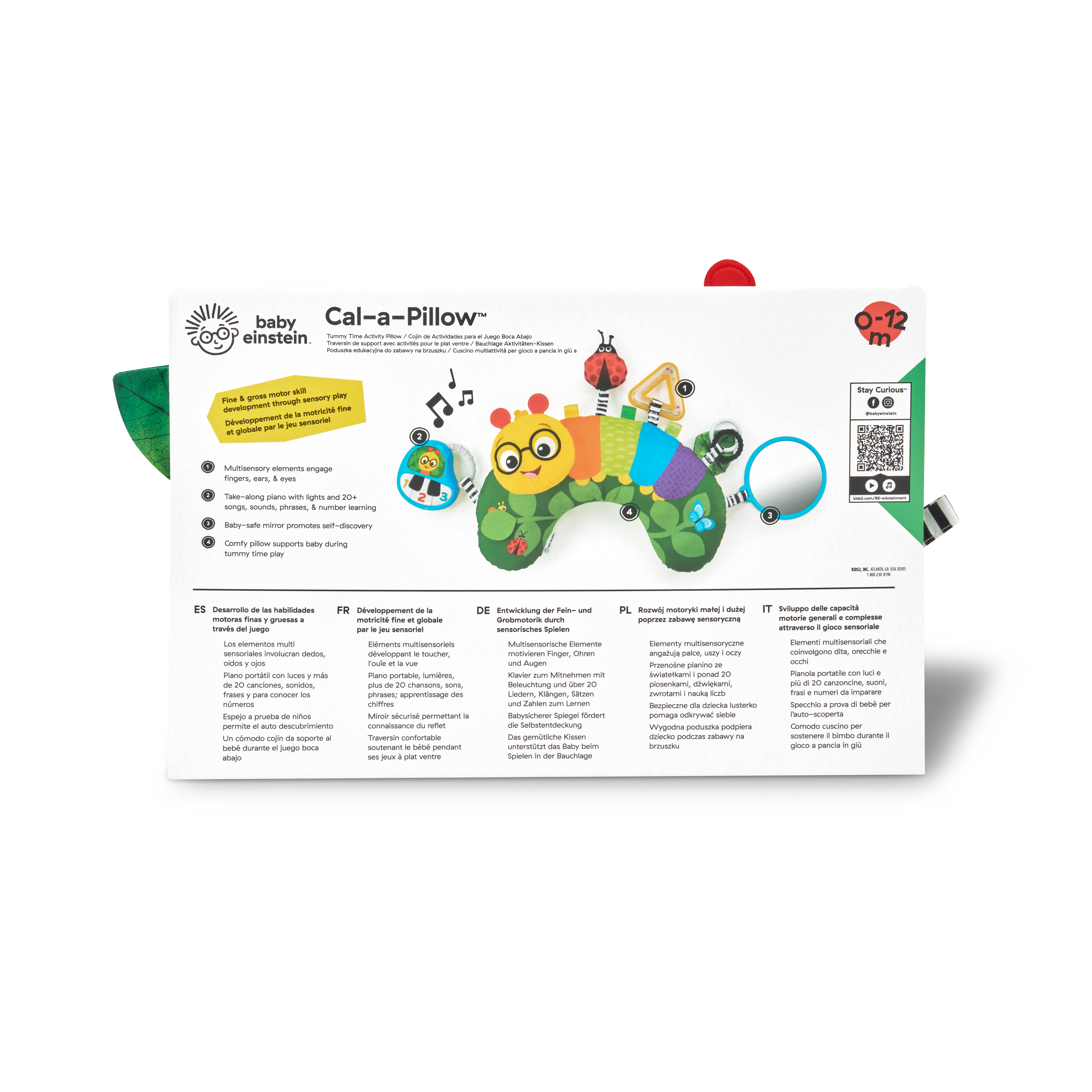 - Coussin d'activités jeux sur le ventre Cal-a-Pillow de Baby Einstein; avec 9 éléments multisensoriels pour aider bébé à développer ses aptitudes motrices fines et globales.