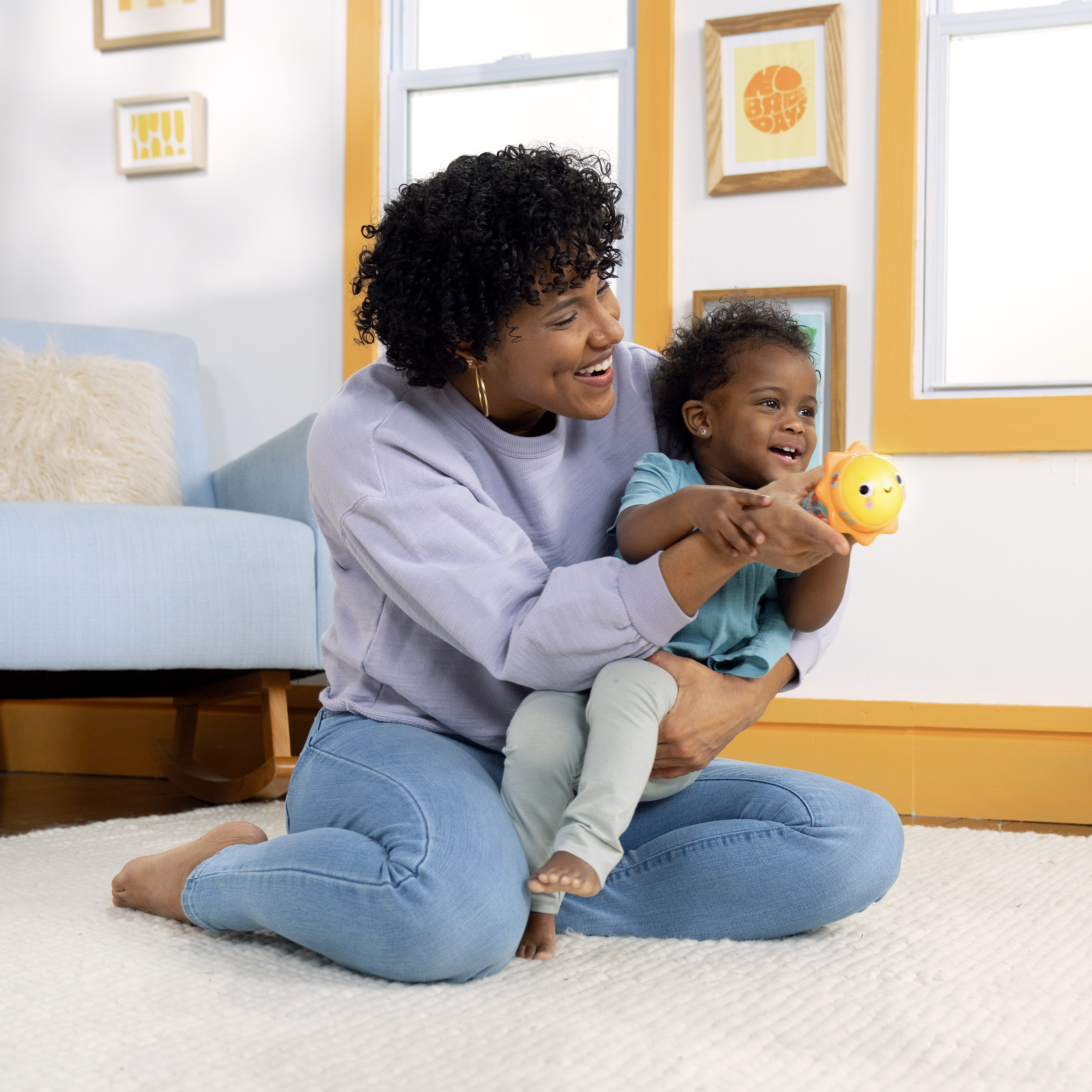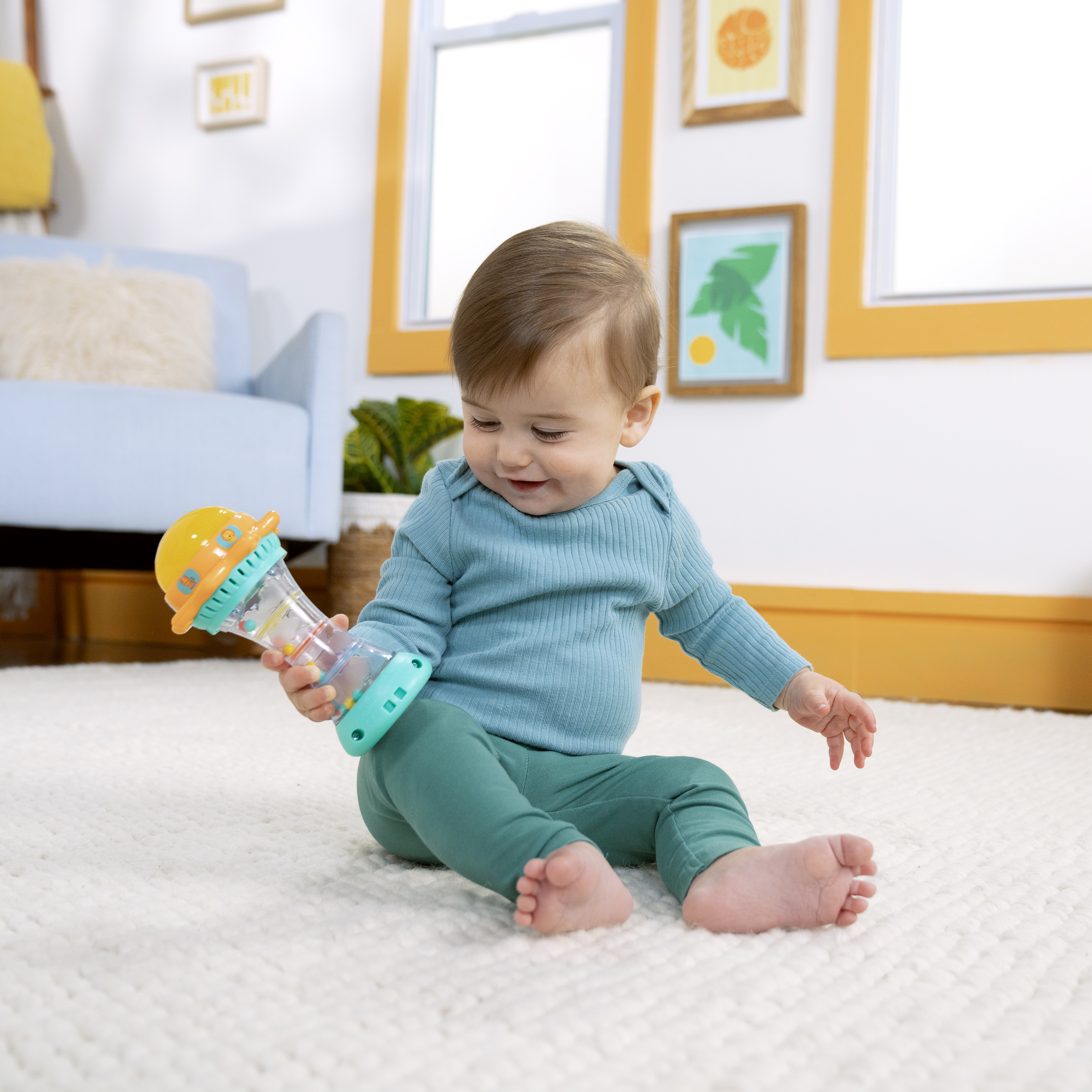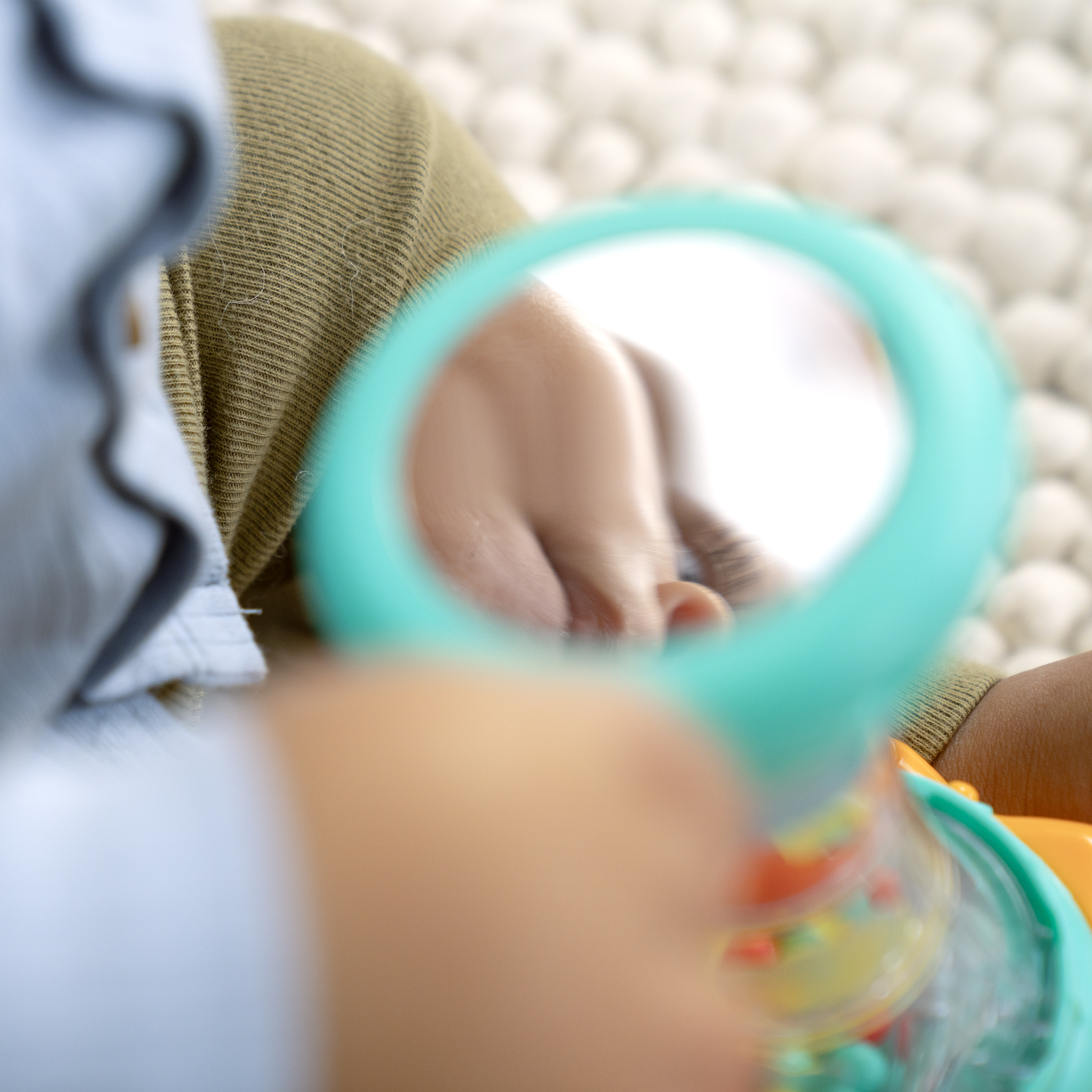 - Incoraggia il riconoscimento di sé con lo specchietto a sorpresa sul fondo del giocattolo; insegna il concetto causa-effetto quando il bambino ruota e scuote il giocattolo