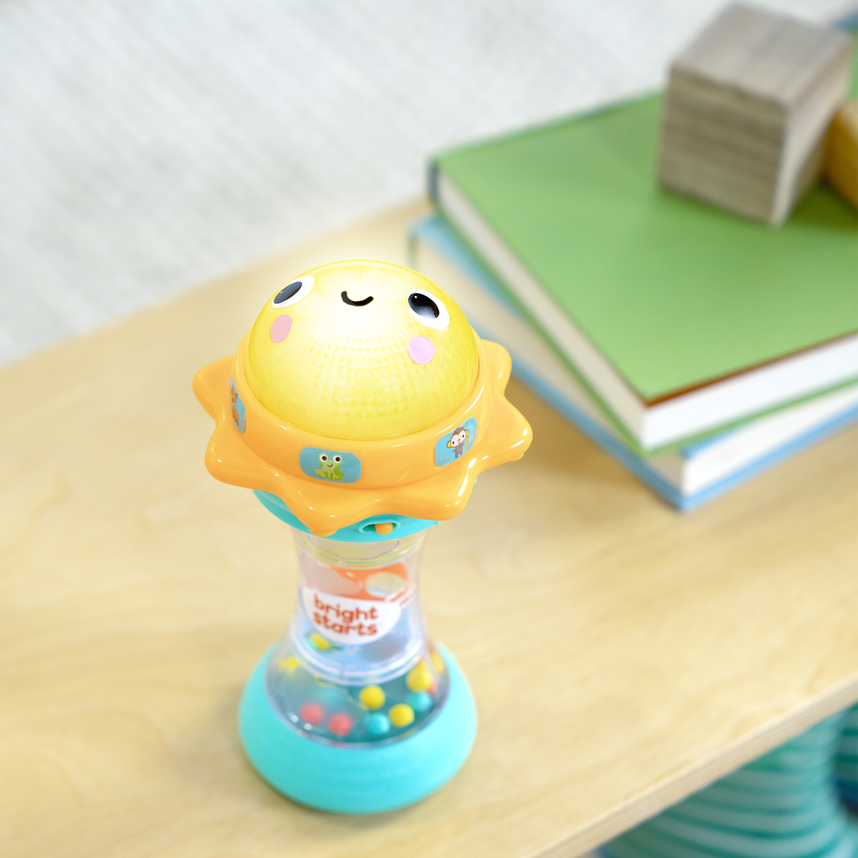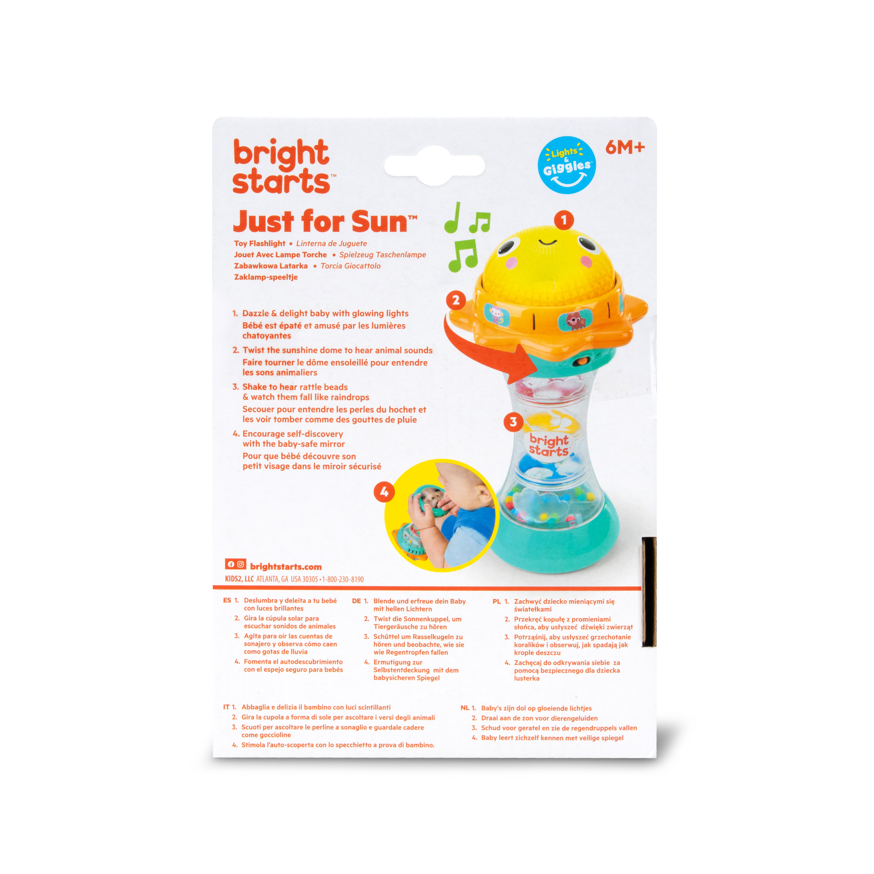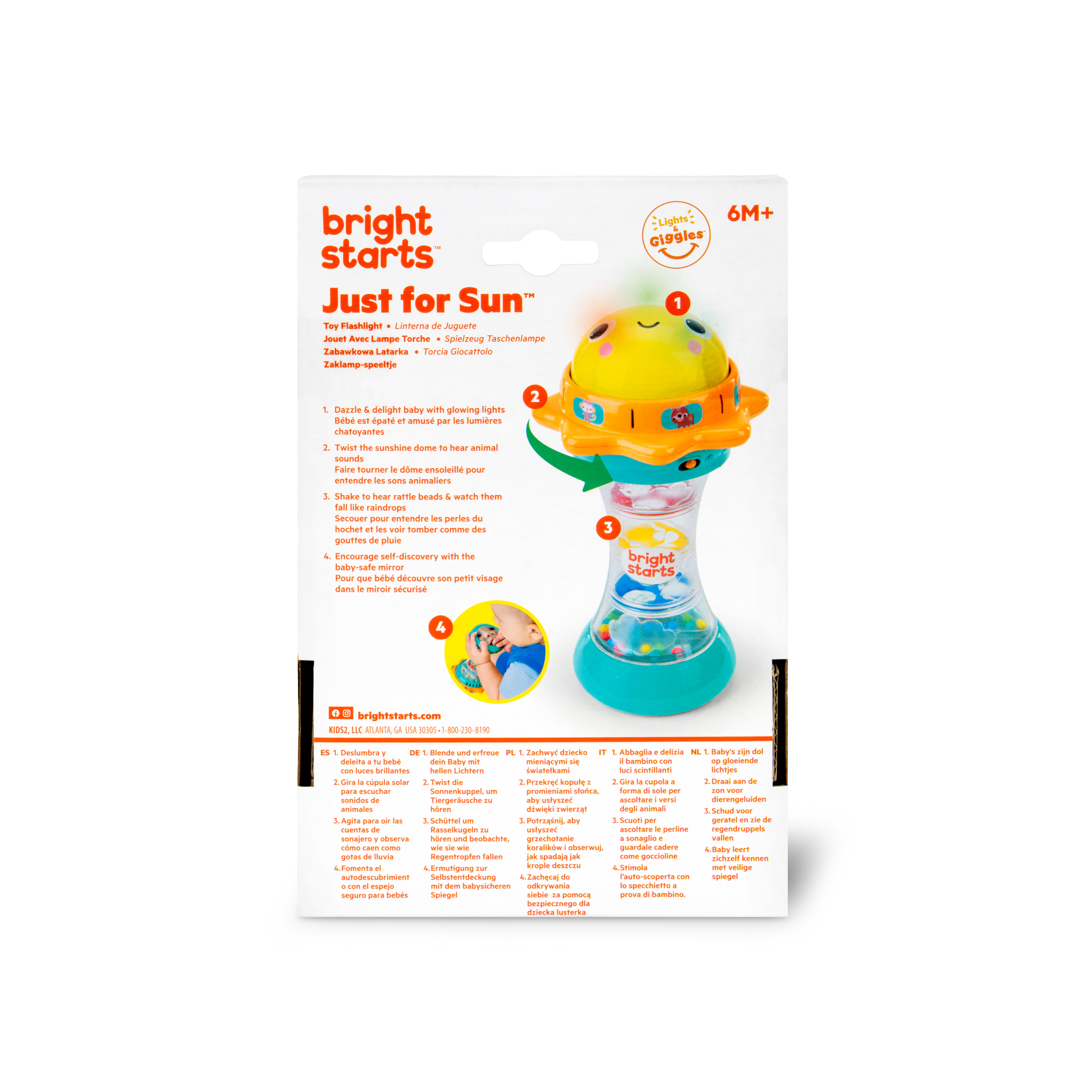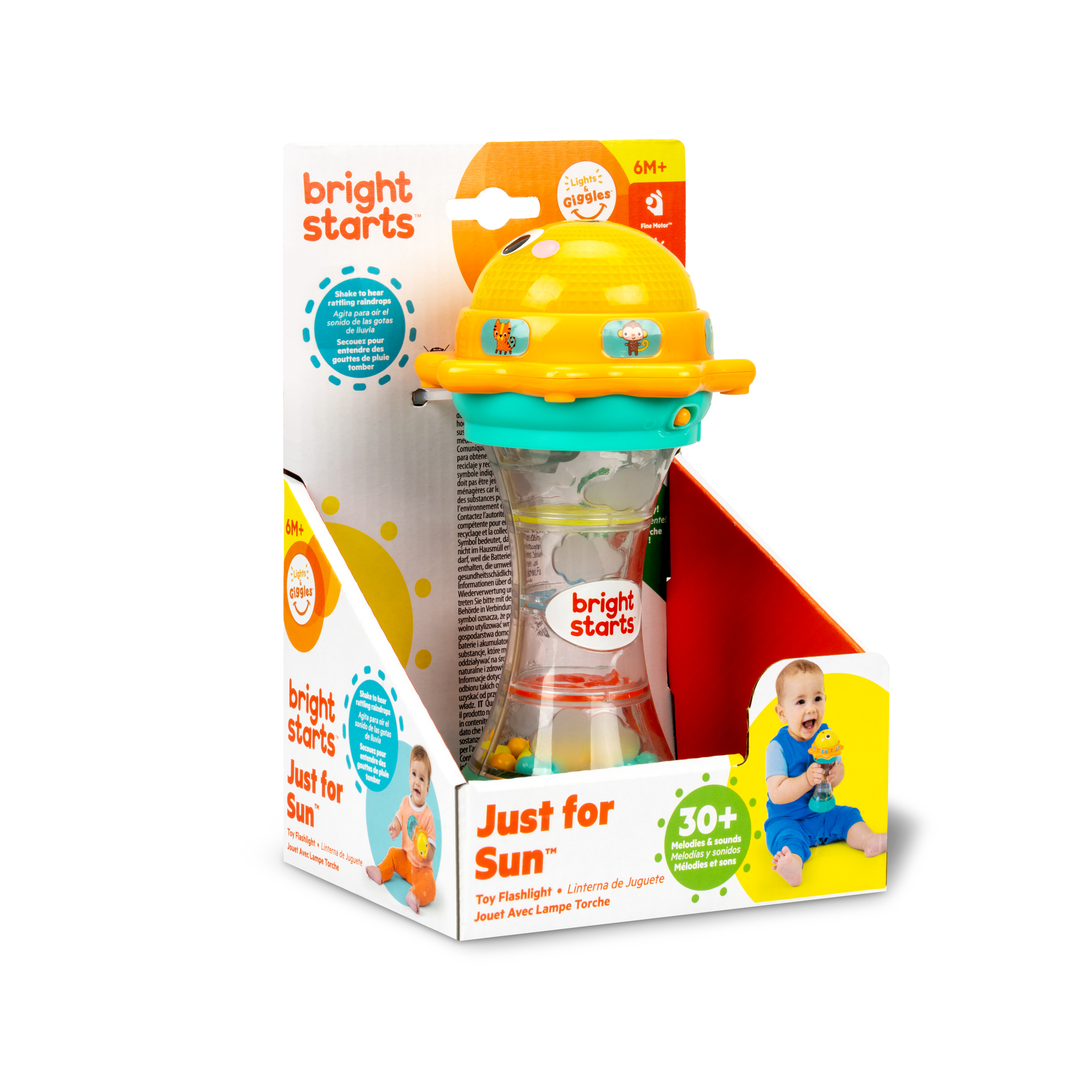 - Intrattiene il tuo bambino con luci, versi di animali e perline a sonaglio; la torcia giocattolo Just for Sun di Bright Starts è caratterizzato da una cupola a forma di sole che brilla mentre il tuo piccolo gioca