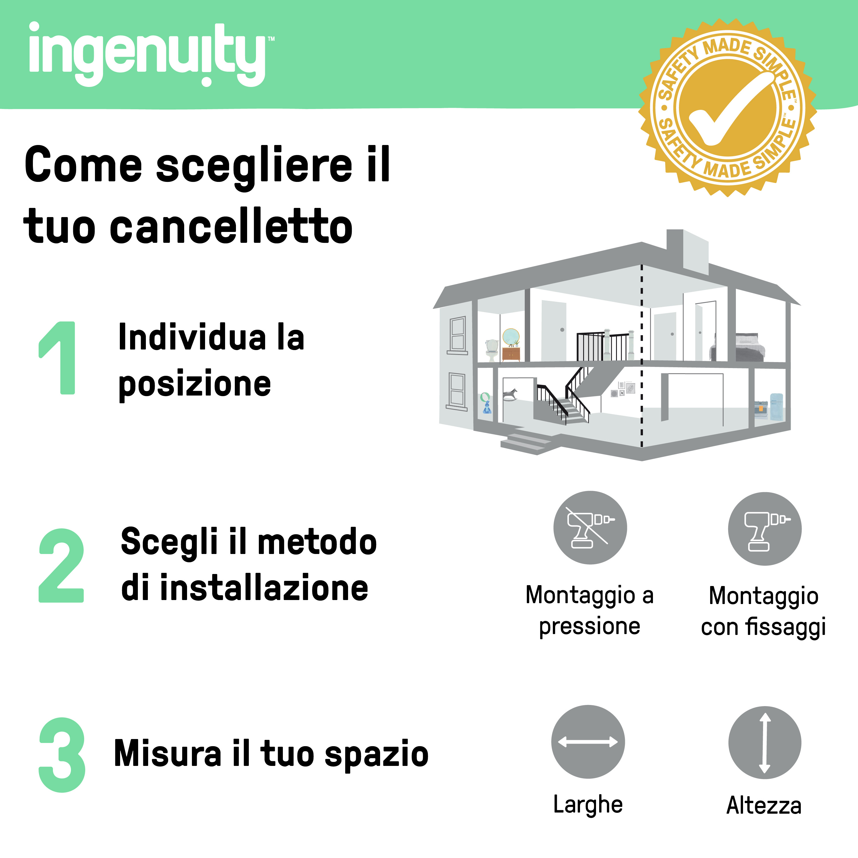 - L'estensione Hands Free Open da 28 cm della serie Doorway di Ingenuity è progettata per adattarsi perfettamente al cancelletto di base Hands Free Open della serie Doorway (venduto separatamente) per ampliare le dimensioni del cancelletto fino a una larghezza di 101-108 cm e adattarsi così alle porte più larghe della casa.