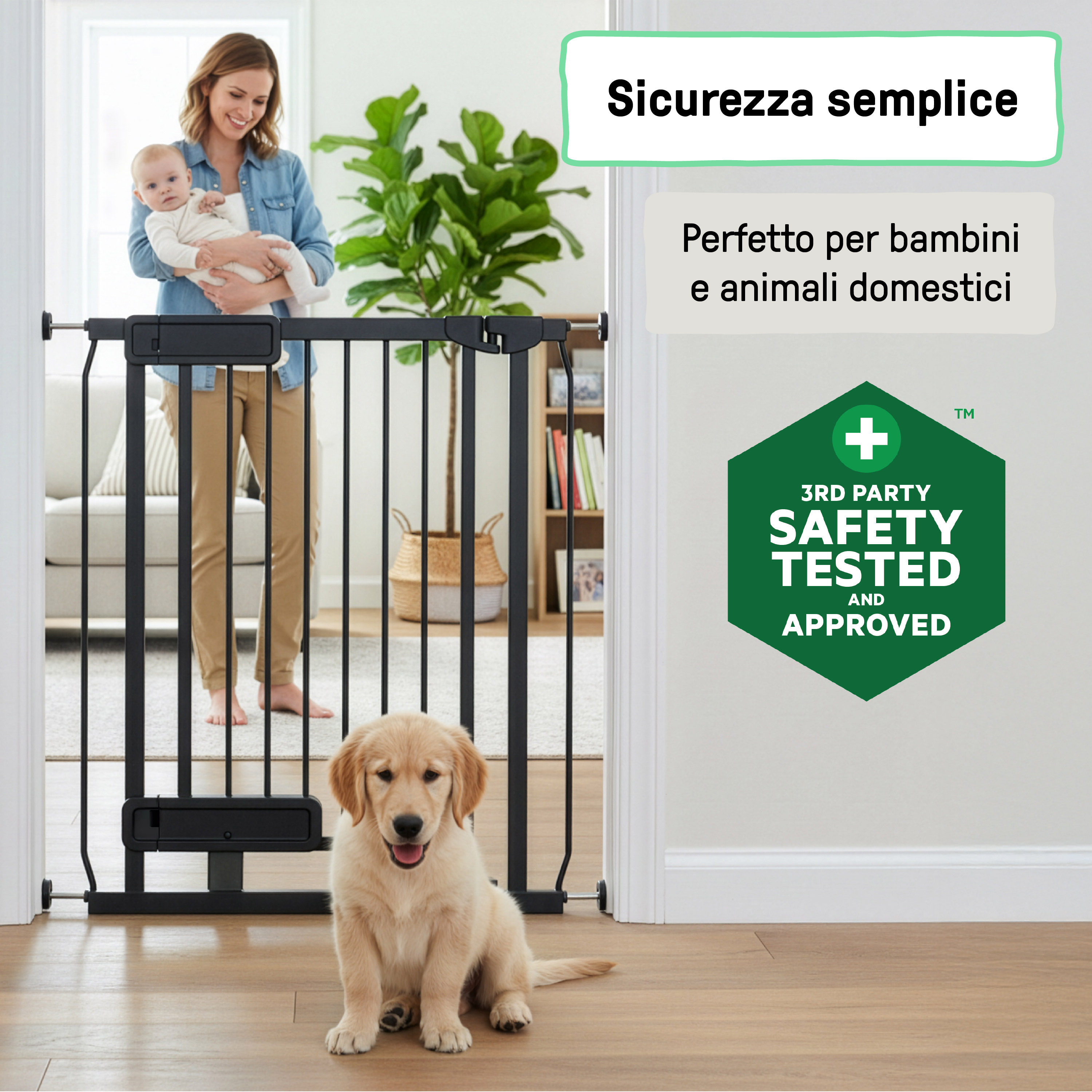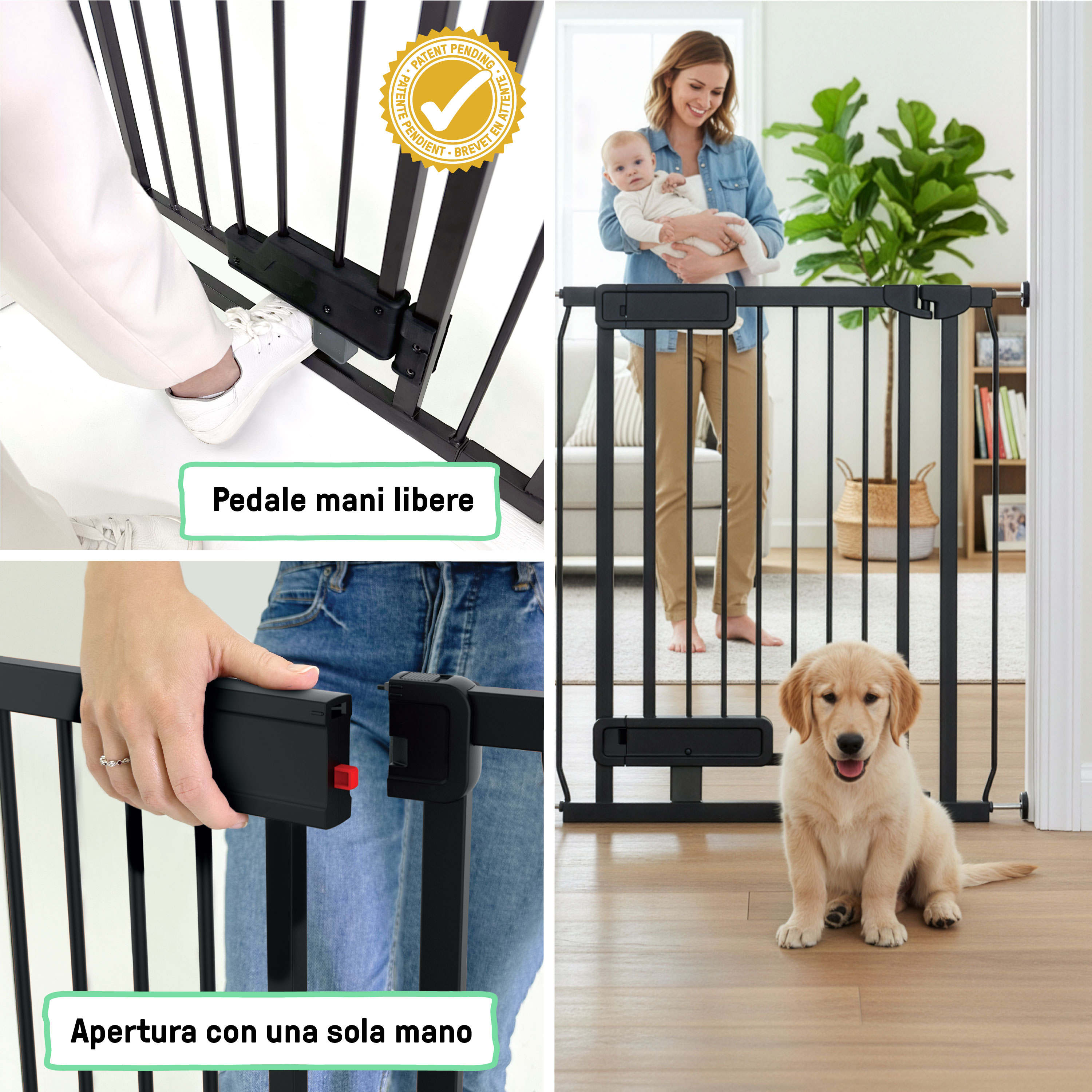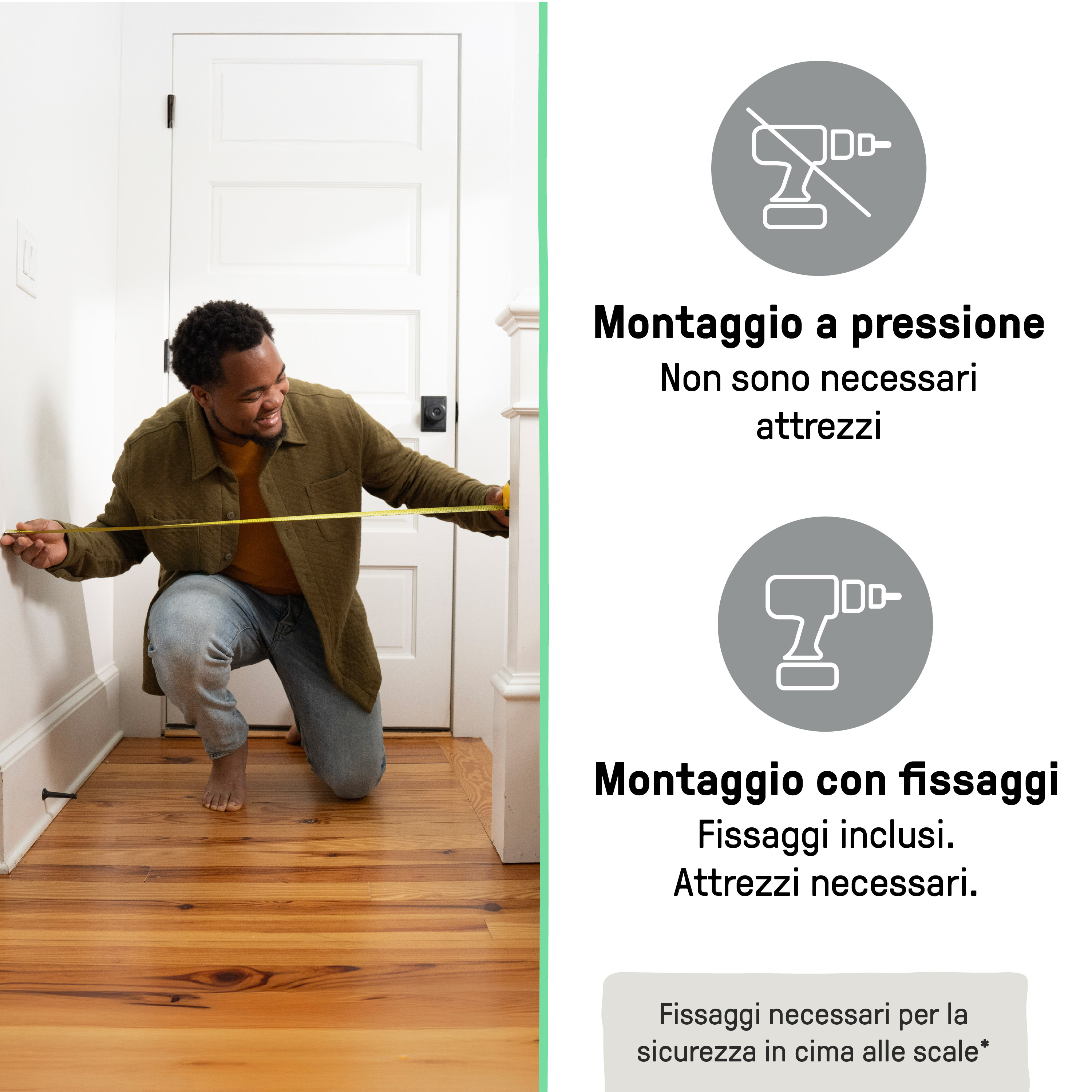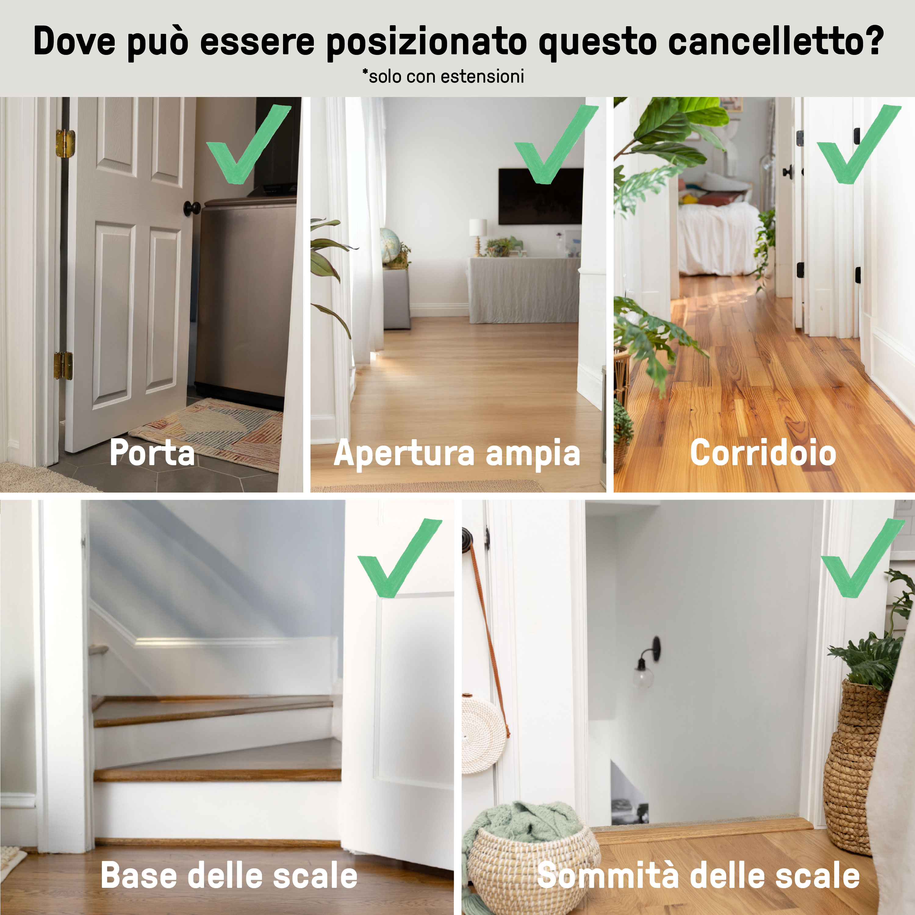 - Il cancelletto e l’estensione sono installabili in diversi ambienti; per porte e corridoi, è sufficiente fissarlo a pressione senza danneggiare le pareti; include un kit di accessori opzionale per una maggiore tranquillità (non adatto all'uso su scale).