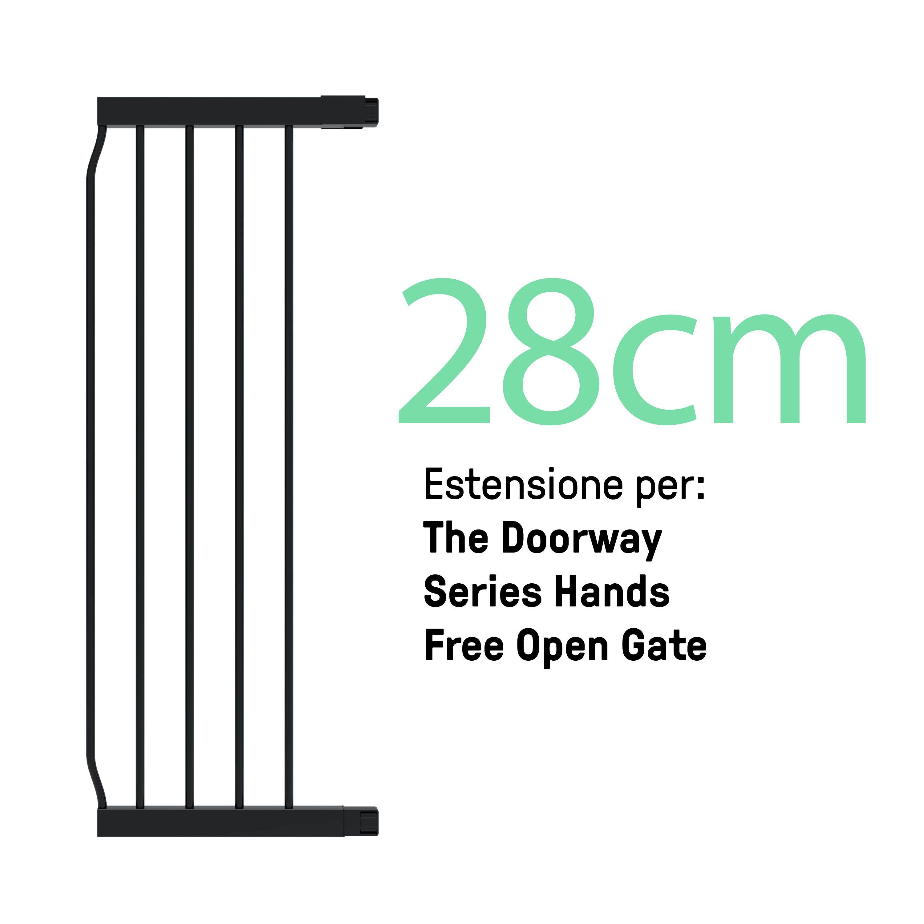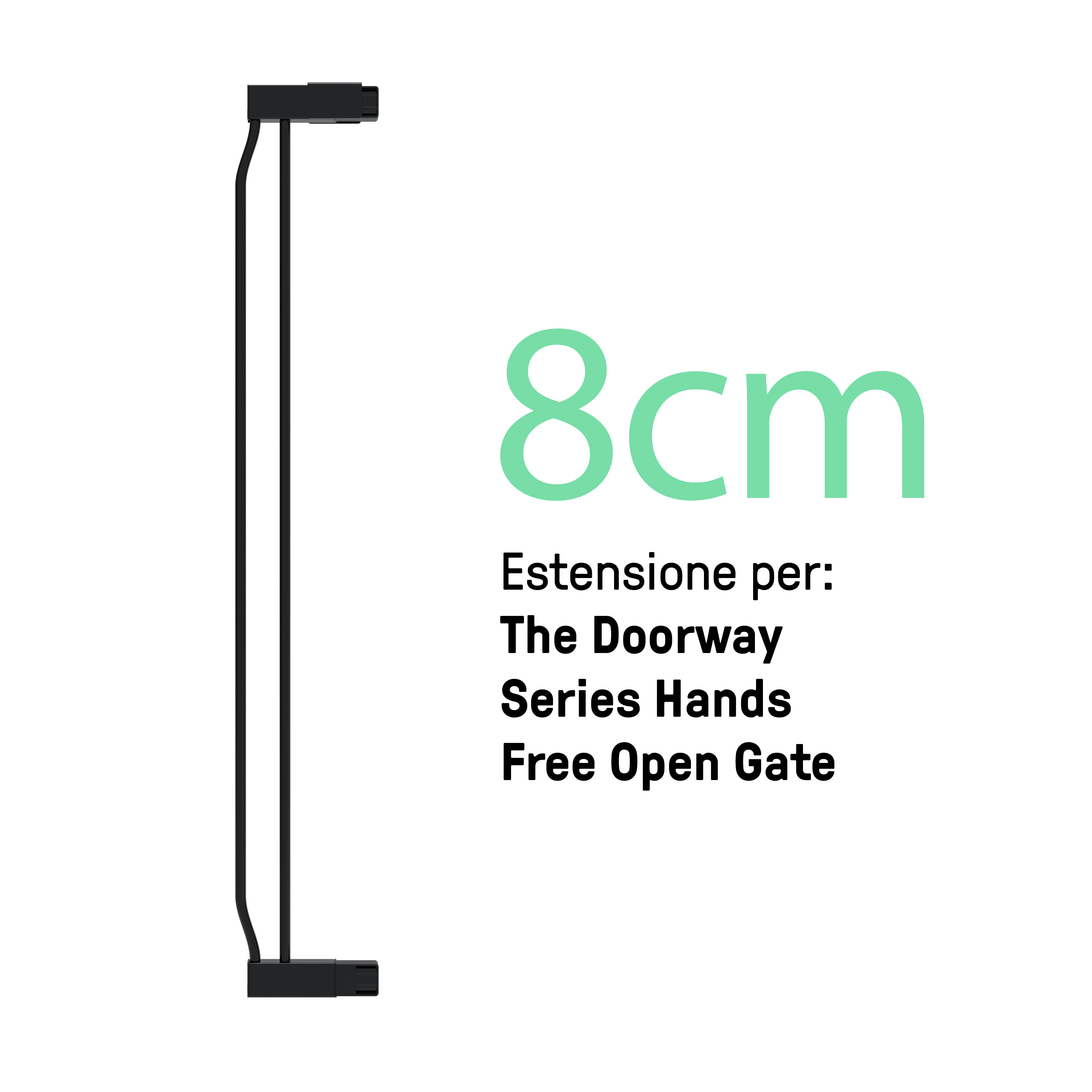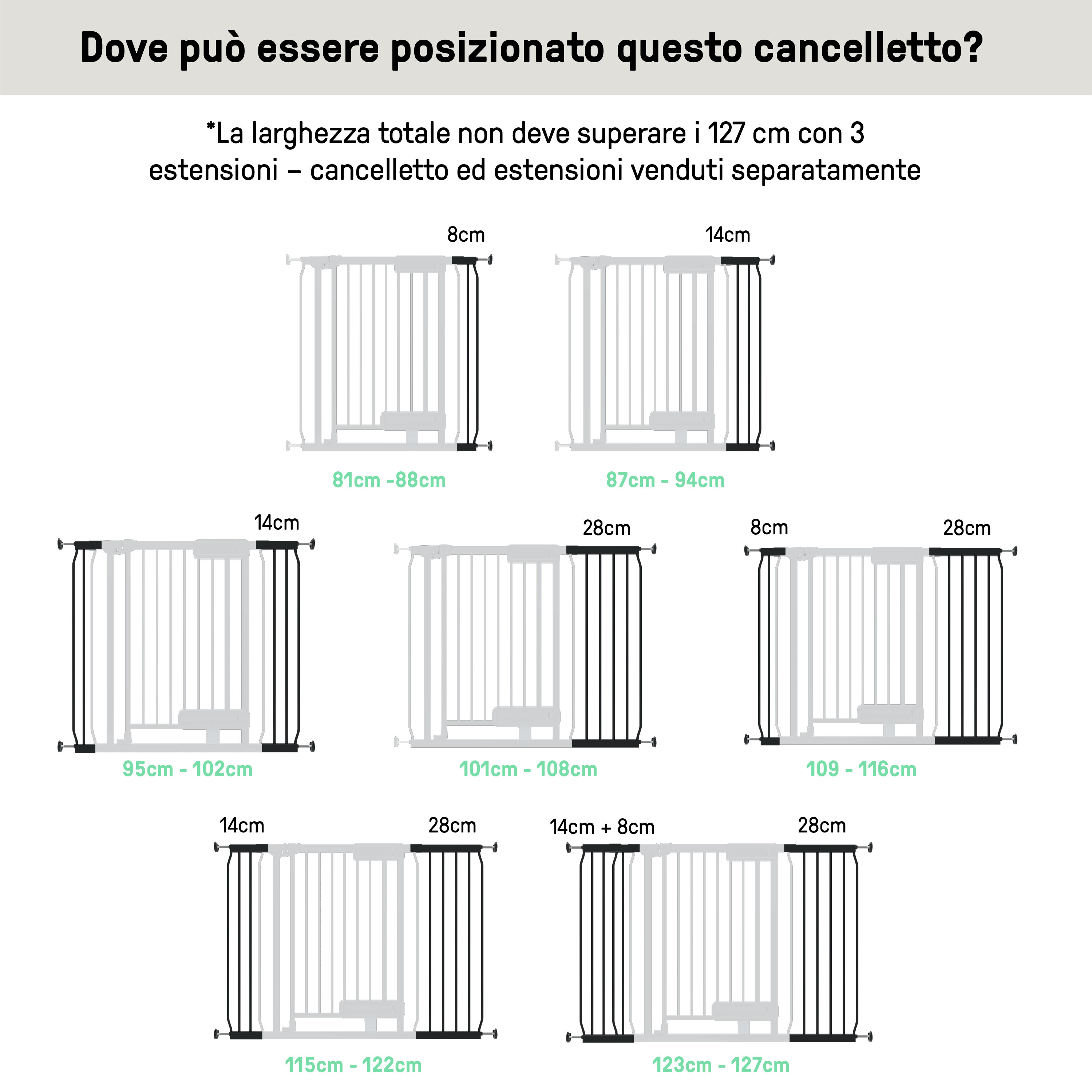 - Sono disponibili anche estensioni da 8 cm e 14 cm per creare un cancelletto ancora più ampio. La larghezza massima non deve superare i 127 cm.