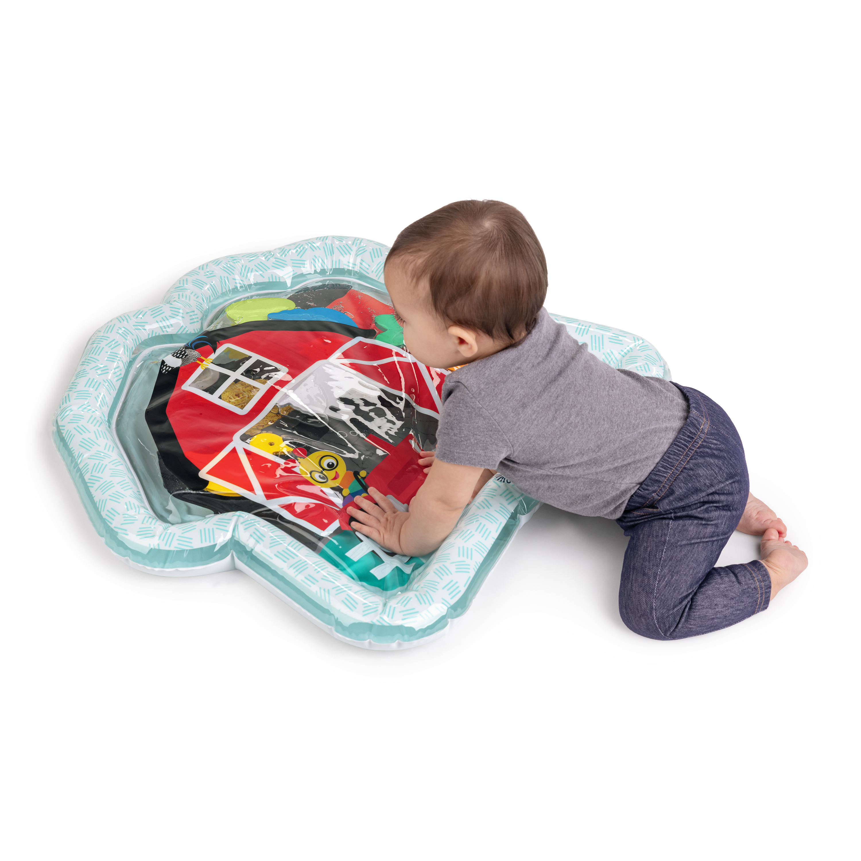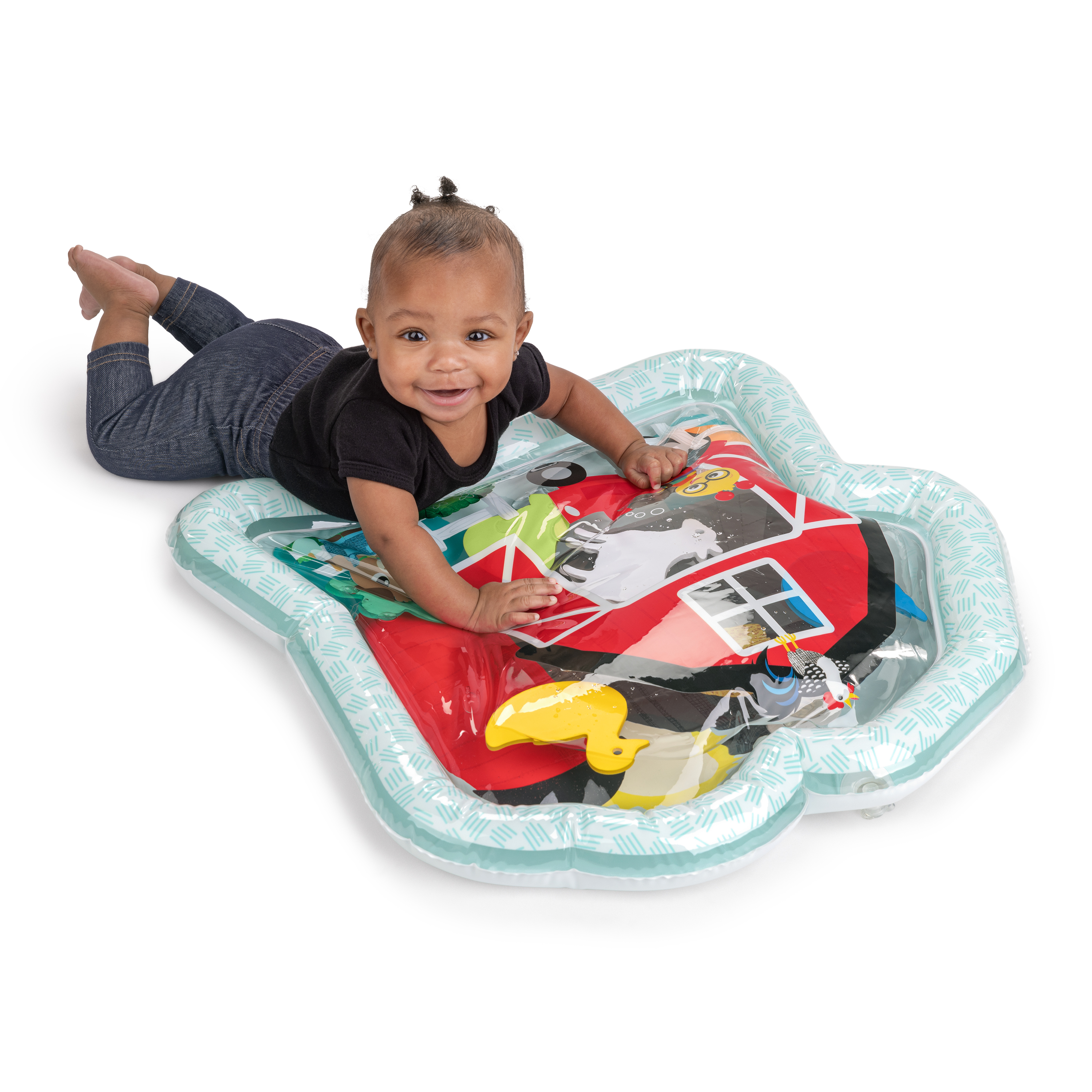 - Il tappetino ad acqua Cal's Sensory Tummy Time Mat di Baby Einstein Farm Explorers si riempe senza fare pasticci e coinvolge il bambino durante il gioco a pancia in giù o da seduto.