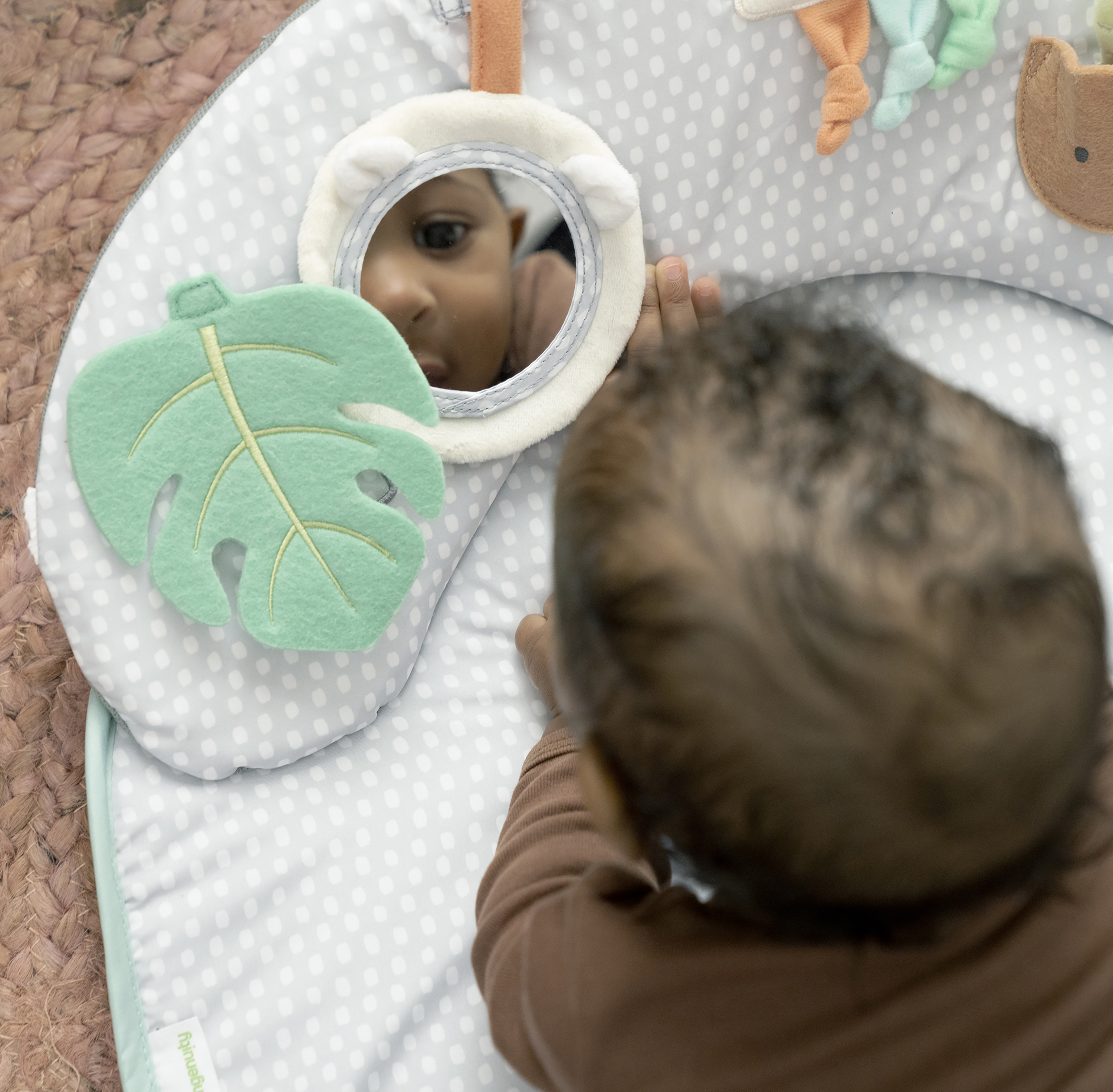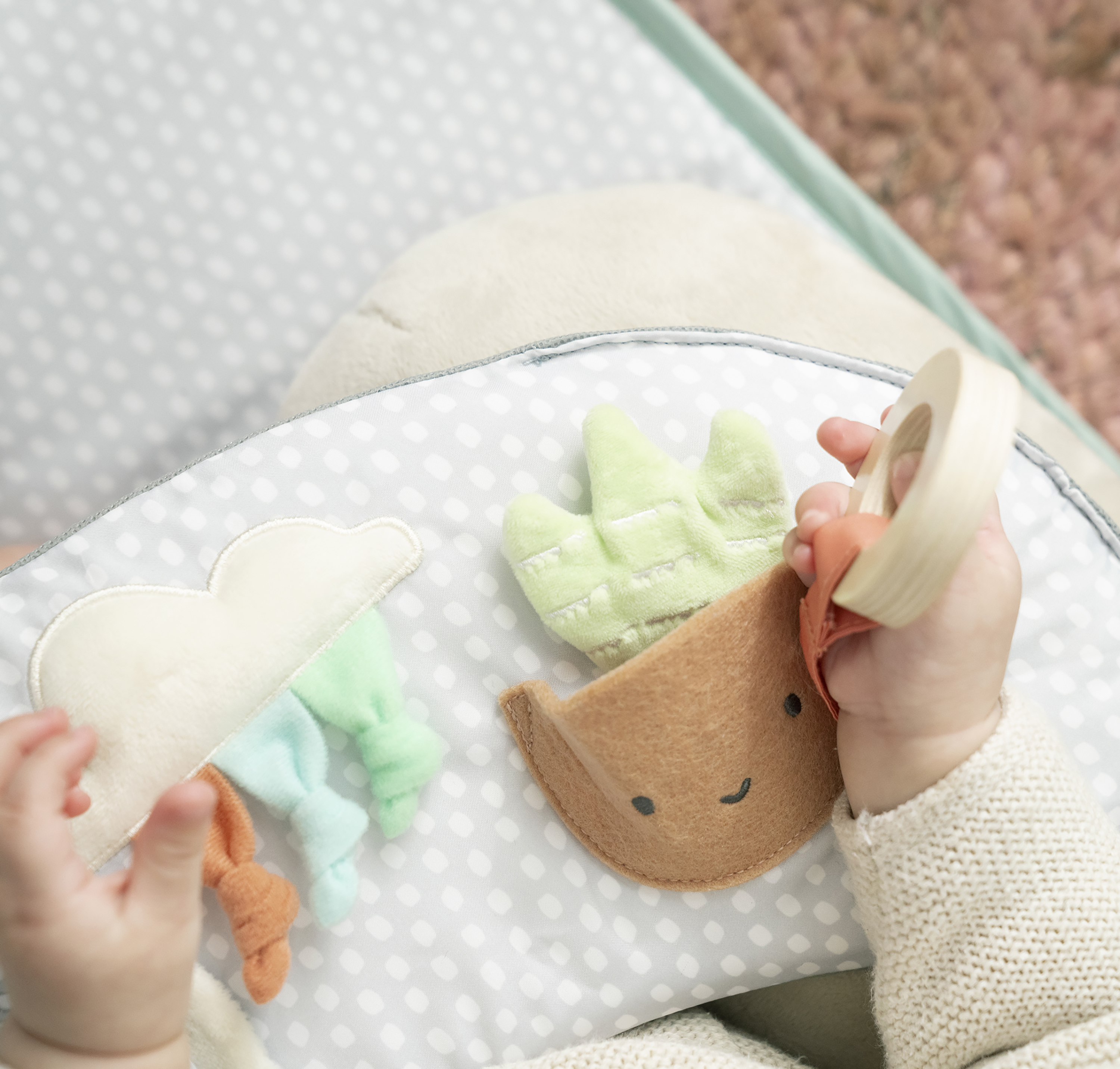 - 5つの自然の知覚玩具、透ける生地の葉、分離可能なクマのミラー、タ付きクラウド、しわ寄せ生地の鉢植えの植物、また自然木材リングがついています