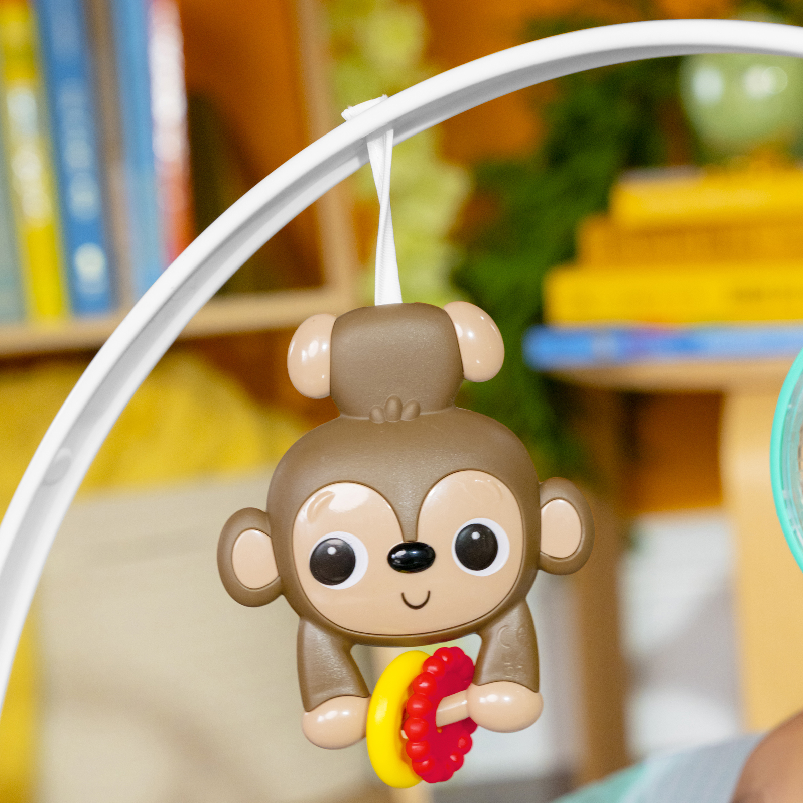 - Wprowadź interaktywną zabawę za pomocą pałąka z zabawkami. W zestawie kolorowa grzechotka i przesuwane koralik z małpką, które zachęcają do sięgania, uderzania i rozwijania małych umiejętności motorycznych. Możliwość zdjęcia pałąka w celu łatwiejszego wkładania i wyjmowania dziecka