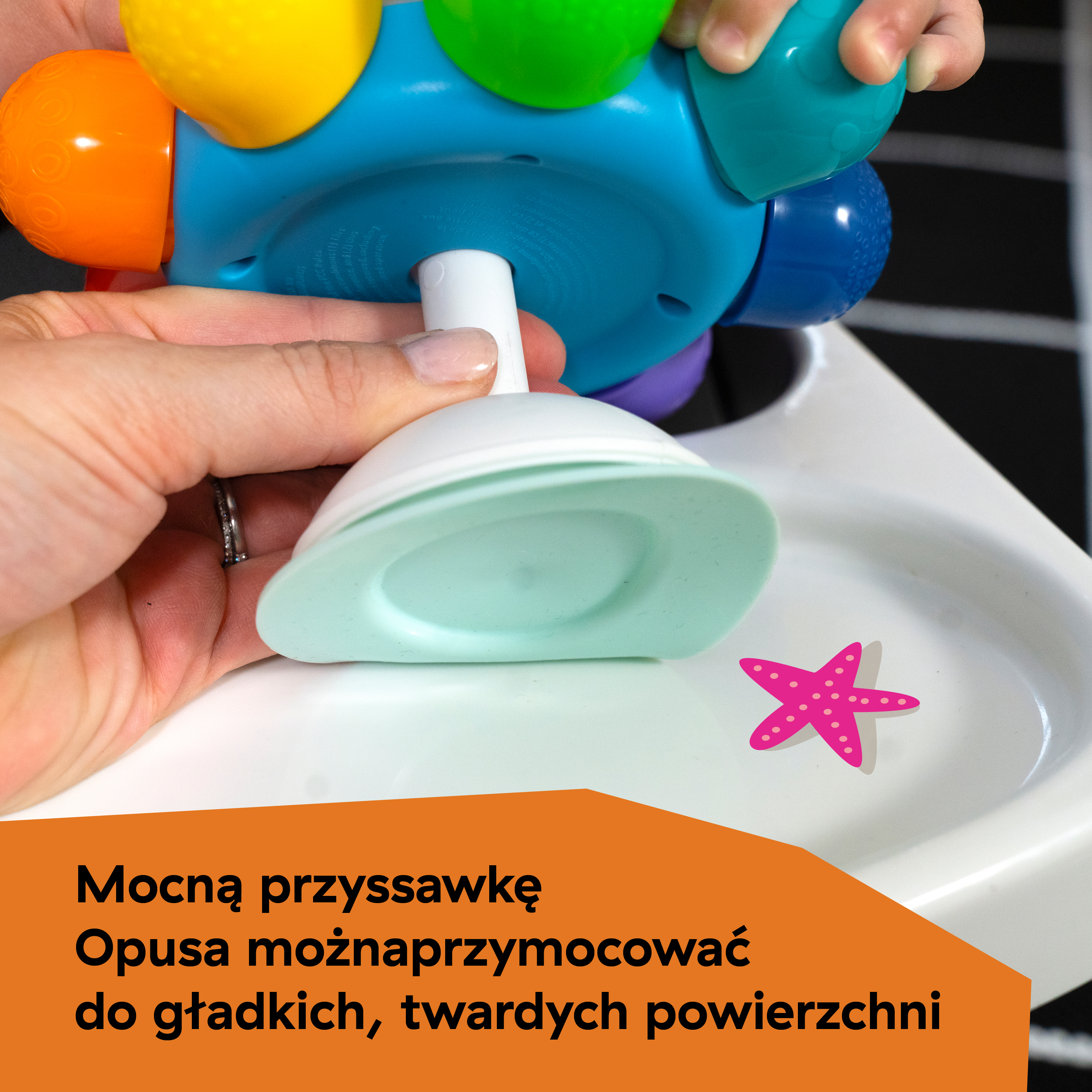 - Mocna przyssawka pozwala przymocować zabawkę do praktycznie każdej gładkiej, twardej powierzchni w domu lub w podróży.