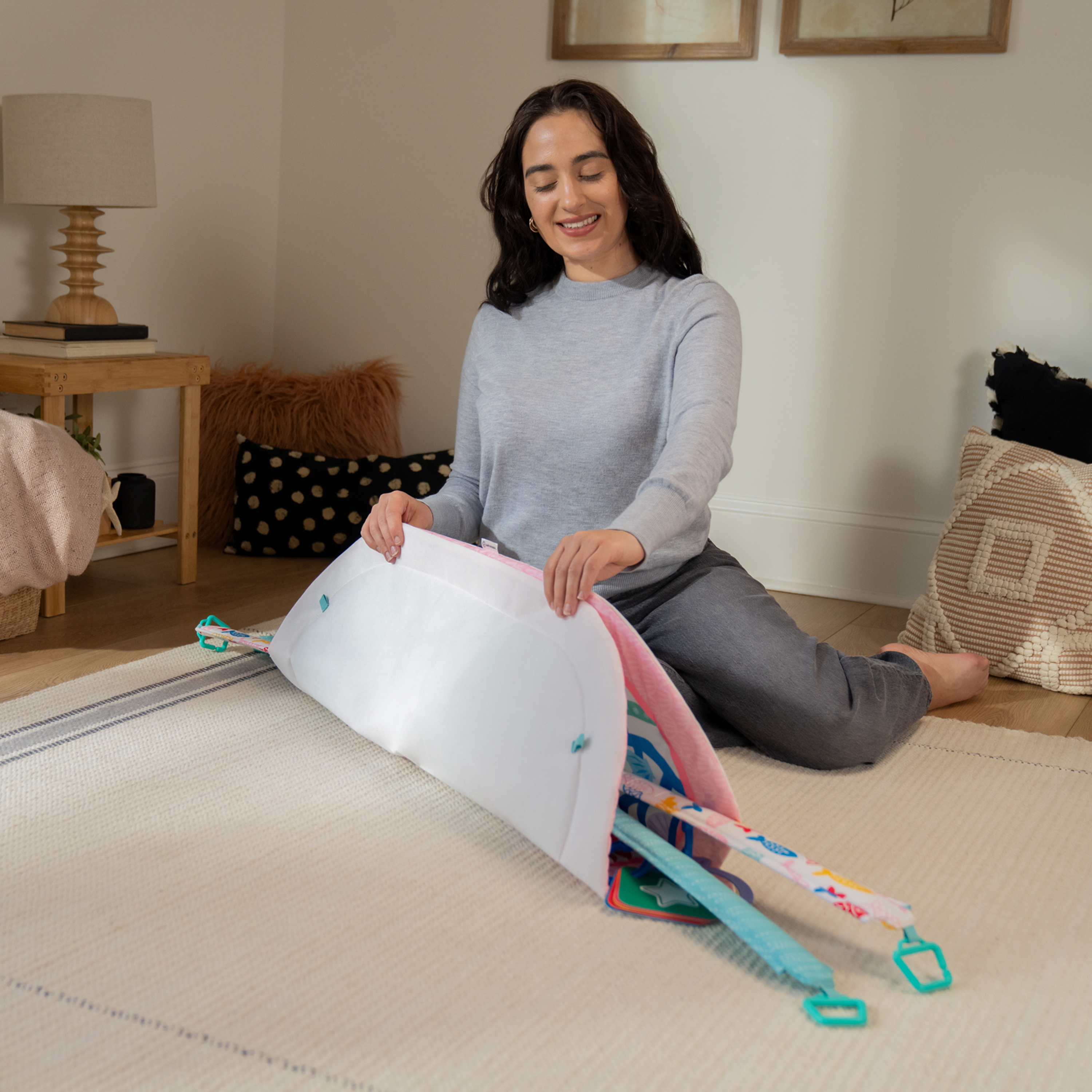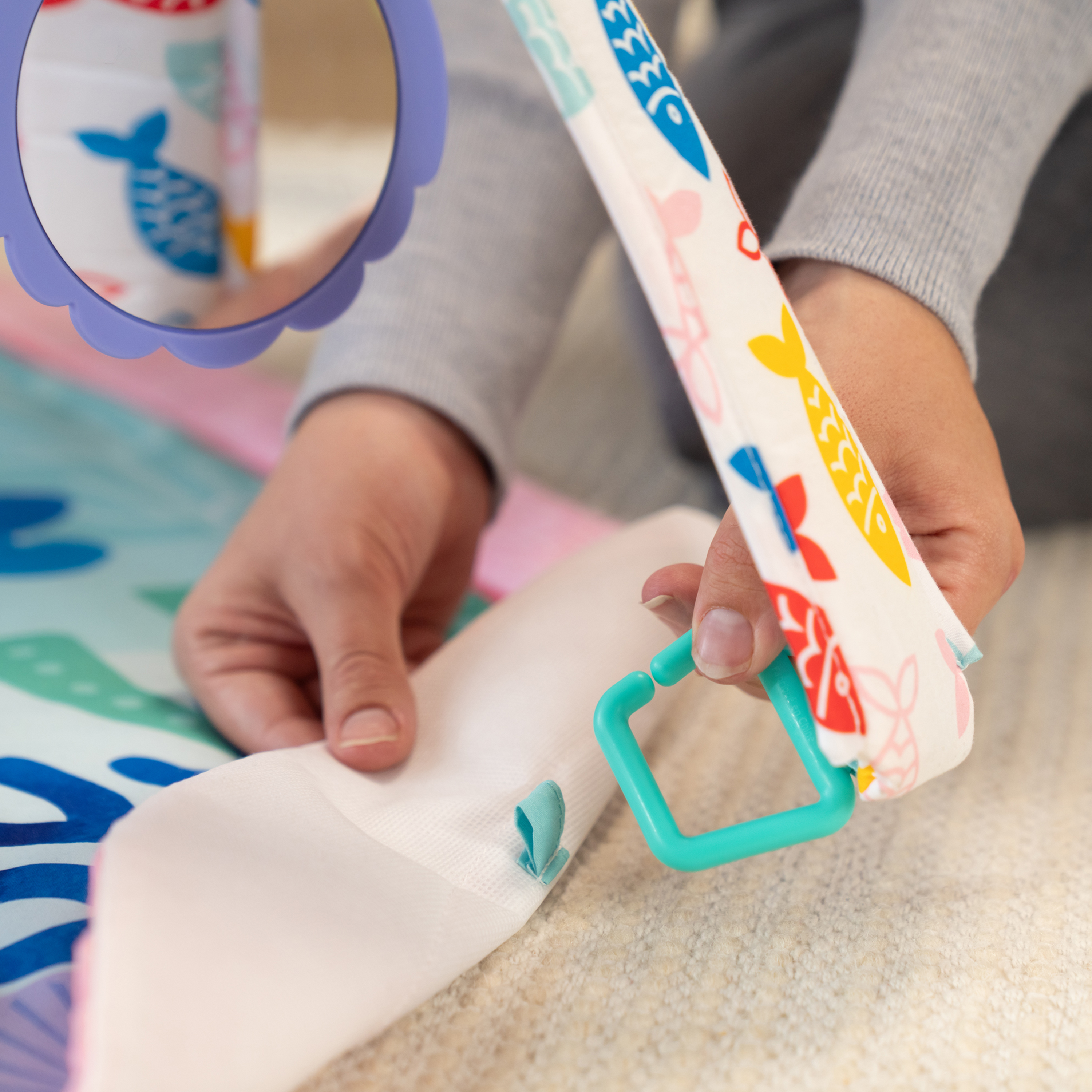 - 6 zdejmowanych zabawek sensorycznych angażuje zmysły i rozwija umiejętności motoryczne, takie jak sięganie, naciskanie i kopanie; teksturowana zabawka w kształcie dolara piaskowego, przesuwane koraliki z krabem, lusterko w kształcie muszli, szeleszcząca książeczka, karty obrazkowe i pluszowa meduza Janet; w zestawie 2 pałąki i pianinko do kopania