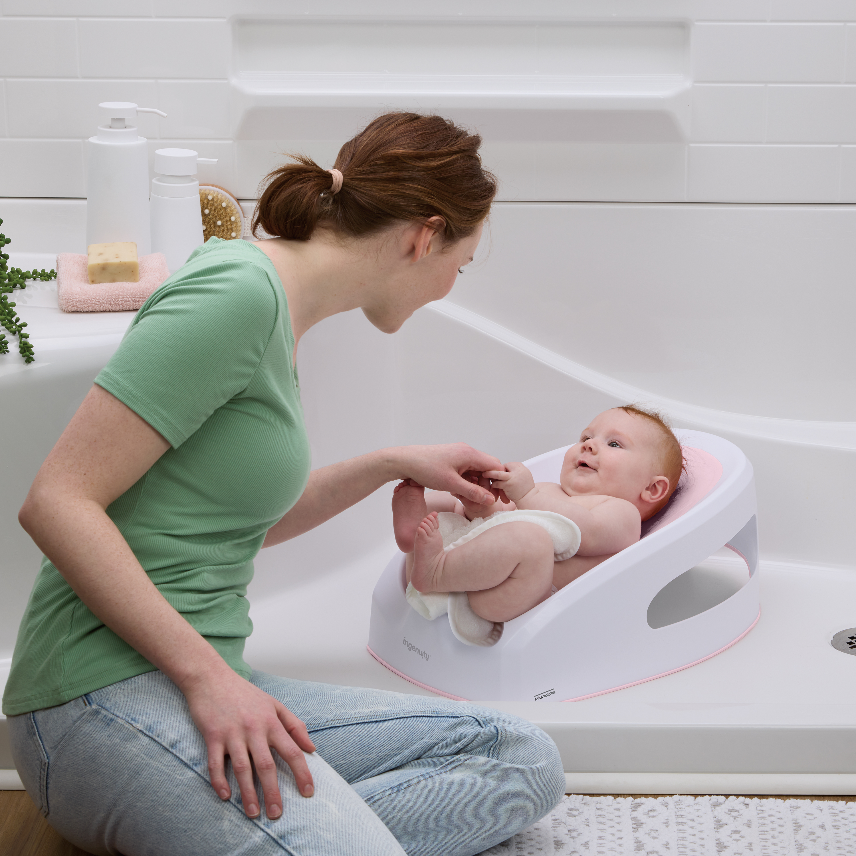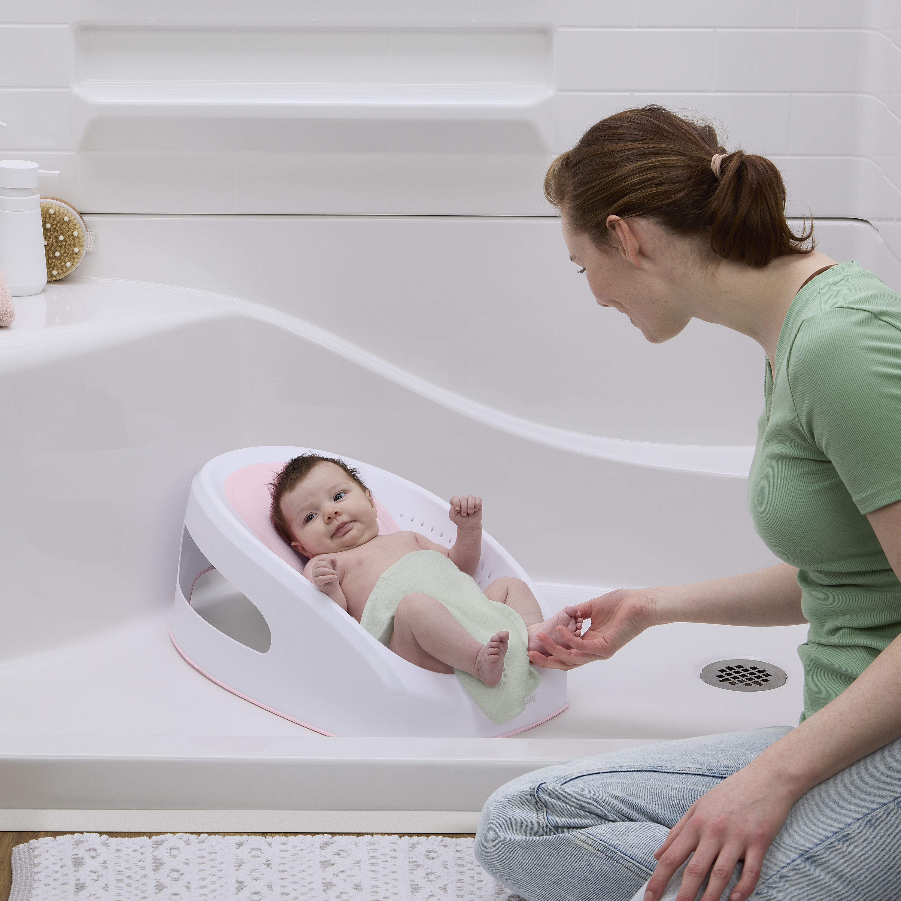 - Miękki materiał TPE i niskoprofilowy kształt pozwalają dziecku zrelaksować się i cieszyć kąpielą podczas spłukiwania