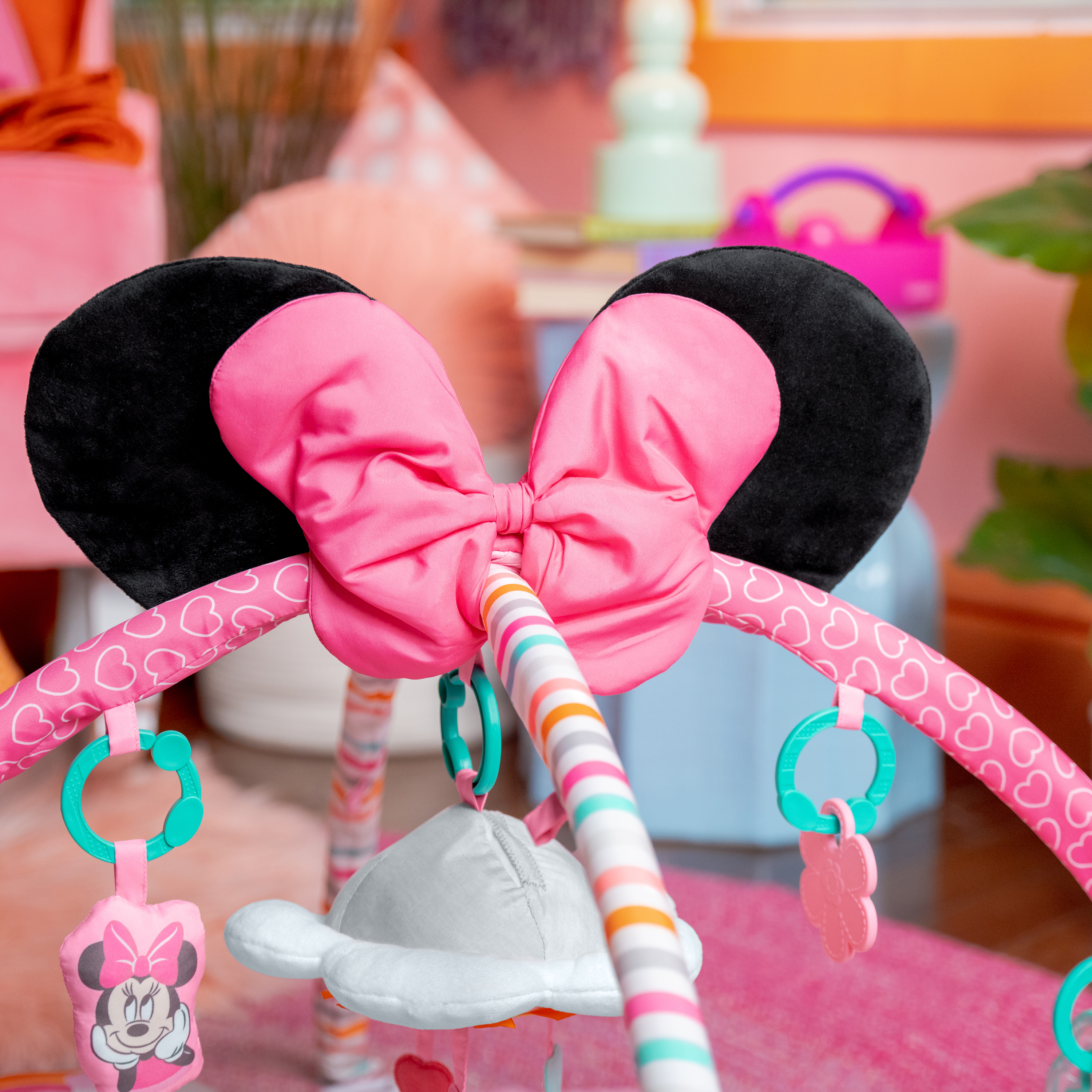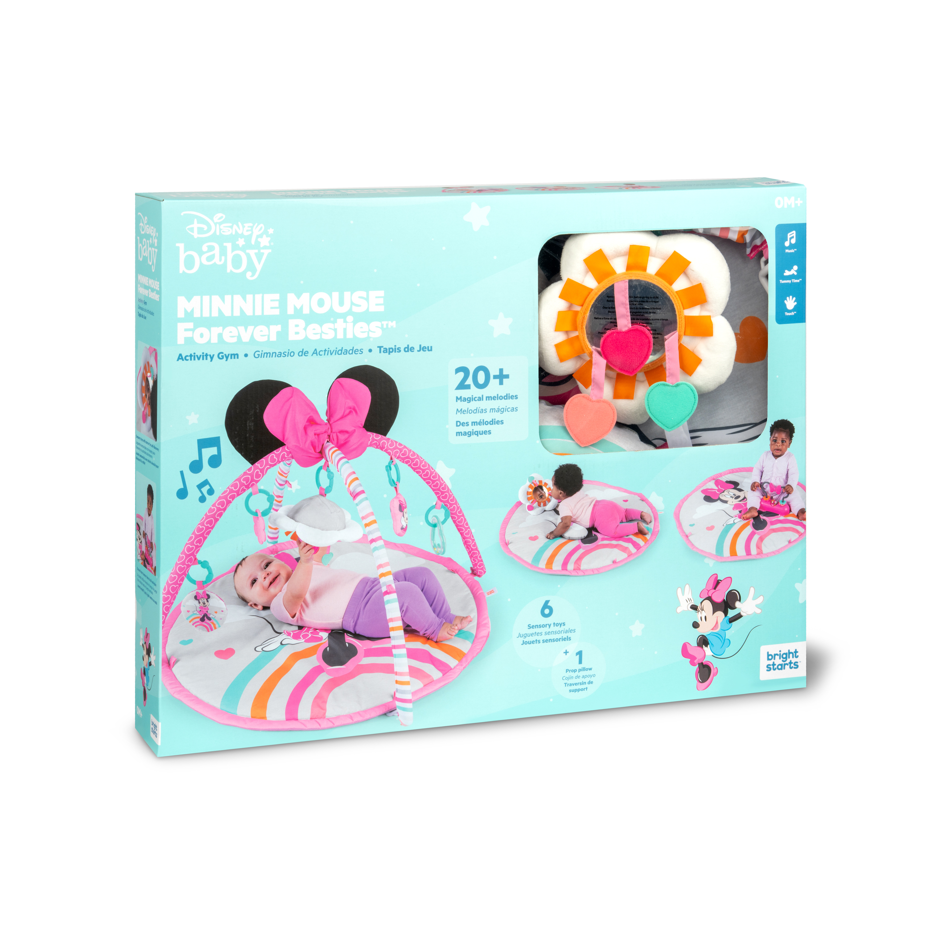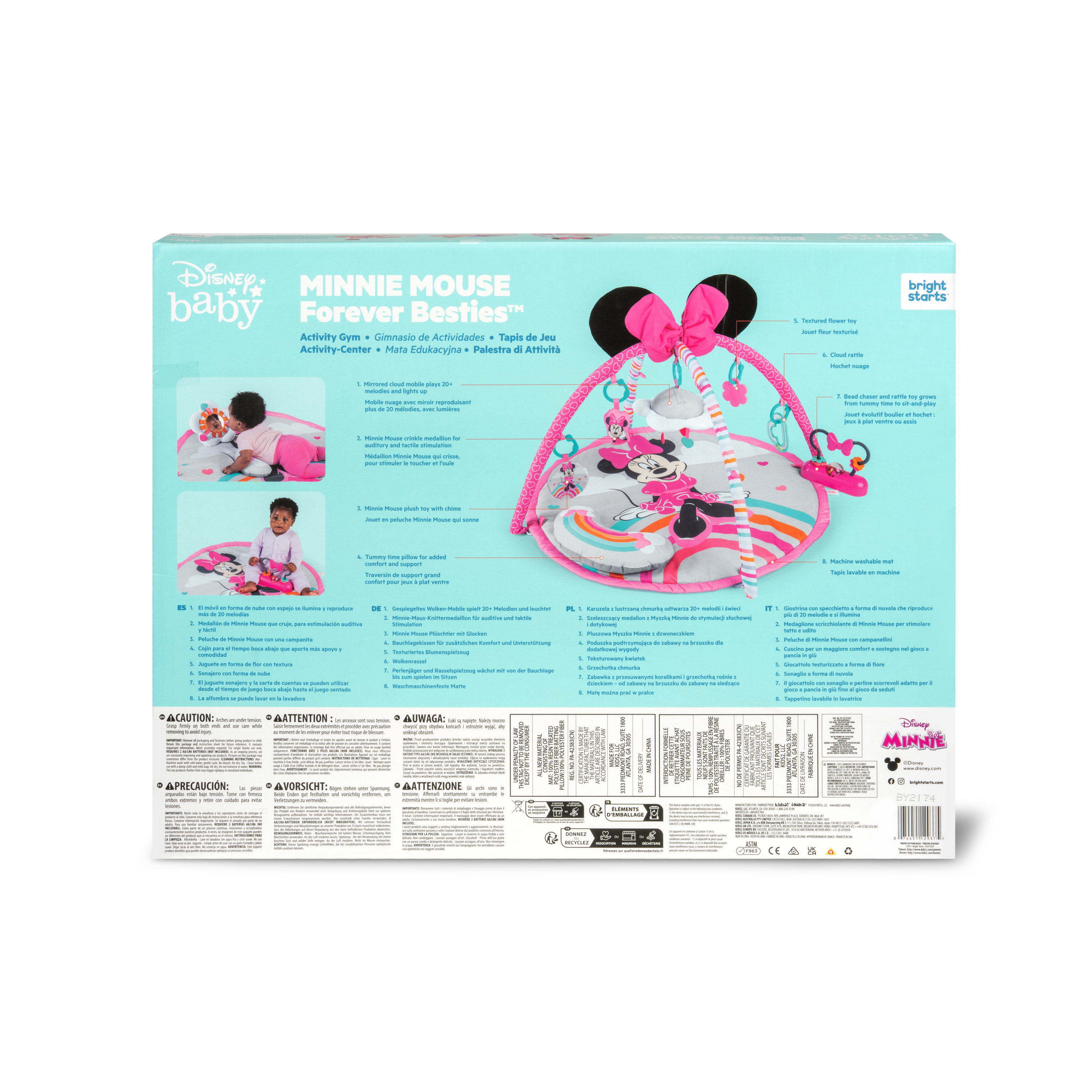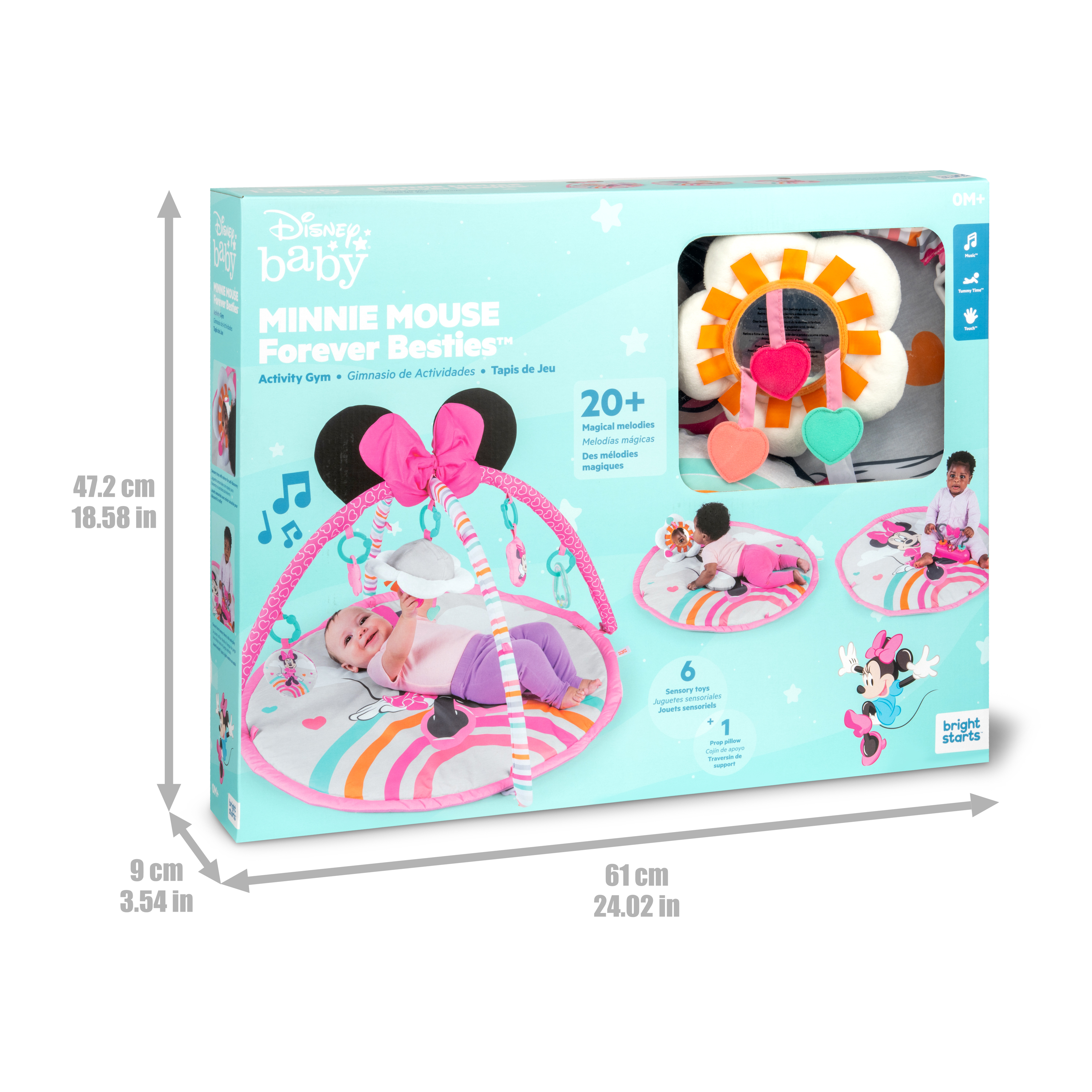 - 6个可拆卸玩具,包括追珠器和拨浪鼓玩具,皱纹奖章,米妮老鼠毛绒与风铃,纹理花玩具,和音乐手机;易于移动的玩具在健身架周围或随身携带