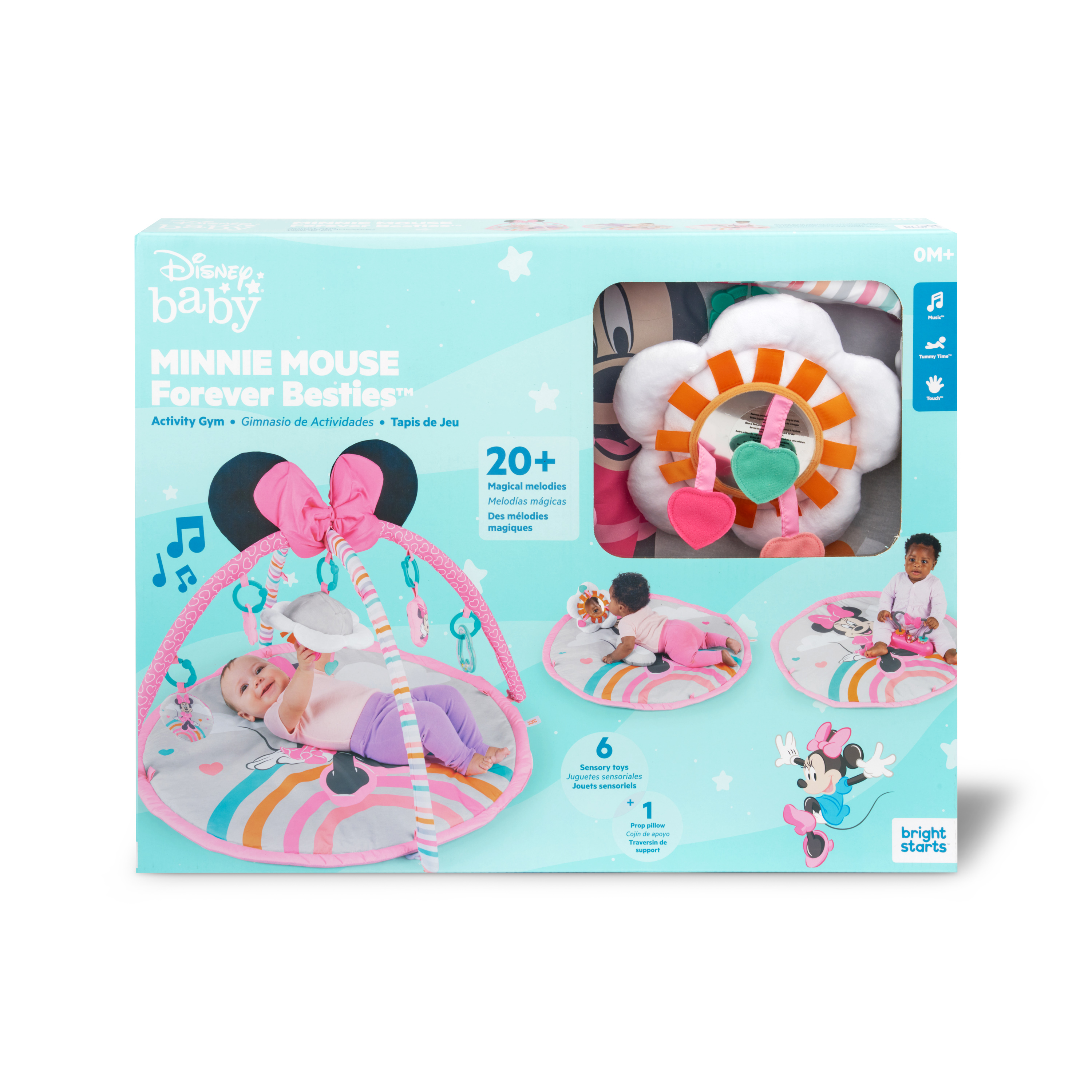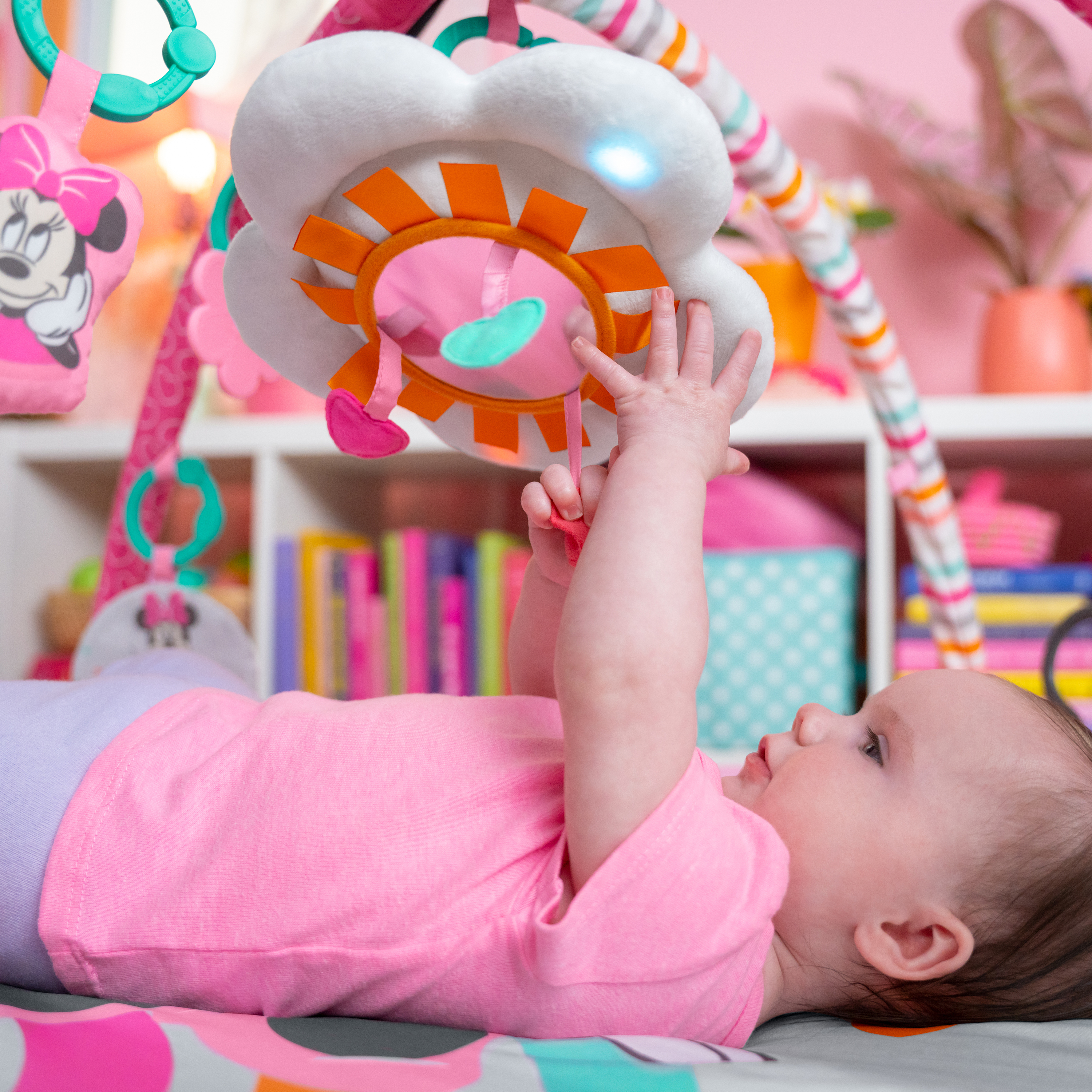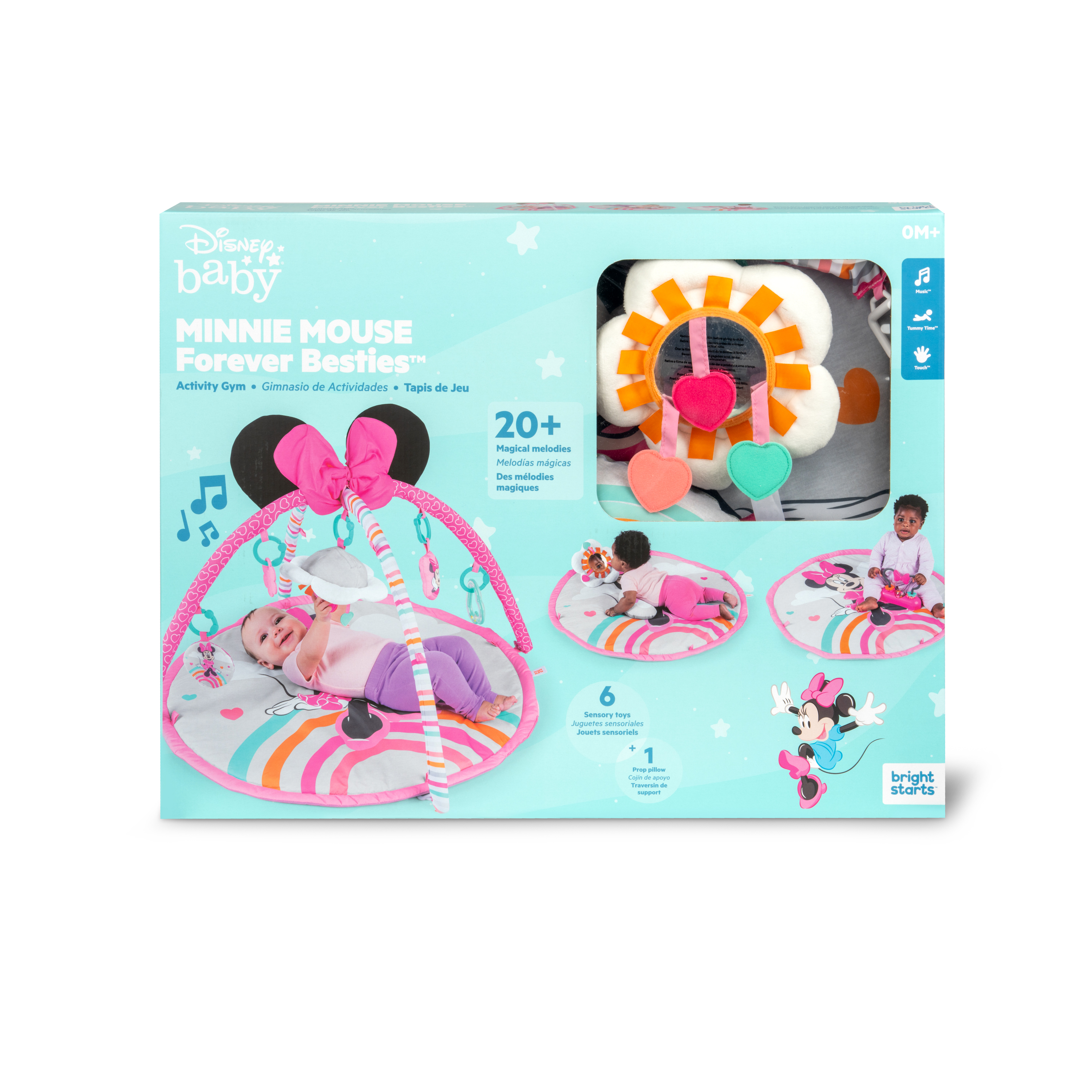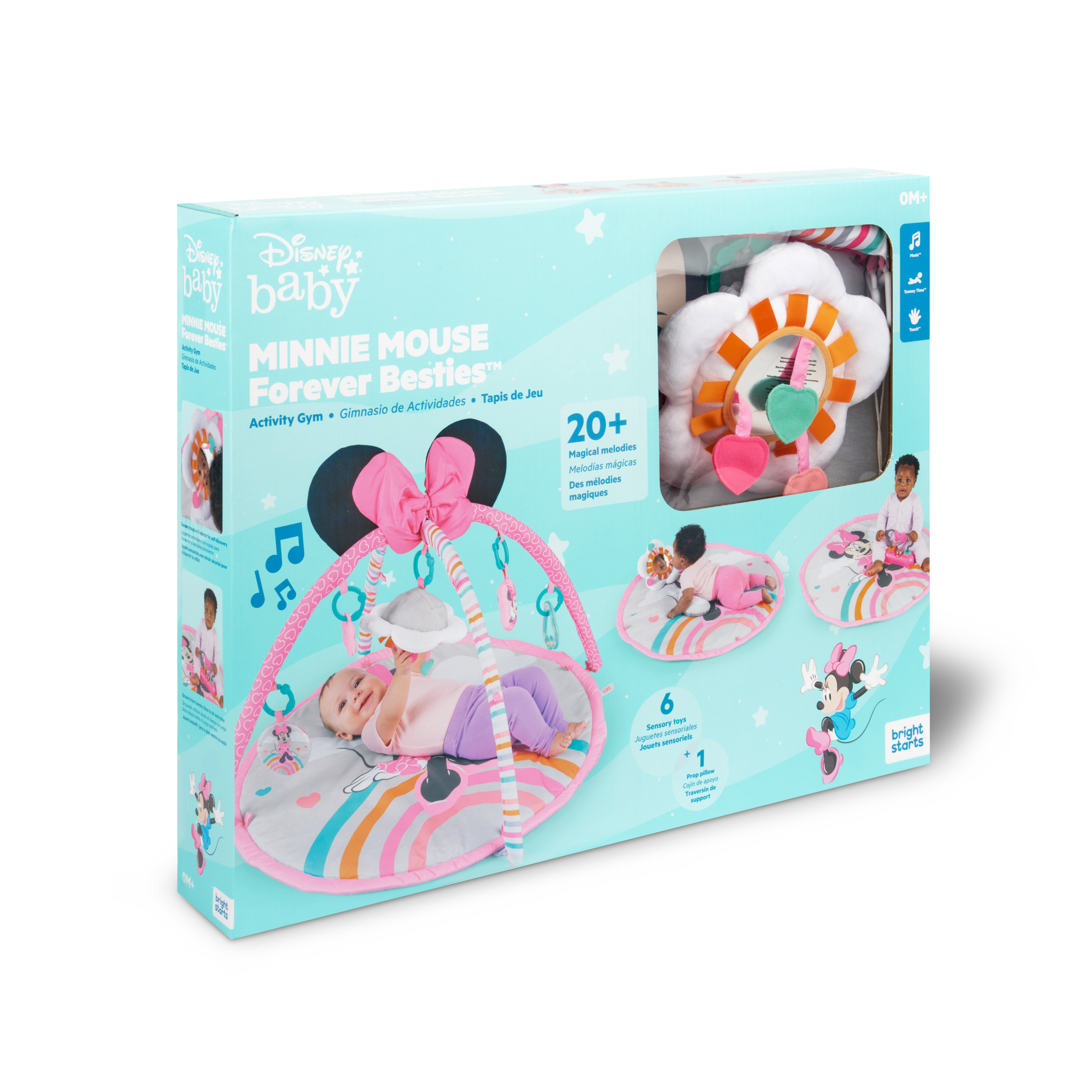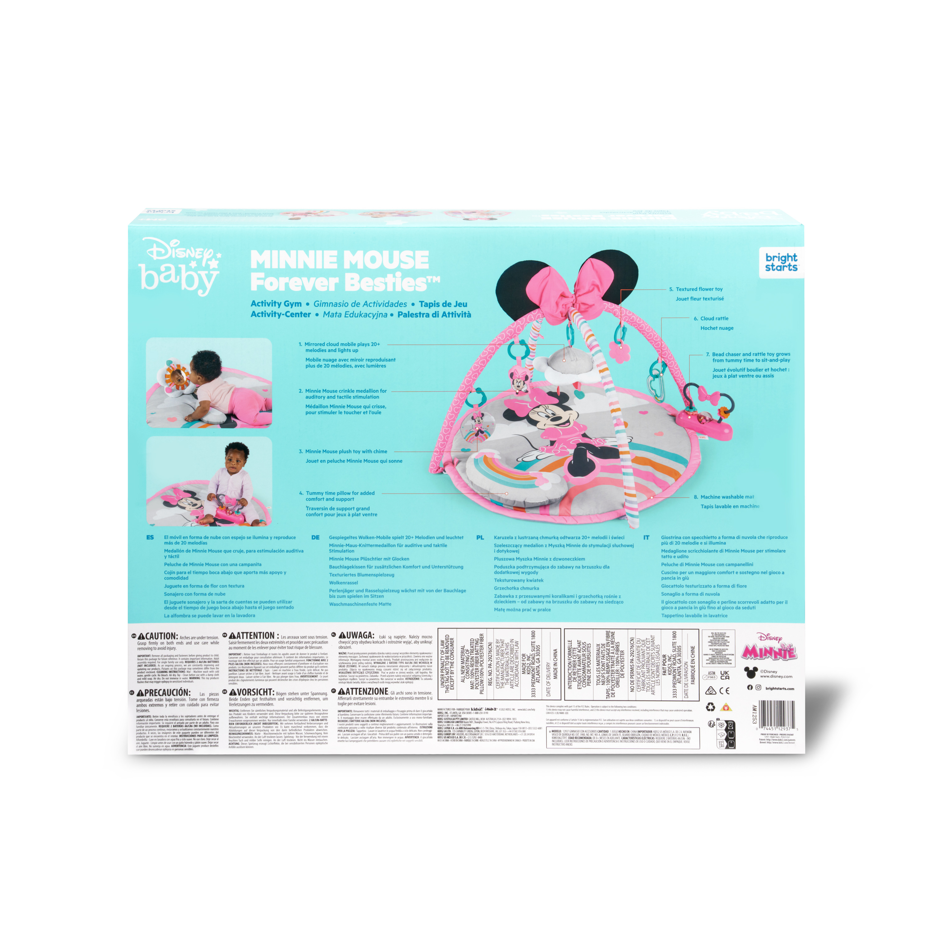 - 6个可拆卸玩具,包括追珠器和拨浪鼓玩具,皱纹奖章,米妮老鼠毛绒与风铃,纹理花玩具,和音乐手机;易于移动的玩具在健身架周围或随身携带