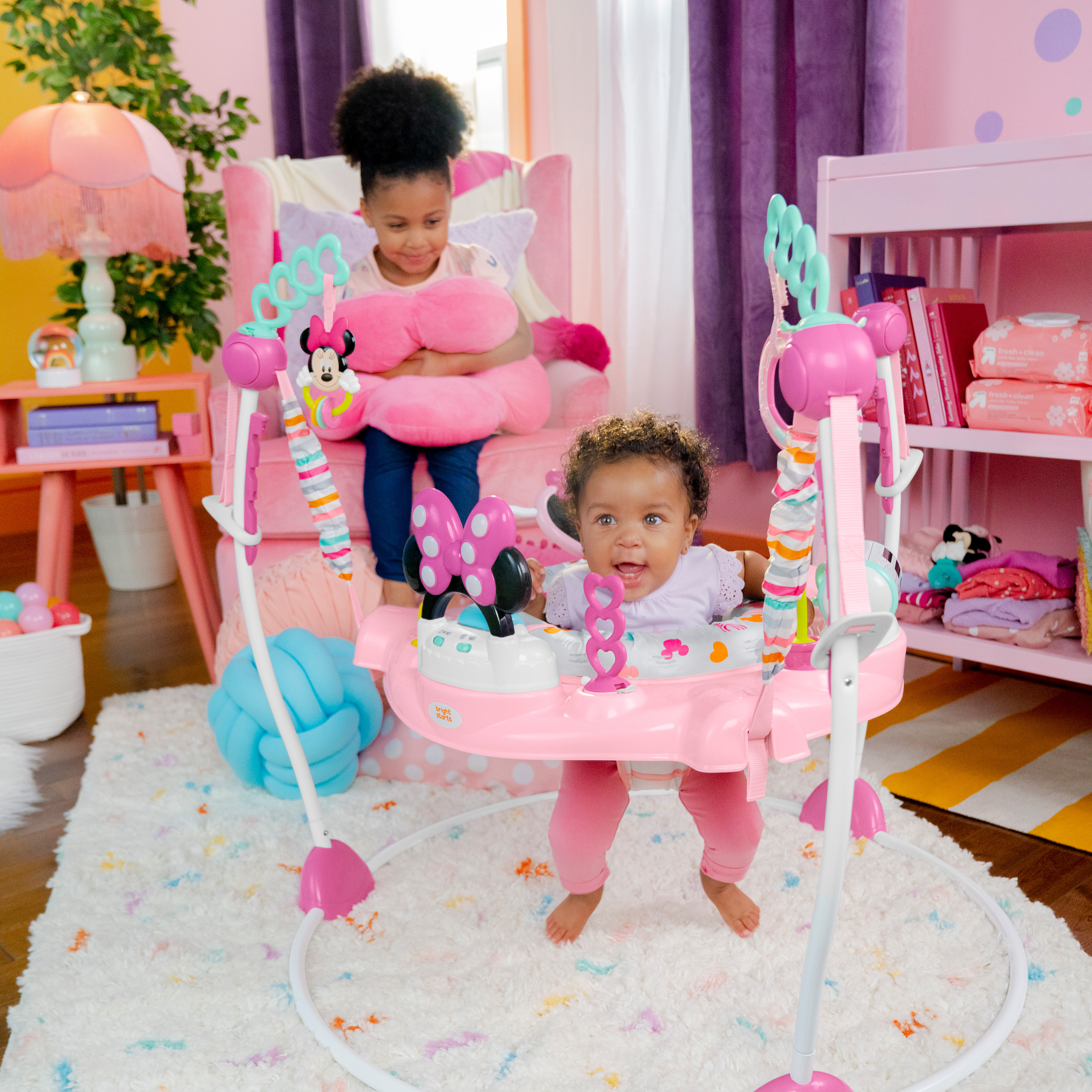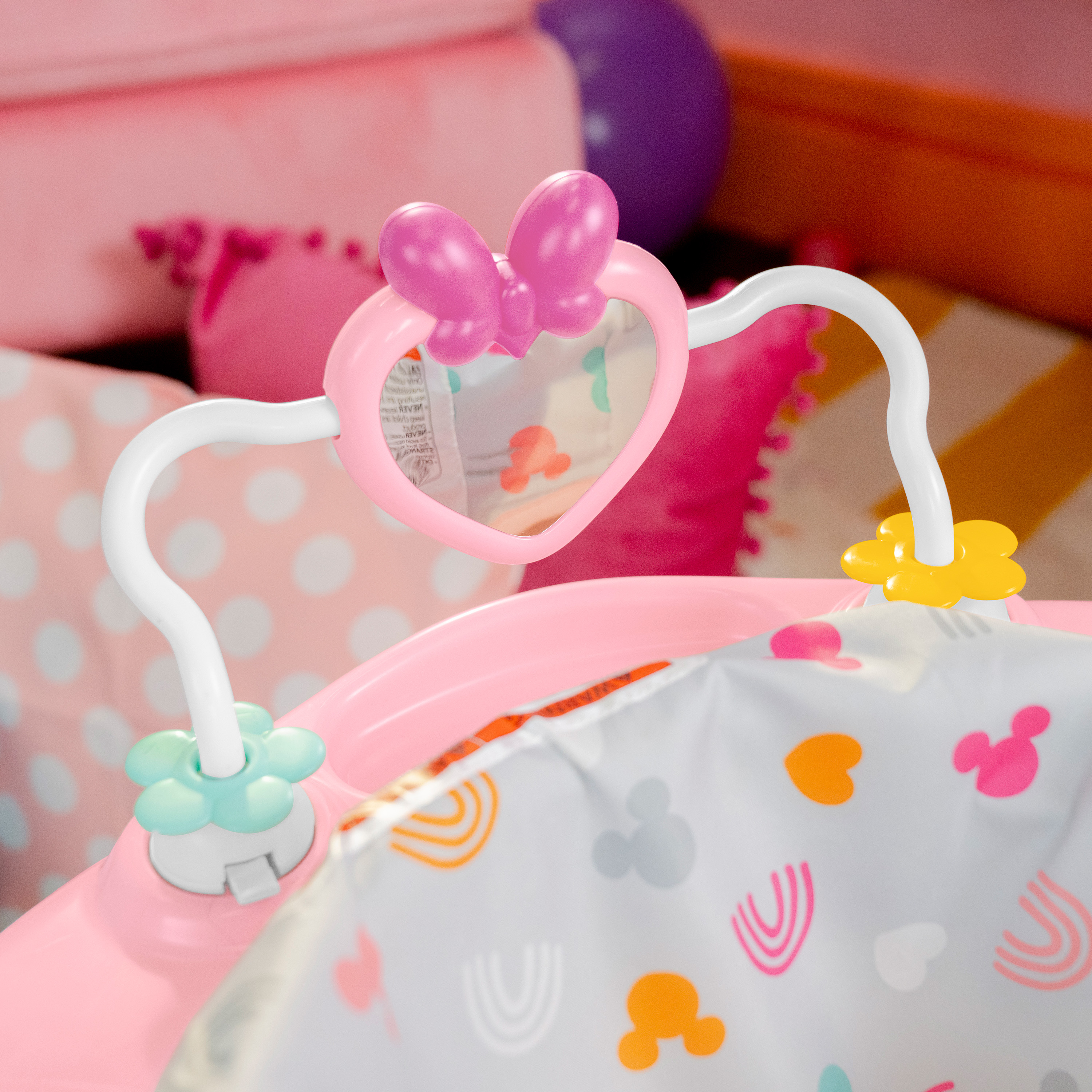 - Bright Starts Disney Baby Minnie Mouse 活动跳跳椅配有 10 个令人愉快的玩具和活动,包括米妮老鼠电子玩具站,悬挂的米妮玩具,心形镜子,带珠子的手摇鼓,旋转的花,心形拨浪鼓,手摇鼓风铃轮和用于连接更多喜爱玩具的心形柄。