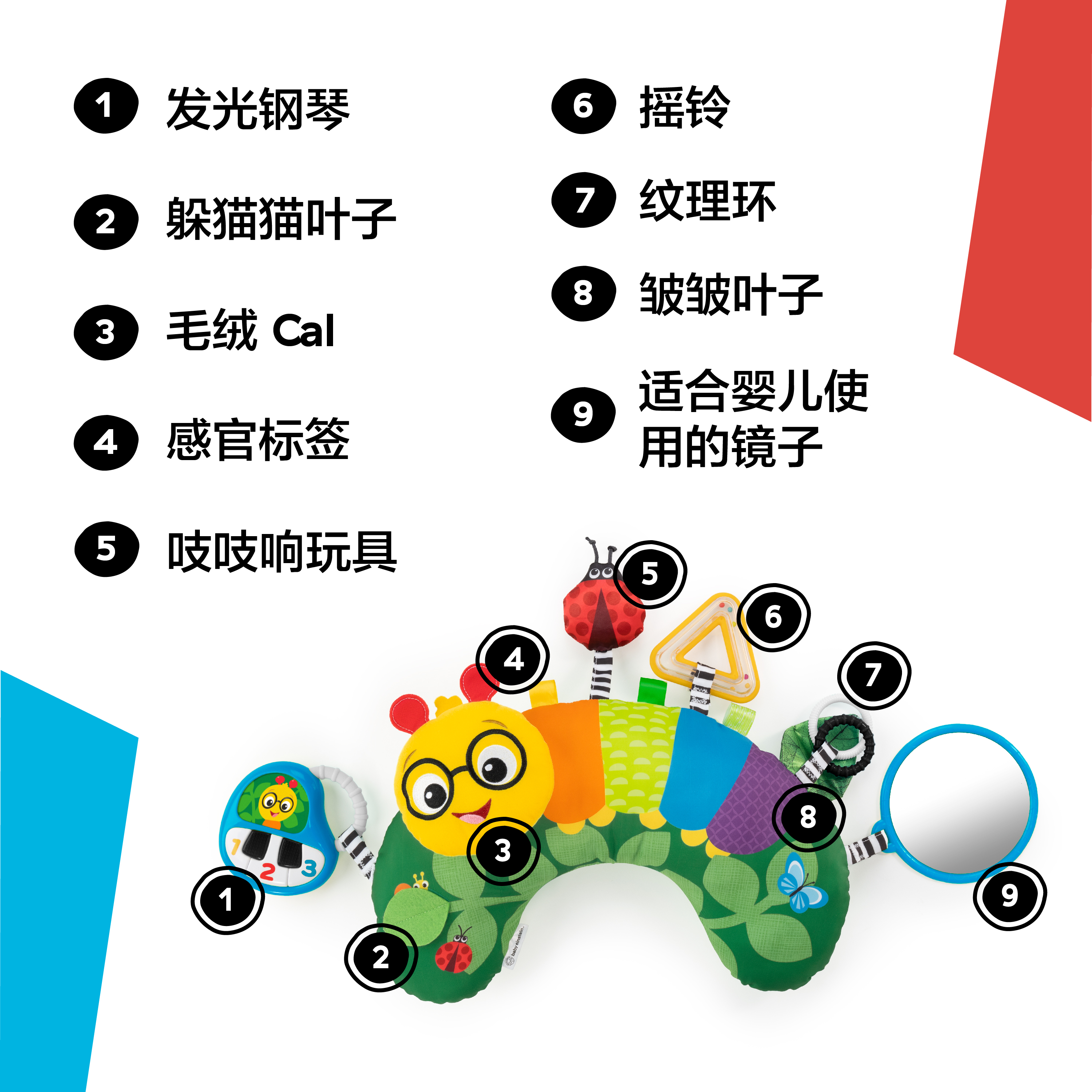 - 包括:瓢虫吱吱叫;共有20多个短语和旋律的发光钢琴;自我探索镜子;彩色标签;掀开叶子;缎面皱纹叶子;三角形摇铃;纹理环;毛绒Cal的脸。