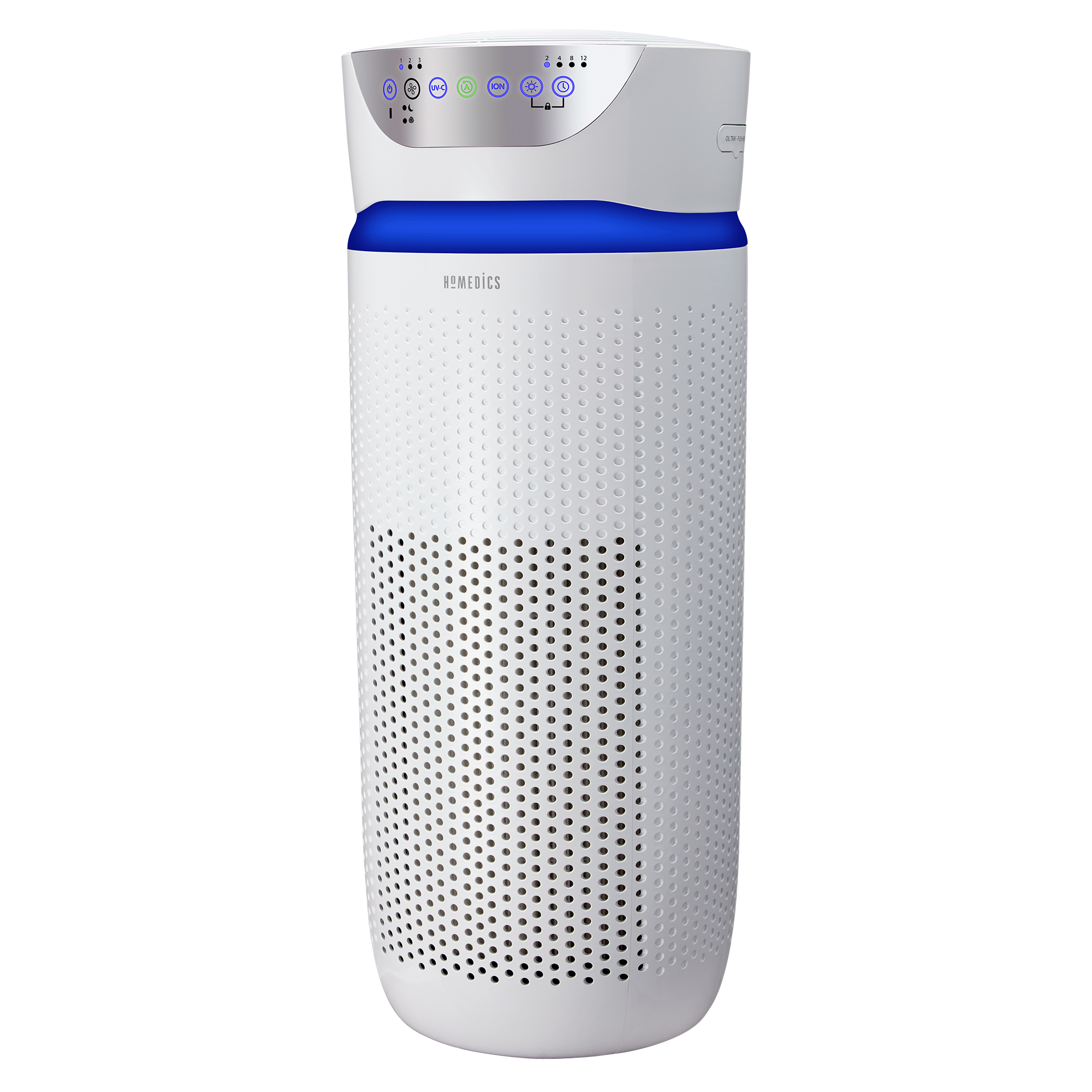 Product Code AP-T45WT-EU EAN Code : Individual Retail Pack 5010777153040 Product Weight Gross (kg) 6.7 Product Weight Nett (kg) 4.3 Product Width (cm) 25.2 Product Height (cm) 64.3 Product Depth (cm) 25.2 Retail Pack Depth (cm) 30 Retail Pack Height (cm) 68.8 Retail Pack Width (cm) 30 Retail Pack Weight (kg) 6.7 EAN Code : Individual Retail Pack 5010777153040 Packaging Paper Weight (kg) 1.01 Packaging Plastic Weight (kg) 0.025 Packaging Poylstyrene Weight (kg) 0.025 Total Plastic Packaging Weight (g) 26.0 Retail Product Title Homedics TotalClean 5-in-1 Deluxe Tower Air Purifier Long Description The HoMedics TotalClean 5-in-1 Deluxe Tower Air Purifier uses True HEPA filtration to catch and remove 99.9% of airborne allergens as little as 0.3 microns in size – which as you can probably guess, is super small. These pesky particles include pollen, dust, smoke, pet dander, mould spores and germs, so it’s safe to say your home will be cleaner and safer with an air purifying partner like this one. In case you’re wondering, HoMedics HEPA Air Purifier filters are removable, replaceable and easy to clean – just change them up every 12 months. The Carbon odour filter minimises the impact of household odours and VOCs on your home, while the UV-C light kills bacteria and viruses. Featuring an auto-off timer, night light, and 5 air flow speeds to choose from, the TotalClean 5-in-1 Deluxe Tower Air Purifier will even release negative ions into your home to properly purify it. In the evenings, simply activate the Whisper Quiet night mode and pour your go-to Ellia essential oil into the aroma tray to let the device do the work while you rest and recharge. All this makes the HoMedics TotalClean 5-in-1 Deluxe Tower Air Purifier a strong contender for the Best Air Purifier 2022 awards – if there is such a thing, that is. • Pre-filter to trap larger particles • 5 Air flow speeds (low, medium, high, turbo and auto) • 3 Whisper quiet speeds (Speed 1: 37.2dBA, Speed 2: 40.8dBA, Speed 3: 47.2dBA) • Auto mode/Particle sensor automatically adjusts the fan speed based on air quality • Auto-off timer up to 12 hours • Aroma tray with 3 HoMedics essential oil pads • Replace filter indicator • Remote control • Night light • 3-year guarantee • Mains powered • Designed for large rooms up to 151m²/H or 1,627ft²/H • Dimensions: 25.2cm x 24.2cm x 64.3cm Short Description When it comes to a clean home, we do everything we can to remove dirt and dust. But what about clean air? The HoMedics Total Clean 5-in-1 Deluxe Tower Air Purifier uses replaceable HEPA air filters to remove up to 99.97% of airborne allergens, keeping your home free of pollen, dust particles, smoke and pet dander. With a carbon odour filter, powerful UV-C light, 5 air flow speeds and Whisper Quiet night mode, this air purifier will keep those invisible invaders at bay. Feature 1 360⁰ True HEPA Filtration Removes up to 99.97% of airborne allergens such as pollen, dust, smoke and pet dander Feature 2 Carbon Odour Filter Reduces unwanted household odours and VOCs Feature 3 Powerful UV-C Light Eliminates germs, bacteria and viruses Feature 4 Whisper Quiet Night Mode Works overnight while you sleep Feature 5 Optional Ioniser Releases negative ions into the air to boost the purification process