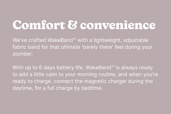 | Short Description | Rise and shine on your schedule with Homedics WakeBand™. Using whisper-quiet, gentle vibrations, WakeBand™ is a silent alarm created to wake you - and only you. Simple to set up and easy to pair, control your WakeBand™ with our free app (compatible with Apple & Android devices) and set your alarm just as you would on your smartphone alarm clock. Choose from 9 vibration intensities and 9 alarm modes for a customised setting that’s powerful enough to wake you, without disturbing your partner, newborn baby, pets, or flatmates. WakeBand™ is also an ideal alternative to a standard alarm clock for those who are deaf or hard of hearing. Crafted with a premium, lightweight fabric band for all-night comfort, WakeBand™ is designed to give you that ultimate 'barely there' feel as you drift off. Including a magnetic charger, plug in during the daytime for a full charge by bedtime with up to 4 days battery life. Welcome to the kinder way to rise and shine with WakeBand™. |