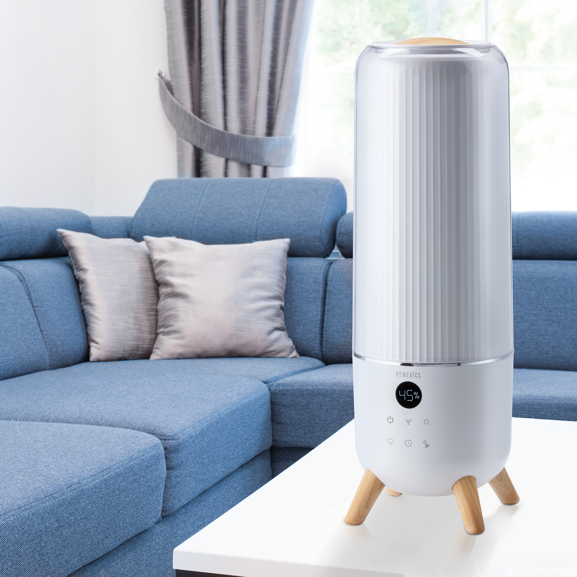 Product Code UHE-CMTF91-EU EAN Code : Individual Retail Pack 5010777156690 Product Weight Gross (kg) 3.79 Product Weight Nett (kg) 2.4 Product Width (cm) 16 Product Height (cm) 53 Product Depth (cm) 16 Retail Pack Depth (cm) 23.6 Retail Pack Height (cm) 49 Retail Pack Width (cm) 25.2 Retail Pack Weight (kg) 3.79 EAN Code : Individual Retail Pack 5010777156690 Packaging Paper Weight (kg) 1.2 Packaging Plastic Weight (kg) 0.01 Packaging Poylstyrene Weight (kg) 0 Total Plastic Packaging Weight (g) 48.0 Retail Product Title Homedics TotalComfort Deluxe Ultrasonic Humidifier Long Description • Digital display • 3 mist settings (low, medium and high) • Auto-off timer for up to 12 hours • Night light • Auto shutoff feature • Clean transducer/ultrasonic membrane indicator light • Clean tank technology • Essential oil tray with three pads • Demineralisation cartridge included • 2-year guarantee • Mains powered • Designed for large rooms up to 426ft2 or 39.5m2 • Dimensions: 18cm x 18cm x 53.2cm Take control of moisture levels in your home by way of the Homedics TotalComfort Deluxe Ultrasonic Humidifier. With three ultrasonic cool mist settings and a 360⁰ rotating nozzle, this humidifier takes its role as seriously as you do. A Healthier Home Prevent the symptoms associated with asthma, allergies and colds by setting the programmable humidistat to the humidity that suits you (between 35% and 55%) in 5% increments. Relax and Unwind A sleek addition to the modern home, the TotalComfort Deluxe Ultrasonic Humidifier features a digital display, auto-off timer, night light and an essential oil tray. It also boasts 70 hours of runtime when you select the low mist setting. Easy to Manage Ideal for large bedrooms and living spaces, this humidifier has a top-fill water tank that’s easy to both clean and refill – meaning minimal maintenance on your part. With an auto shutoff feature, it will switch itself off when out of water and relies on clean tank technology to protect it from mould and mildew. Just watch out for the LED indicator that signals it’s time to clean the transducer/ultrasonic membrane. Don’t worry, it’s very straightforward to do and everything is explained in the enclosed instructions. Oh, and one more thing. The TotalComfort Deluxe Ultrasonic Humidifier comes a demineralisation cartridge. If you’re looking for the best home humidifier, we think you’re in the right place. Short Description Protect yourself from the effects of dry skin, colds and allergies with the Homedics TotalComfort Deluxe Ultrasonic Humidifier. With a cool mist, 360⁰ rotating nozzle and programmable humidistat, this humidifier empowers you to control the moisture levels in your home – even when you’re not there. With its sleek, contemporary design, this humidifier features an auto-off timer, 70 hours of runtime (when using the low mist setting) and a 5.6 litre tank, the TotalComfort Deluxe Ultrasonic Humidifier will do the work so you don’t have to. Feature 1 Ultrasonic Technology Converts water into a fine mist by way of high-frequency technology before dispersing it into the air Feature 2 360⁰ Rotating Nozzle Adjusts the direction of mist quickly and easily Feature 3 Programmable Humidistat Allows you to adjust the humidity to your preferred level Feature 4 Easy-Clean Top Fill Tank Takes 5.6 litres of water Feature 5 Auto-Off Timer Sets timer for up to 12 hours