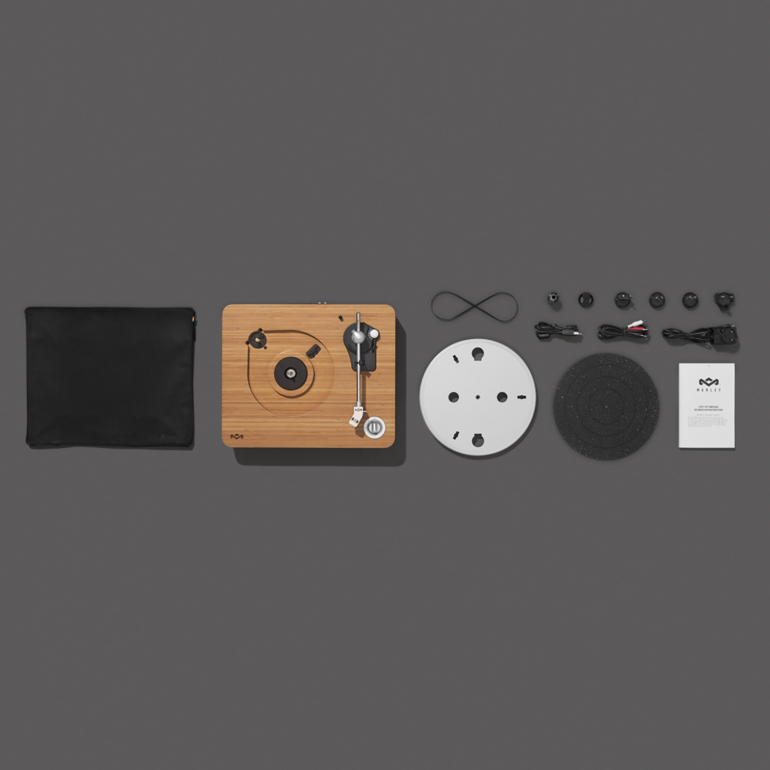 Product Code EM-JT000-SB Retail Product Title Stir it Up Turntable Short Description Create a classic sound that reveals the true depth of your favourite music. The streamlined design of the Stir It Up Turntable features natural bamboo, REGRIND™ silicone, REWIND™ fabric, recycled plastic, and recyclable aluminium. The Stir It Up also comes with a built-in pre-amp that's compatible with any House of Marley speaker or in-home receiver for easy connection. Long Description Immerse yourself in a classic sound that reveals the true depth of your favourite music. The streamlined design of the Stir It Up Turntable features natural bamboo, REGRIND™ silicone, REWIND™ fabric, recycled plastic and recyclable aluminium. The Stir It Up Turntable also comes with a built-in pre-amp that's compatible with any House of Marley speaker or in-home receiver for easy connection. • Solid Bamboo-crafted plinth • Replaceable Audio-Technica MM Cartridge • USB to PC recording • Auto start/stop belt drive • Built- in Pre-Amp with off switch for phono out • 3.5 mm Aux Out • RCA (Phono/Line) • 45 and 33 RPM speeds Feature 1 33/45 RPM Play any 33 or 45 RPM records while the anti-skate control and the auto start/stop help to protect your vinyl from damage. The USB port and included cable allow you to convert your records to a digital format. Feature 2 Built-in Pre-Amp The Stir It Up Turntable offers a modular Audio Technica cartridge and built-in pre-amp that delivers premium audio quality and lets you enjoy your every sonic detail of your favorite vinyl records. If you prefer to use your own pre-amp, simply switch the internal amp off to connect one of your choice. Feature 3 USB to PC Recording The Stir It Up Turntable has a USB to PC or Mac recording feature, so you can record and digitise your music on vinyl. Connect the record player to your computer via the USB connection on the player to save your music as a digital file, before storing the file on your laptop, phone or any other portable media device so you can listen to music from your vinyl collection on the go. Feature 4 Crafted From Sustainable Materials The Stir It Up Turntable is crafted with bamboo, REWIND™ Fabric and REGRIND™ Silicone. Marley’s signature REWIND™ fabric is weaved from recycled materials to create a durable, high-quality product. It is constructed from a distinctive blend of 30% reclaimed organic cotton, 30% reclaimed hemp and 40% recycled PET. Feature 5 REWIND™ Fabric Dust Cover Once you've finished listening to your vinyl collection, use the included REWIND™ Fabric dust cover to keep the platter and stylus from getting dusty. Feature 6 Belt Drive Providing rotational stability and quality sound with auto-pitch and auto-start feature.