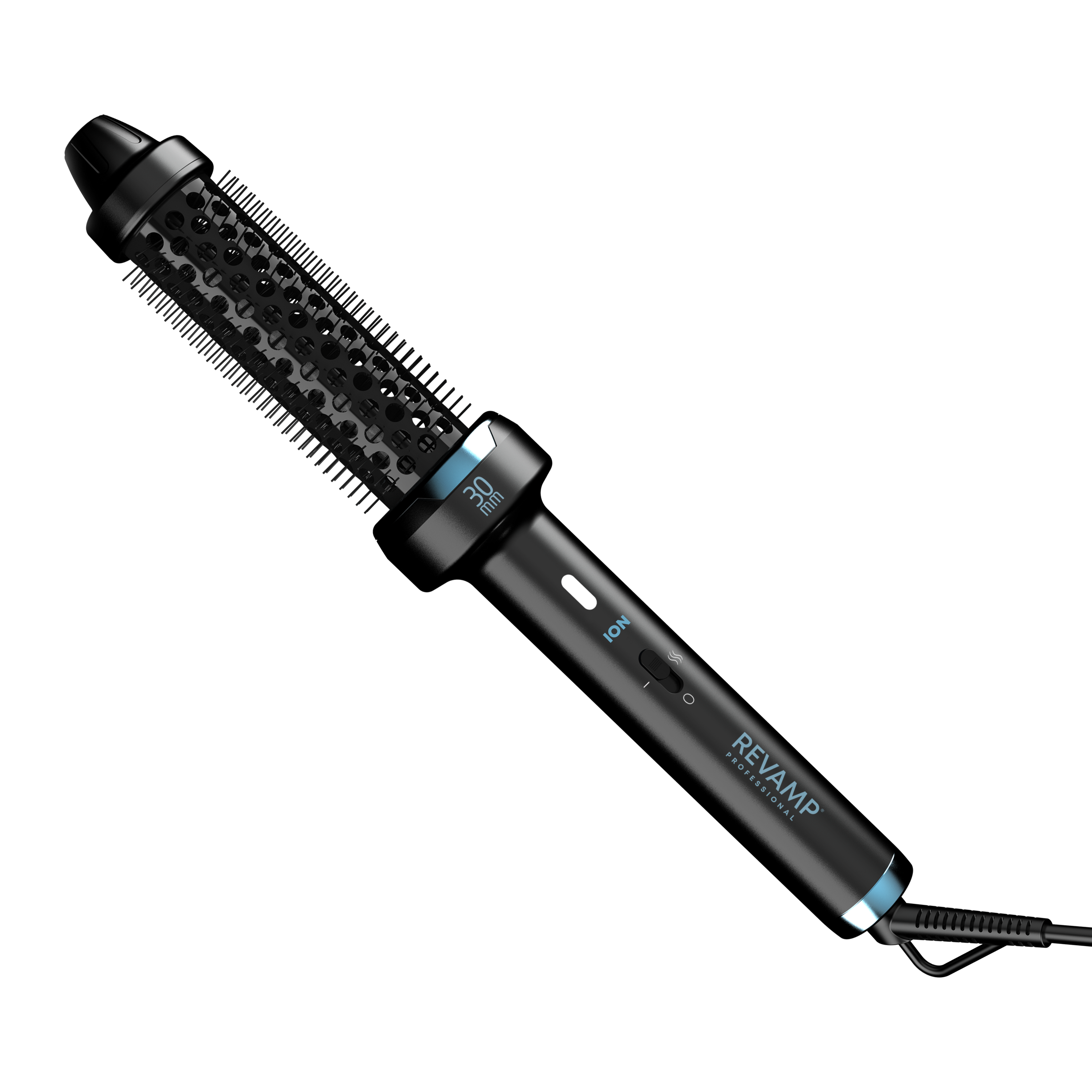 EAN Code : Individual Retail Pack 5010777164183 Product Width (cm) 30 Product Depth (cm) 5 Product Height (cm) 5 Outer Carton Weight (kg) 3.49 Outer Carton Width (cm) 42 Outer Carton Depth (cm) 37 Outer Carton Height (cm) 14.5 MAINS Power Mains Main Battery Quantity N/A Retail Product Title REVAMP Ceramic 30mm Hot Brush Short Retail Product Title (60) REVAMP Ceramic 30mm Hot Brush Short Description Designed to create volume, curls and waves while boosting body and shape, the REVAMP Ceramic 30mm Hot Brush features a ceramic barrel, ultra-fast heat technology (reaching up to 180°C) and an ionic jet for conditioning and shine. The 5mm bristles create enhanced volume from the root (without the risk of snagging, pulling or tangling) while the Progloss™ oils (keratin, argan, and coconut) ensure smooth, high-shine results. Lightweight, ergonomic & with a 3-metre salon-swivel cable, it's ideal for use on short, long, fine or coarse hair types. Long Description The REVAMP Ceramic 30mm Hot Brush is designed to give you a quicker, easier way to create curls and waves. Engineered to bring both body and bounce, the 30mm ceramic brush barrel offers super-fast heat technology and reaches the optimal temperature of 180°C in seconds. The flexible 5mm nylon bristles ensure that every strand of hair is lifted from the root (without risk of snagging, pulling or tangling), leaving you with added volume that holds throughout the day. With an innovative ionic jet that delivers up to one million negative ions per cubic centimetre, this hot brush is all about a volumised, flawless finish with added body and bounce. The best part? It requires minimal effort on your part. Infused with REVAMP’s signature Progloss™ super smooth keratin, argan, and coconut oils, it ensures your hair is smooth with a high-shine finish every time. For added comfort, this hot brush is lightweight so you can look forward to fuss-free styling (the 3-metre salon swivel cable helps here too). With a clever cool tip, this hot brush enables you to create gentle tension as you brush through each section for longer-lasting lift. While this brush is suitable for all hair types and works with all textures and lengths – it’s a firm favourite among those looking for a hot brush for short hair. Feature 1 30mm ceramic round hot brush designed to create volume, body, curls and waves Feature 2 Ultra-fast heat technology for quick and easy styling (temperature: 180°C) Feature 3 Innovative ionic jet for enhanced conditioning (up to 1 million negative ions/cm3) and kinder styling Feature 4 Flexible 5mm nylon bristles for enhanced root lift and volume Feature 5 Ceramic brush barrel infused with Progloss™ super smooth keratin, argan and coconut oils Feature 6 Ergonomic and lightweight Feature 7 3-metre salon swivel cable Feature 8 Suitable for all hair types
